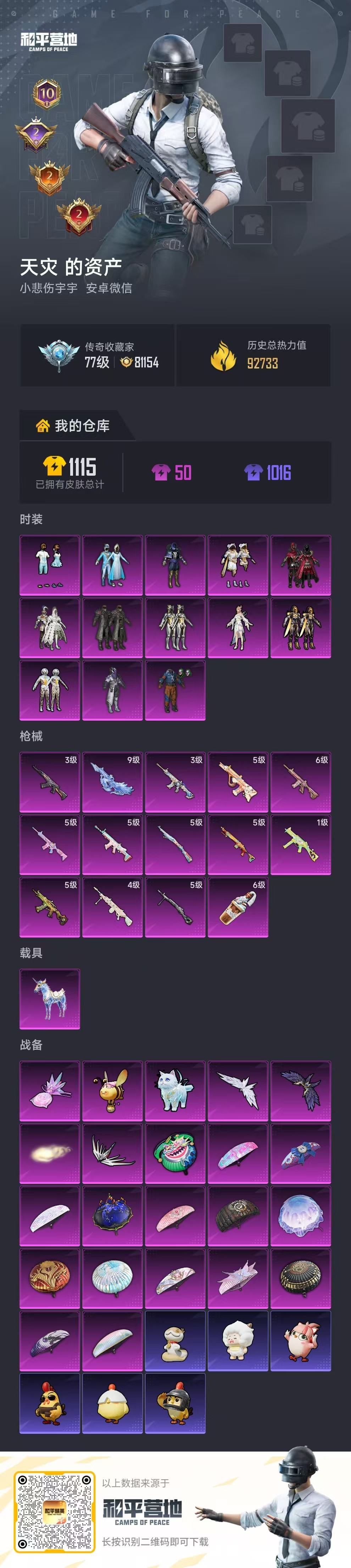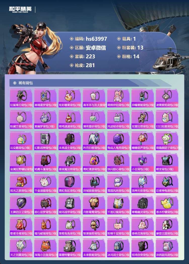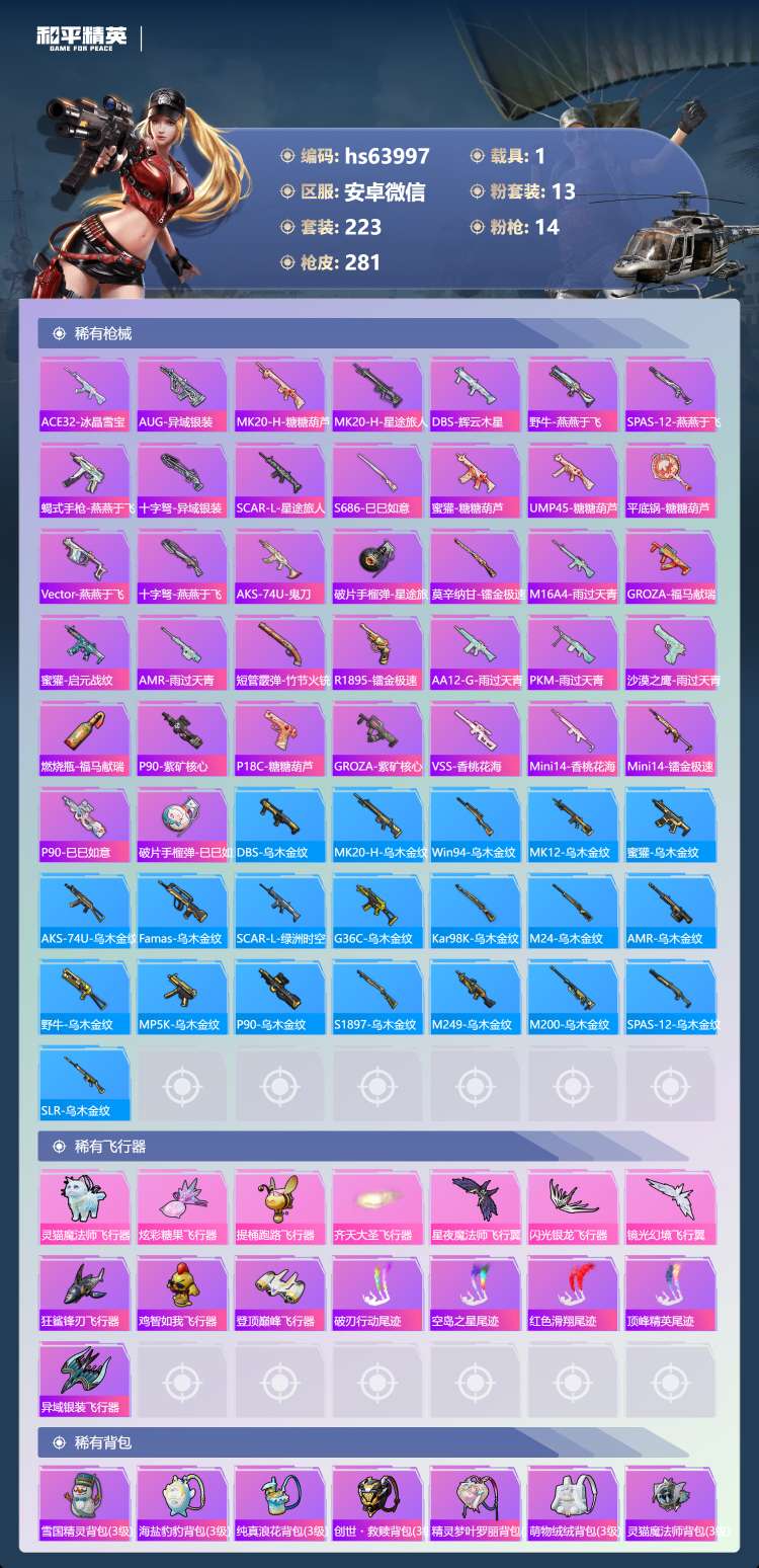 hs63997 安卓微-10王牌印记-有战神框-13粉装-14特效枪-1载具-92733热力值-2