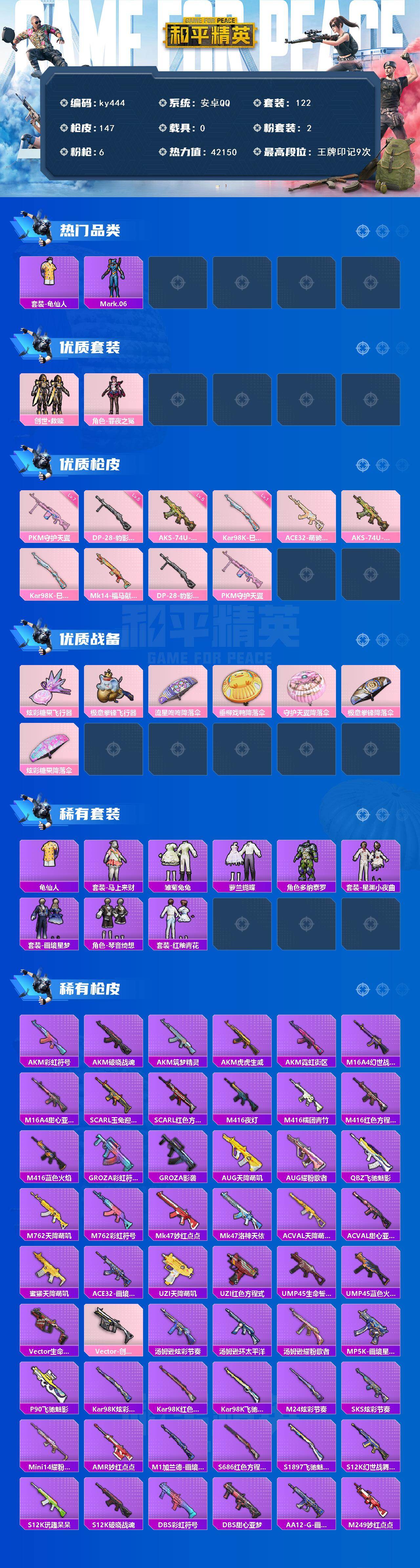 安卓 手Q-2粉装-6特效枪-0载具-2粉色飞行器-42150热力值-9王牌印记-122套装-147枪皮