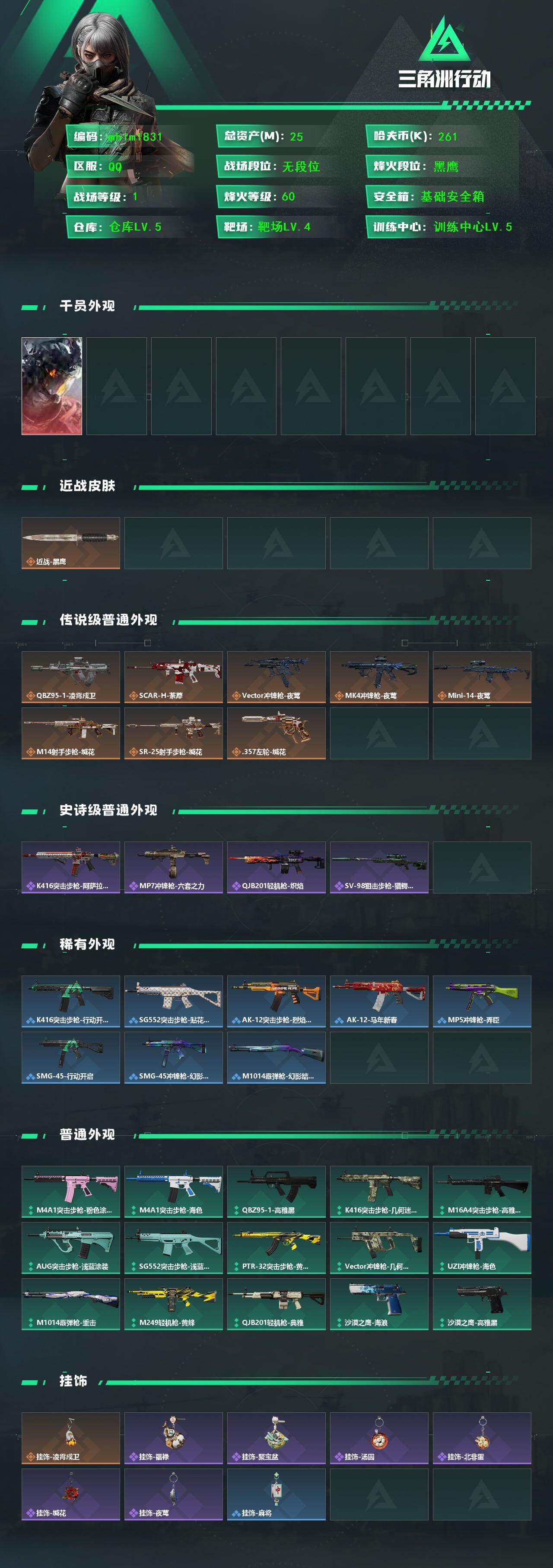 25m总资产-261k哈伏币-60烽火等级-黑鹰-1战场等级-无军衔