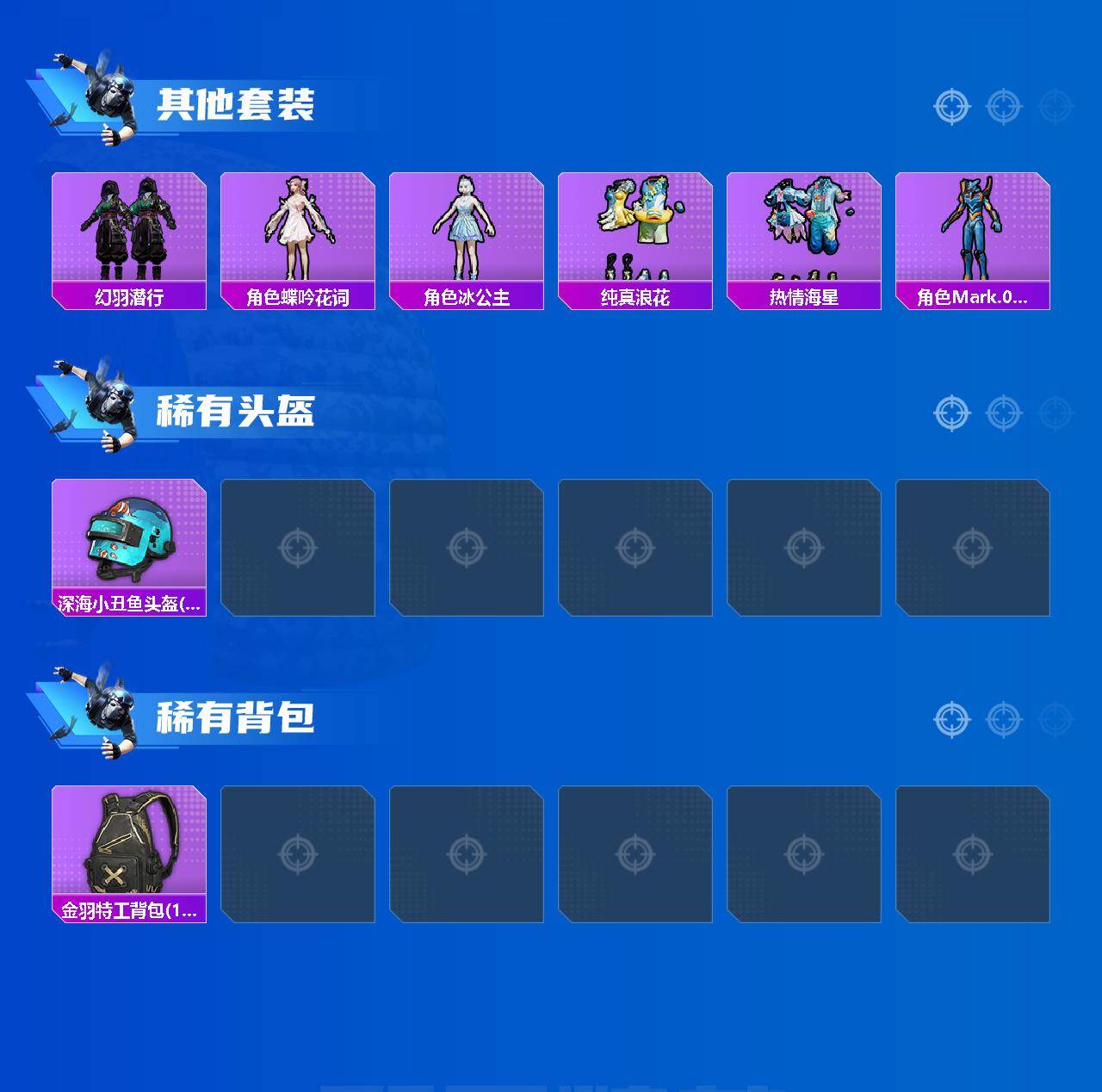【热门品类】:套装-浪漫天命,套装-小丑鱼,角色-军刀雅典娜,套装-龟仙人,套装-暗影哥特,角色-Mark.06