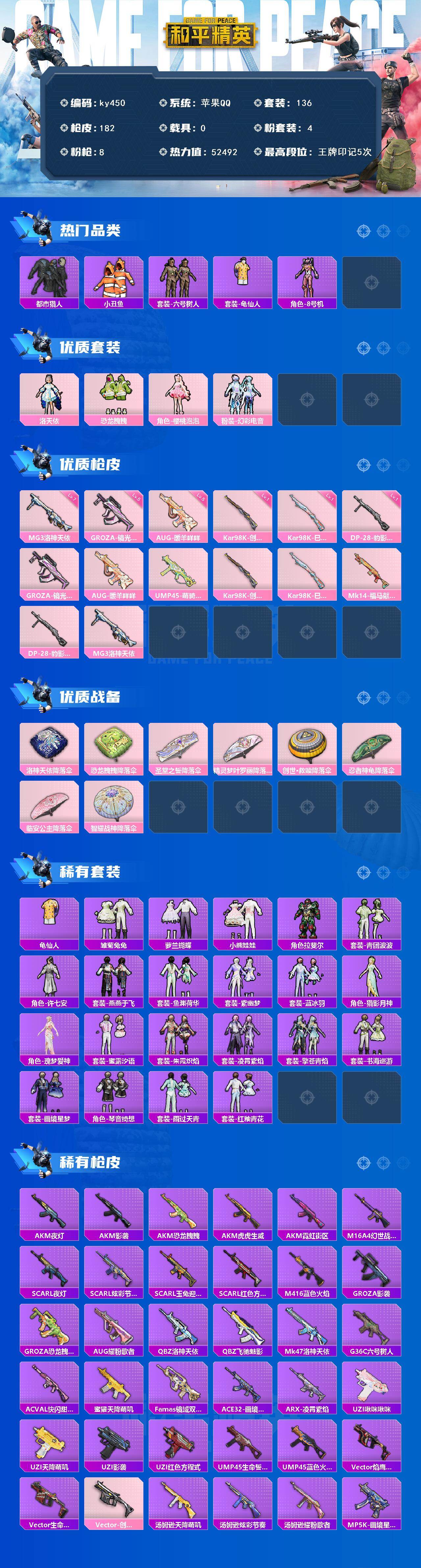 苹果 手Q-4粉装-8特效枪-0载具-0粉色飞行器-52492热力值-5王牌印记-136套装-182枪皮