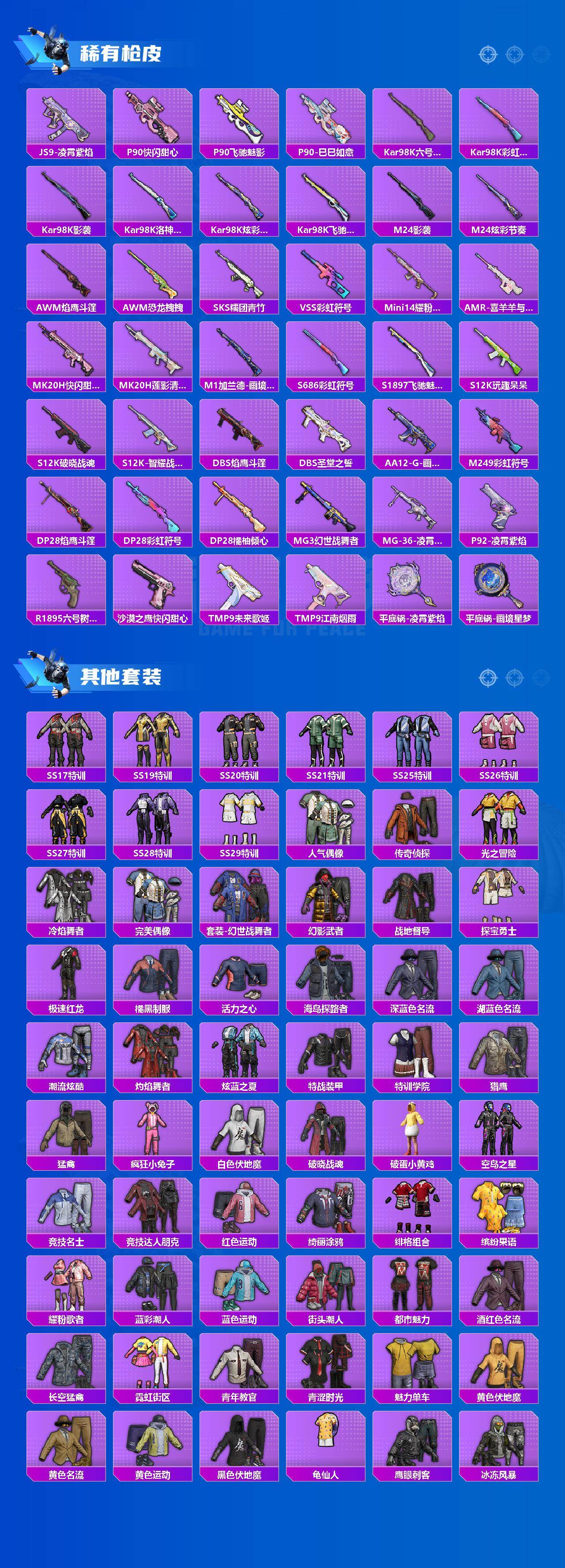 【粉色枪皮等级】:GROZA-镜光银凌(五级),AUG-暖羊咩咩(五级),Kar98K-创世·救赎(一级),Kar98K-巳巳如意(一级),DP-28-豹影疾电(一级),MG3-洛神天依(七级)