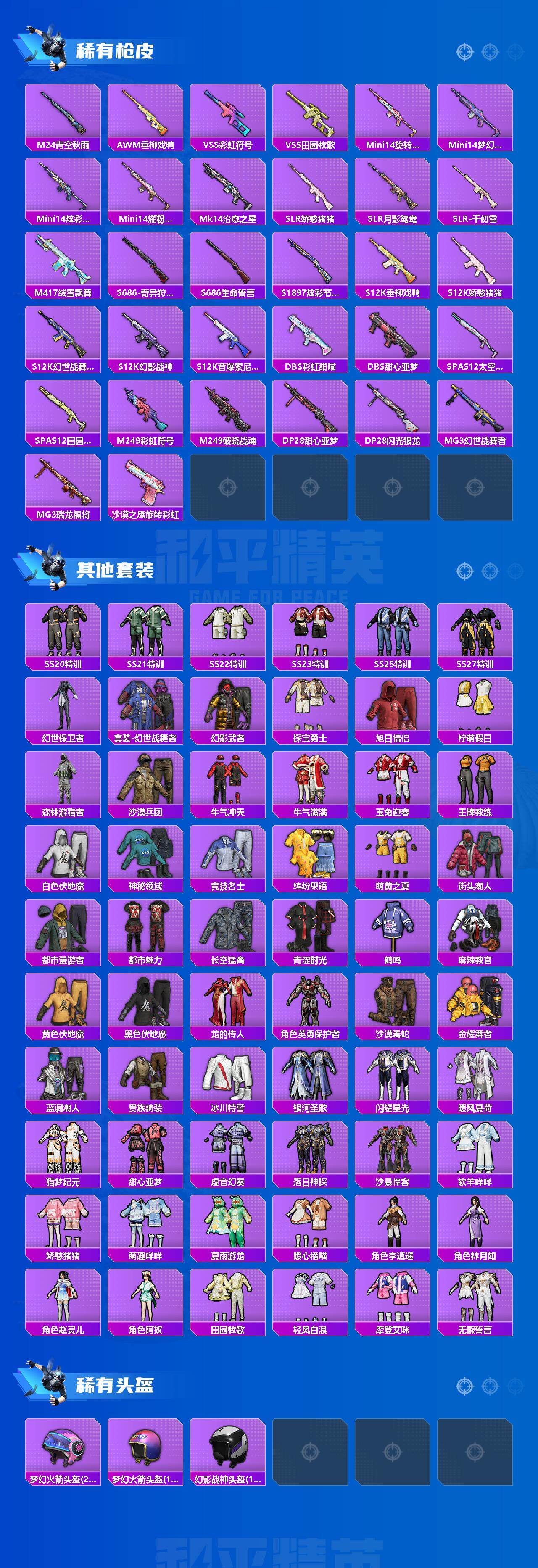 【粉色枪皮等级】:M416-五爪金龙(五级),GROZA-旋转彩虹(四级),Vector-环太平洋(四级),AKS-74U-森灵之息(四级),Kar98K-巳巳如意(五级),DP-28-豹影