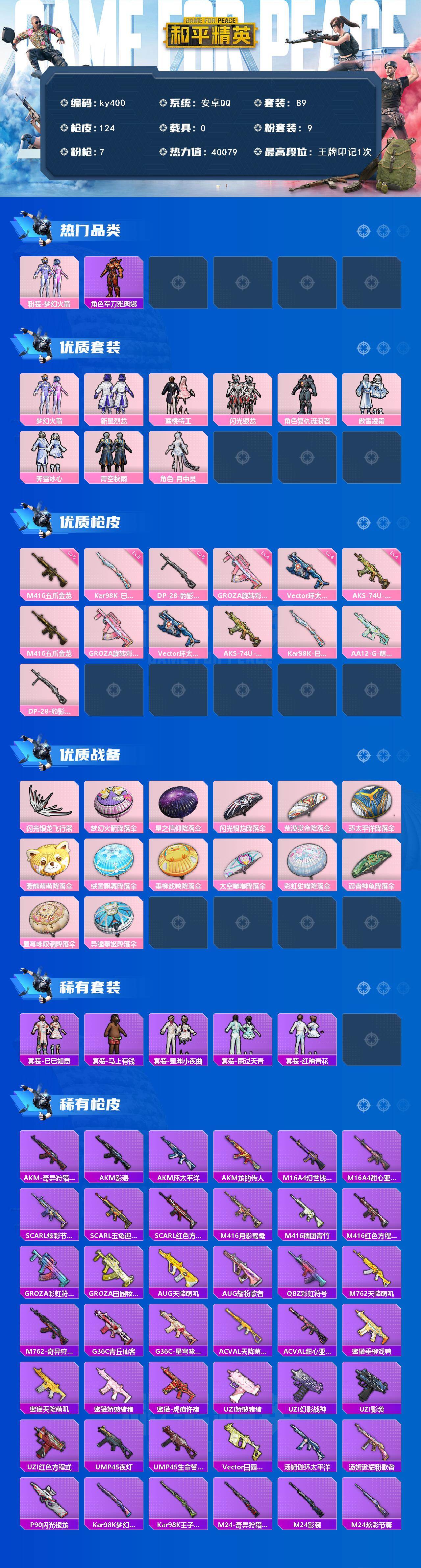 安卓 手Q-9粉装-7特效枪-0载具-1粉色飞行器-40079热力值-1王牌印记-89套装-124枪皮