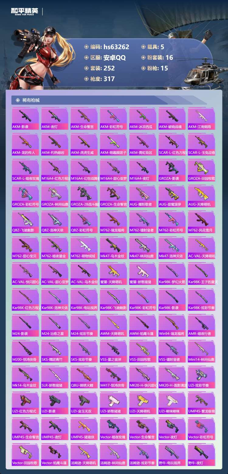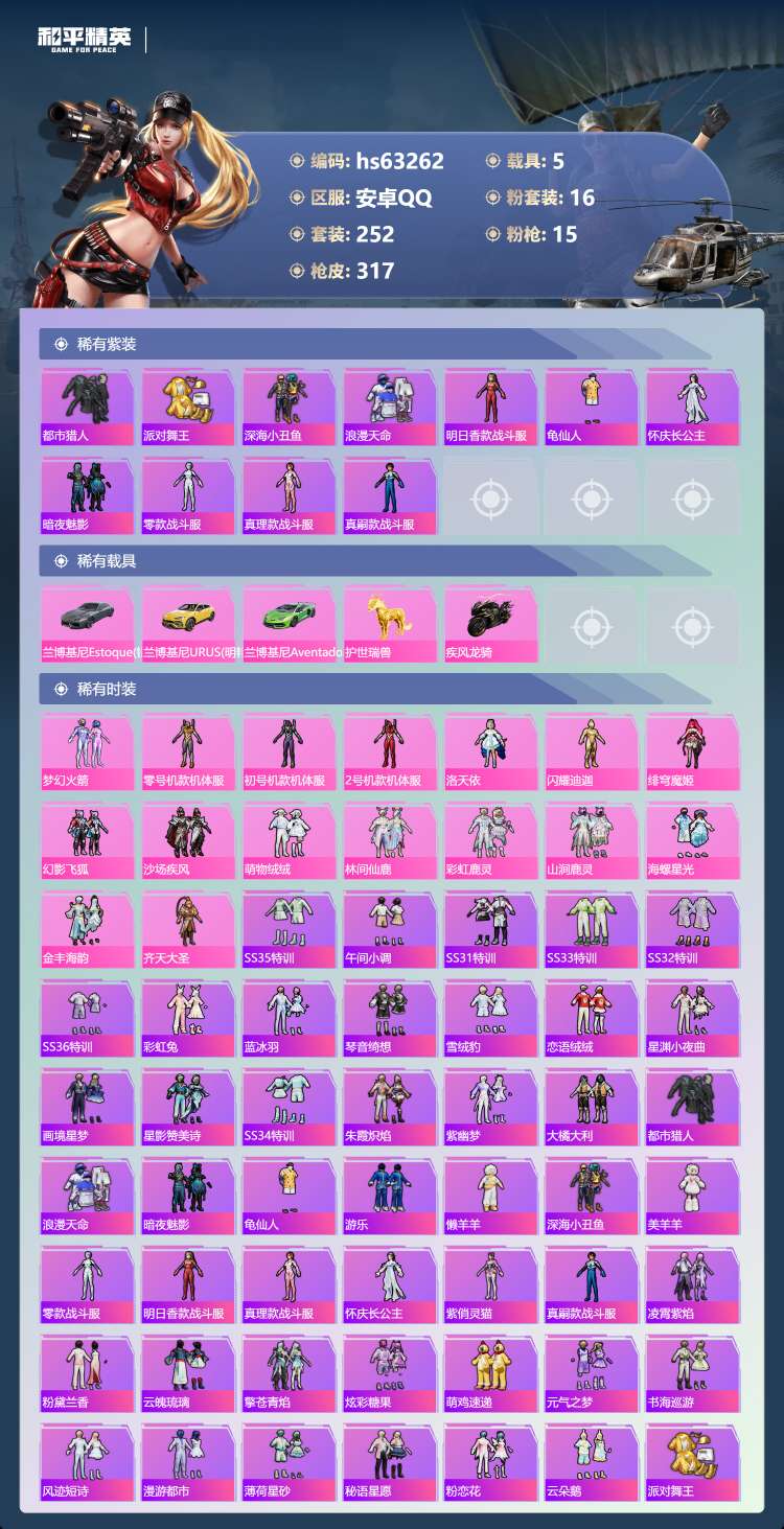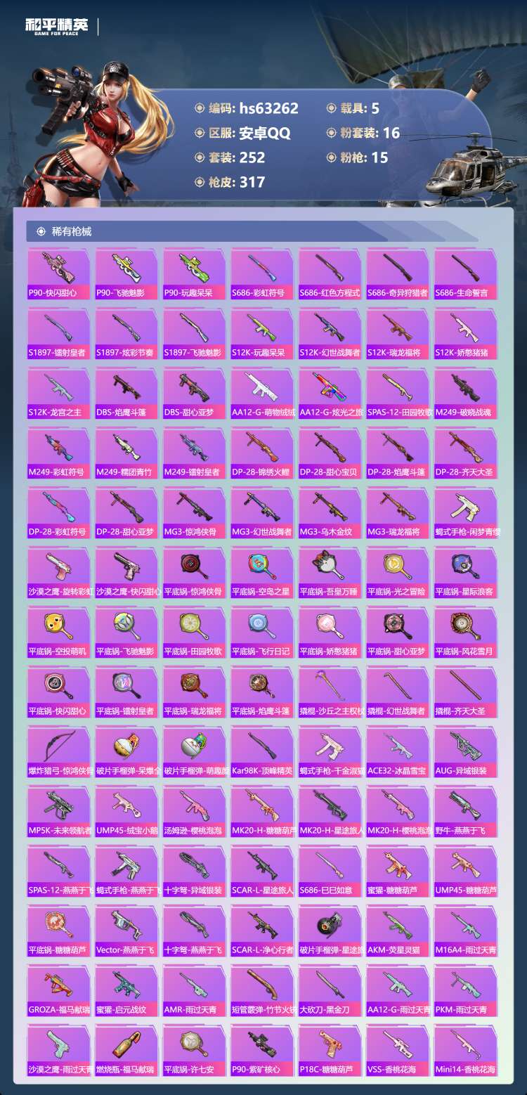 hs63262 安卓手Q-18王牌印记-16粉装-15特效枪-5载具-113597热力值-252套装
