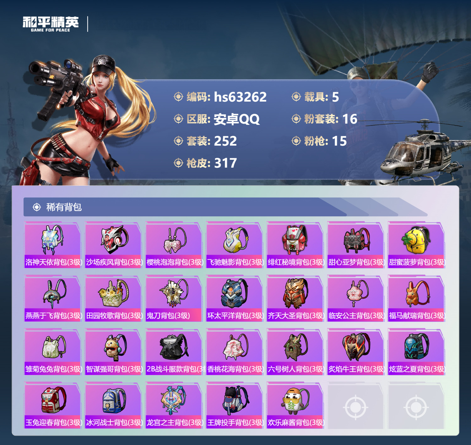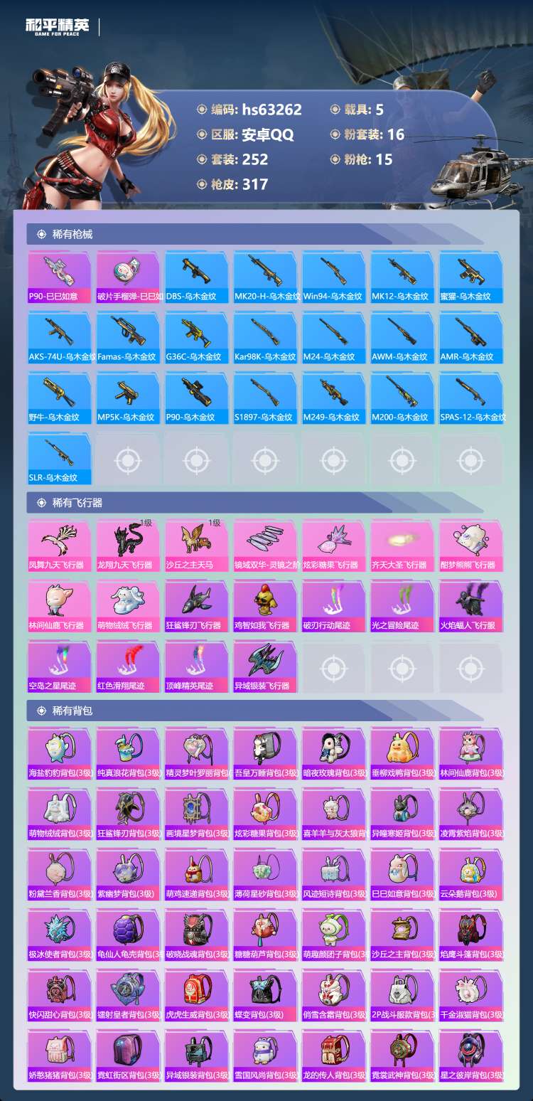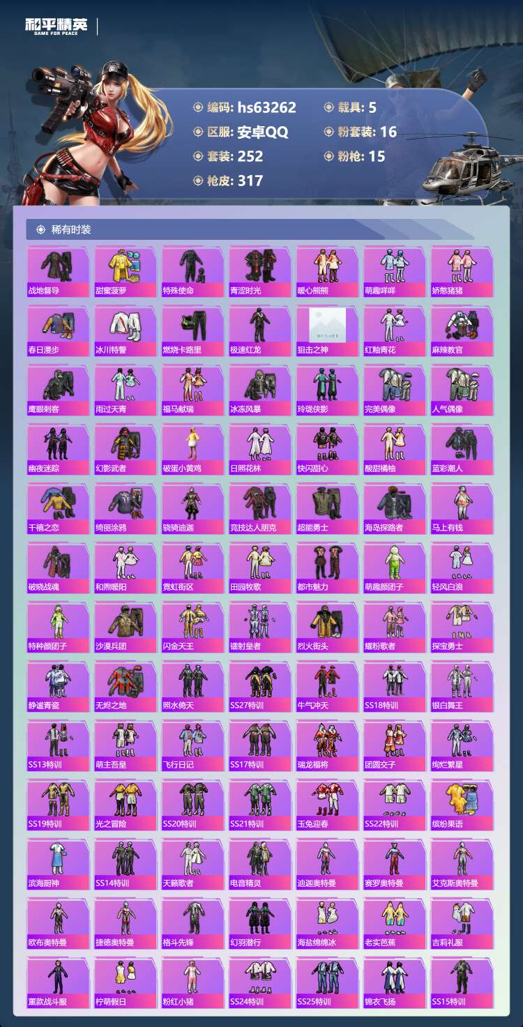 hs63262 安卓手Q-18王牌印记-16粉装-15特效枪-5载具-113597热力值-252套装