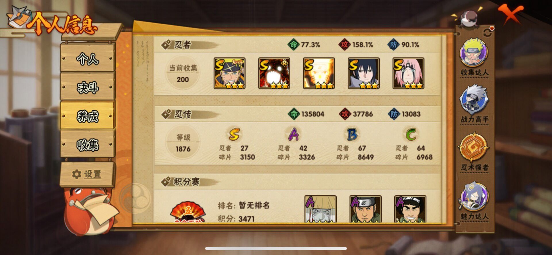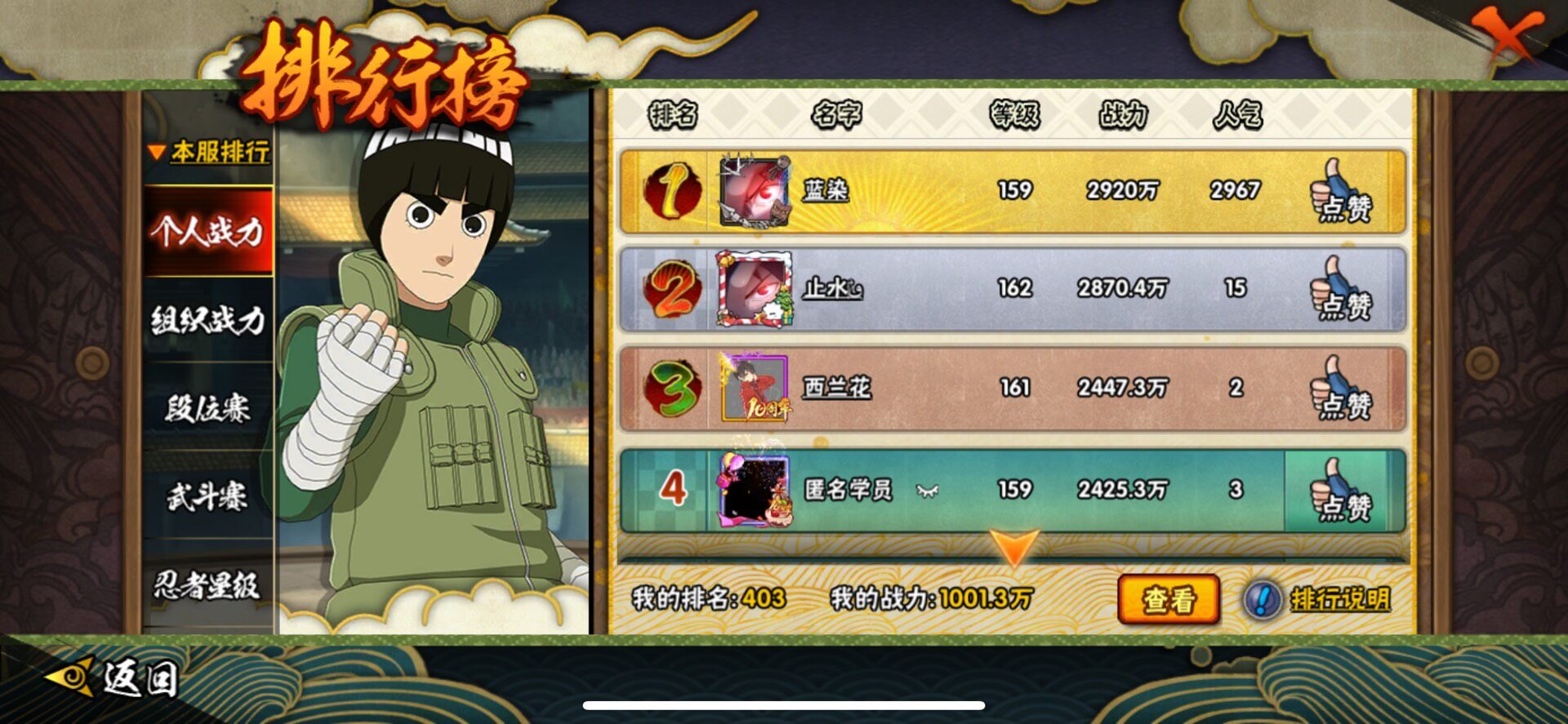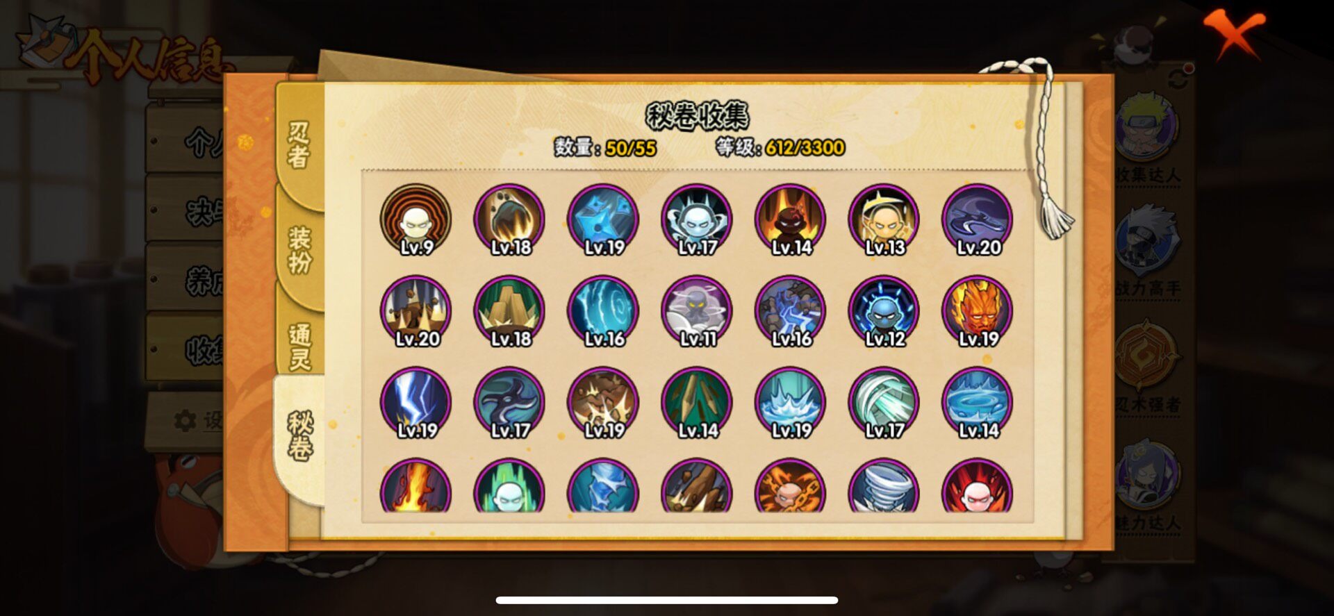 【S级忍者】宇智波止水「须佐能乎」,艾「忍界大战」,大筒木桃式,宇智波斑「秽土转生·解」,千手柱间·木叶创立,宇智波佐助「永恒万花筒」,神秘面具男 「红夜之刃」,春野樱 「忍界大战」,大筒木金式「博人传」,漩涡鸣人 「九喇嘛连结」,大野木 「忍界大战」,迈特凯「死门」,宇智波带土 「忍界大战」,自来也 「舞之豪杰」,旗木卡卡西「须佐能乎」,大筒木舍人 「最终章」,漩涡鸣人 「暴怒·第六尾」,波风水
