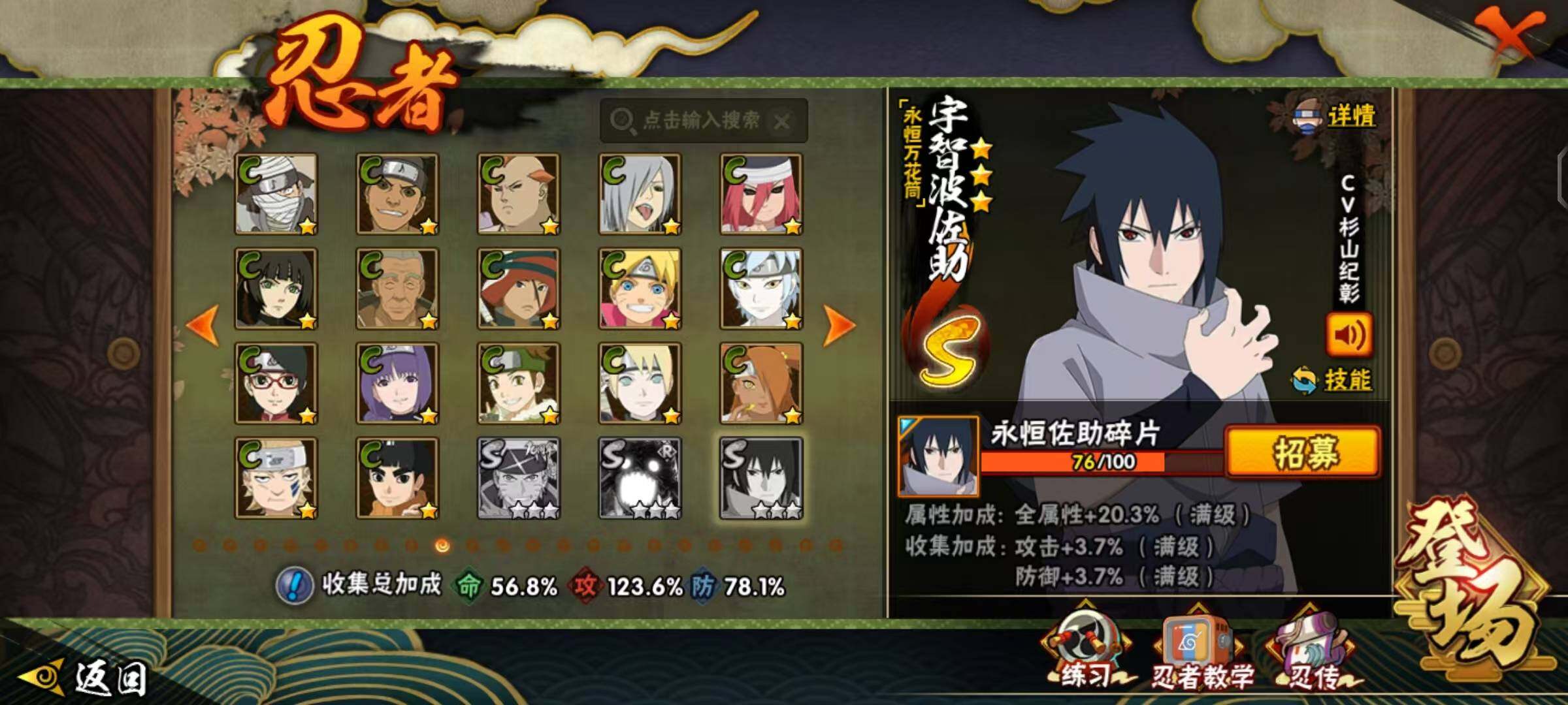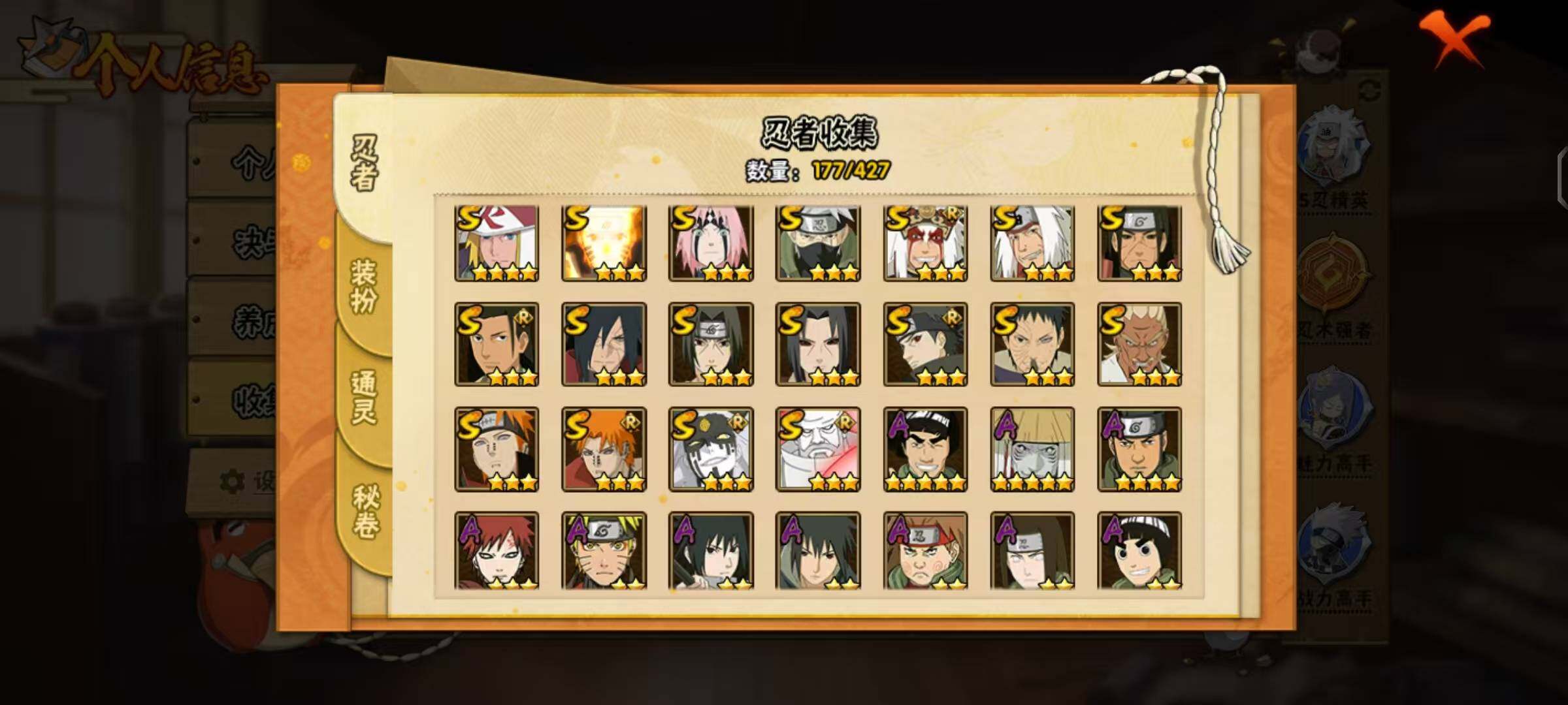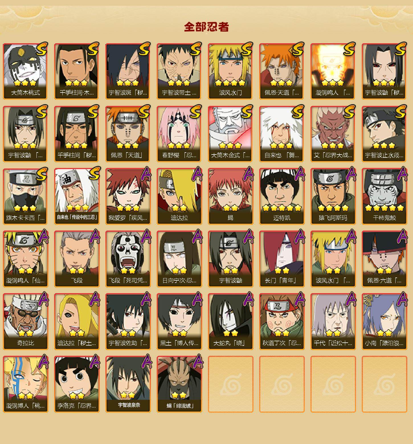 【S级忍者】:千手柱间「秽土转生」(3星),宇智波鼬「秽土转生」(3星),宇智波斑「秽土转生·解」(3星),春野樱「忍界大战」(3星),宇智波带土「忍界大战」(3星),艾「忍界大战」(3星),宇智波鼬「须佐能乎」(3星),宇智波止水「须佐能乎」(3星),旗木卡卡西「须佐能乎」(3星),千手柱间「木叶创立」(3星),自来也「舞之豪杰」(3星),自来也「传说中的三忍」(3星),波风水门(4星),漩涡鸣人「九喇嘛连结」(3星),佩恩「天道」(3星),佩恩·天道「超」(3