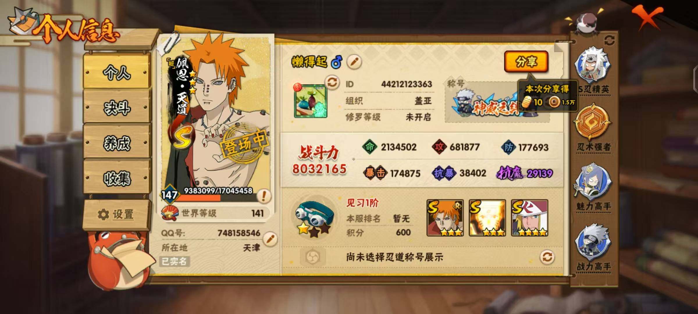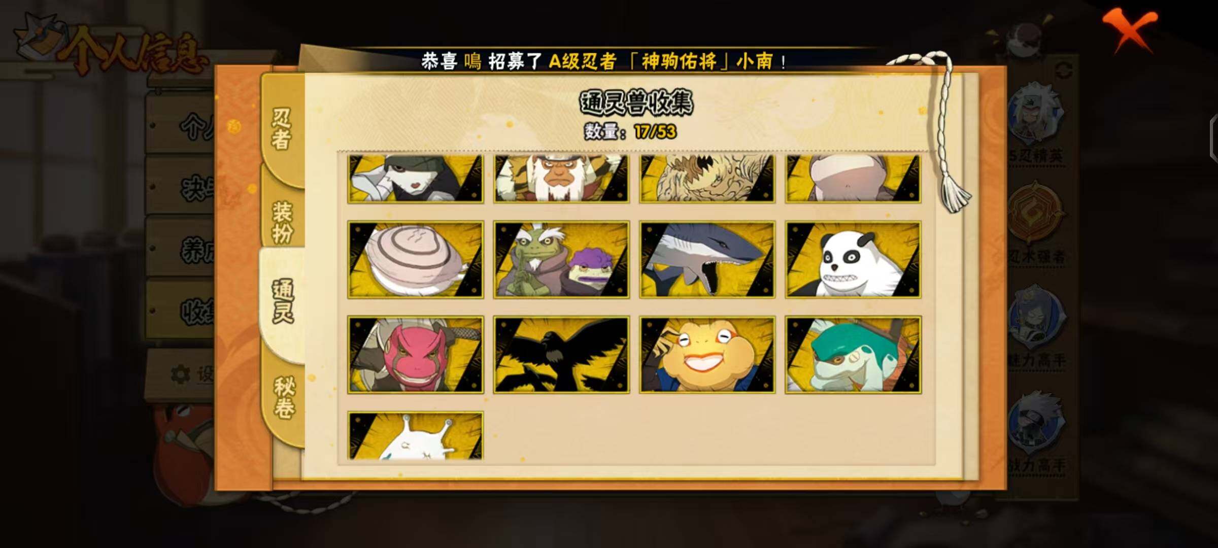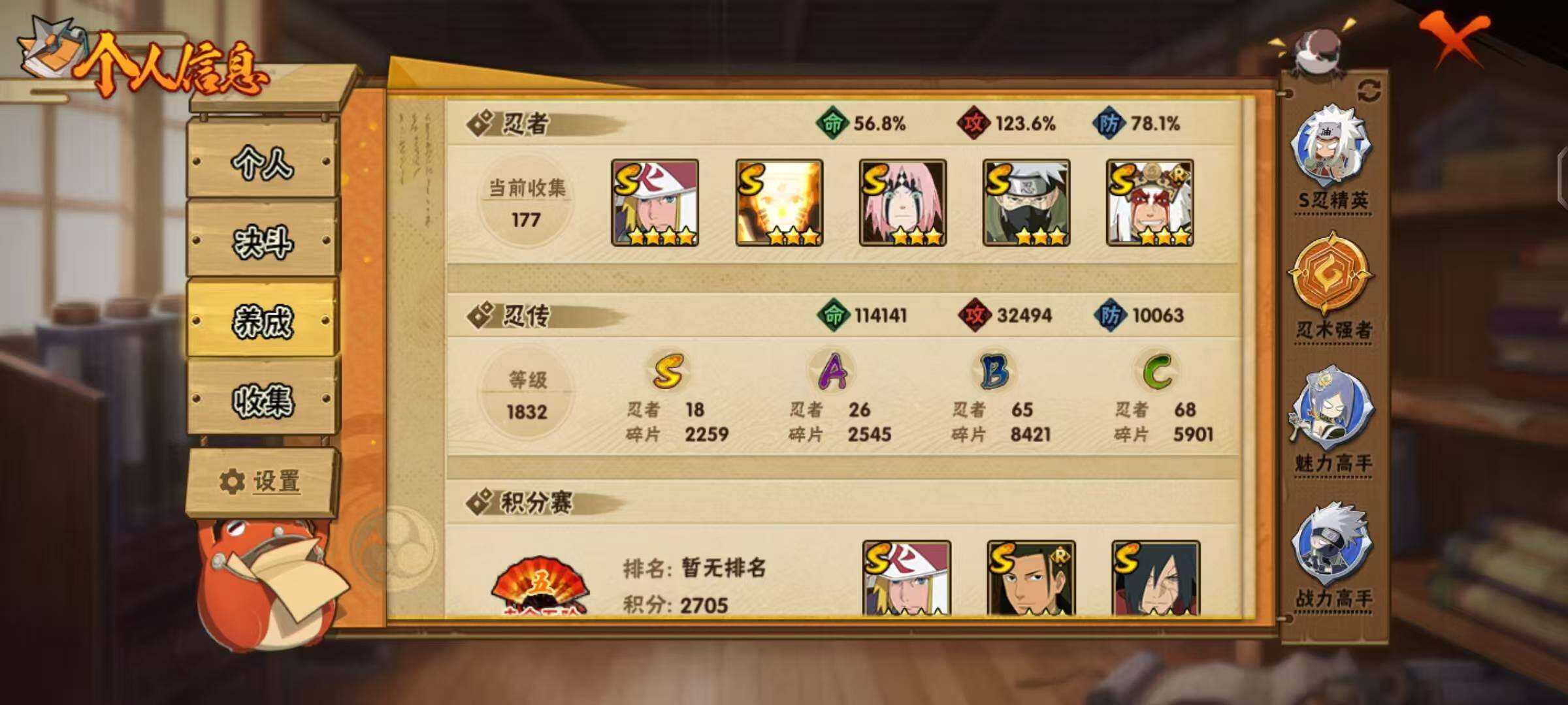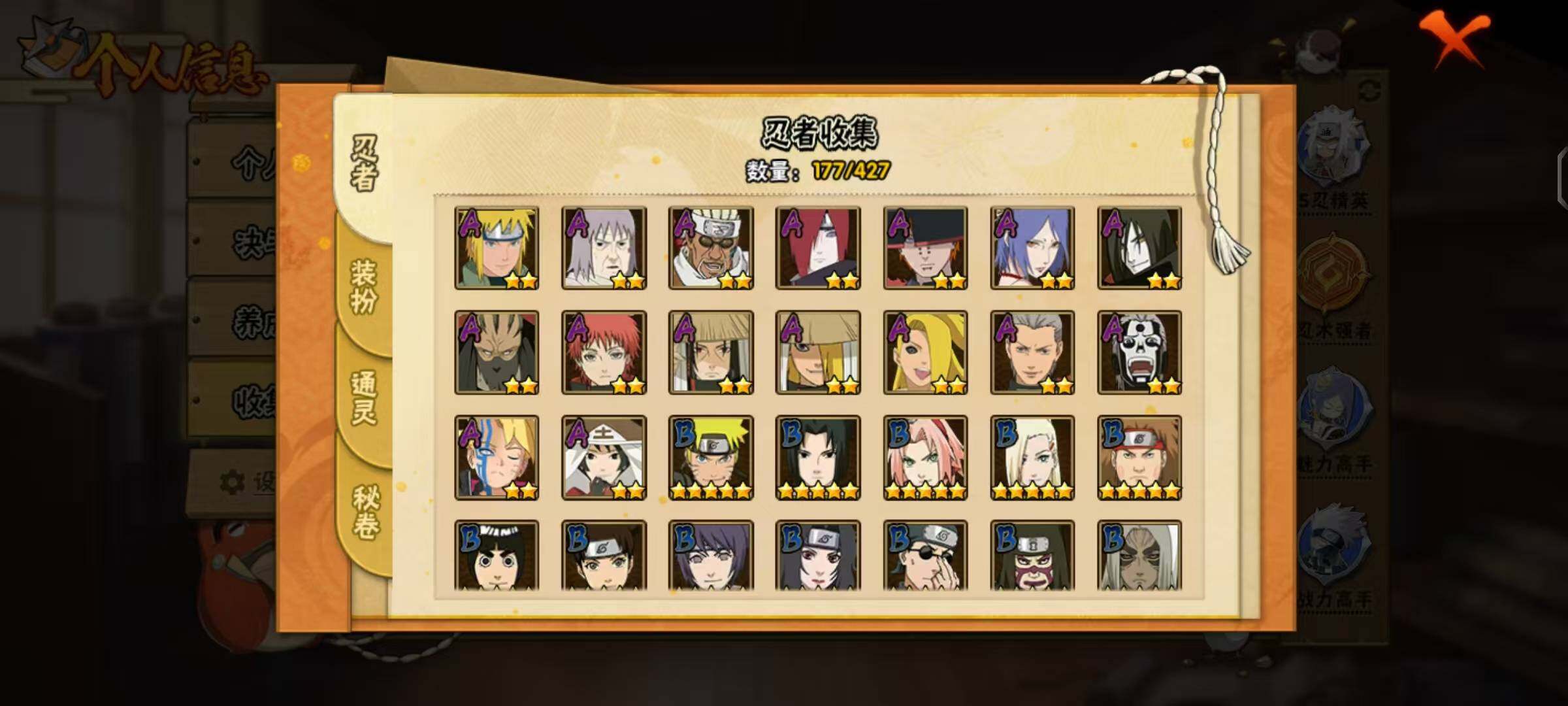 【S级忍者】:千手柱间「秽土转生」(3星),宇智波鼬「秽土转生」(3星),宇智波斑「秽土转生·解」(3星),春野樱「忍界大战」(3星),宇智波带土「忍界大战」(3星),艾「忍界大战」(3星),宇智波鼬「须佐能乎」(3星),宇智波止水「须佐能乎」(3星),旗木卡卡西「须佐能乎」(3星),千手柱间「木叶创立」(3星),自来也「舞之豪杰」(3星),自来也「传说中的三忍」(3星),波风水门(4星),漩涡鸣人「九喇嘛连结」(3星),佩恩「天道」(3星),佩恩·天道「超」(3