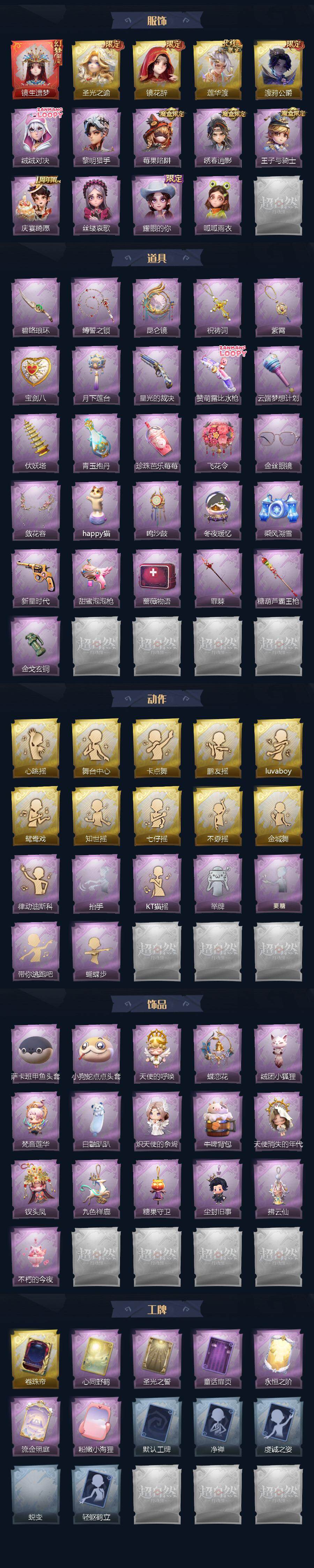 巫铃儿-镜生遗梦,薇薇安-圣光之谕,巫铃儿-镜花辞,逍遥-莲华渡,零-渡鸦公爵,艾伦-绒绒对决,艾伦-黎明猎手,莉莉-莓果陷阱,逍遥-绣春逍影,阿念-王子与骑士,阿念-庆宴绮愿,爱丽丝-丝缕哀歌,爱丽丝-耀眼的你,小黄-呱呱雨衣,刺刀-碧络琅环,长鞭-缚誓之锁,传送按钮-昆仑镜,摸金符-祝祷词,摸金符-紫霄,腰包-宝剑八,腰包-月下莲台,短管猎枪-星光的裁决,短管猎枪-赞萌露比水枪,专业手电-云端梦想计划,葫芦-伏妖塔,黄牛能量饮料-青玉抱丹,黄牛能量饮料-珍珠芭乐莓莓,额外的背包-飞花令,夜视