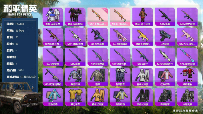 特-双字ID-浪漫天命-身法素材号】安卓 手Q-0粉装-1特效枪-0载具-0粉色飞行器-5701热力值-1王牌印记-23套装-30枪皮 【热门品类】:套装-浪漫天命,套装-暗影哥特 【粉色枪皮等级】:Mk14-福马献瑞(五级) 【粉色枪皮】:Mk14-福马献瑞 【稀有套装】:套装-马上有钱 【稀有枪皮】:AKM-影袭,AKM-星之彼岸,SCAR-L-红色方程式,M416-糯团青