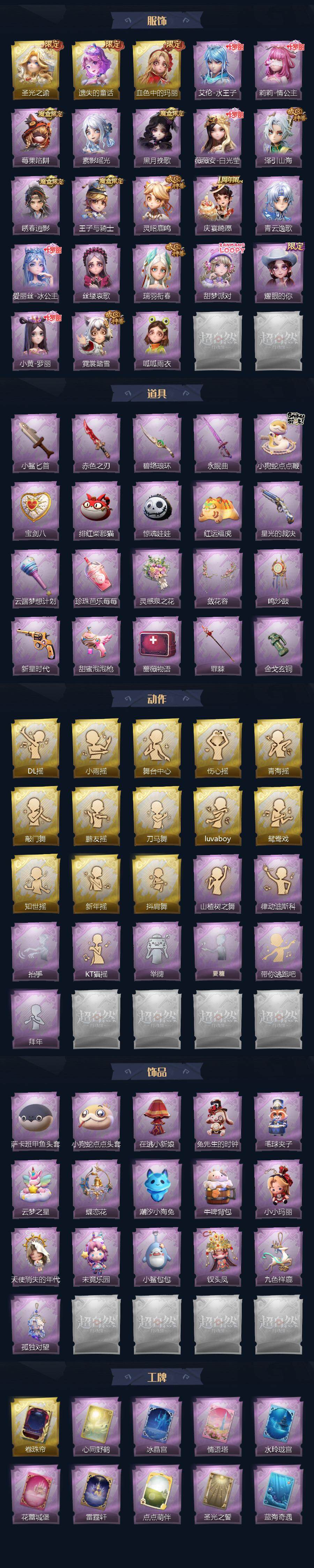 薇薇安-圣光之谕,小黄-遗失的童话,爱丽丝-血色中的玛丽,艾伦-水王子,莉莉-情公主,莉莉-莓果陷阱,巫铃儿-素影瑶光,薇薇安-黑月挽歌,薇薇安-白光莹,逍遥-泽引山海,逍遥-绣春逍影,阿念-王子与骑士,阿念-灵昭鹿鸣,阿念-庆宴绮愿,零-青云逸歌,爱丽丝-冰公主,爱丽丝-丝缕哀歌,爱丽丝-瑞羽衔春,爱丽丝-甜梦派对,爱丽丝-耀眼的你,小黄-罗丽,小黄-霓裳踏雪,小黄-呱呱雨衣,刺刀-小鲨匕首,刺刀-赤色之刃,刺刀-碧络琅环,桃木剑-永眠曲,长鞭-小狗蛇点点鞭,腰包-宝剑八,腰包-绯红柴郡猫,腰