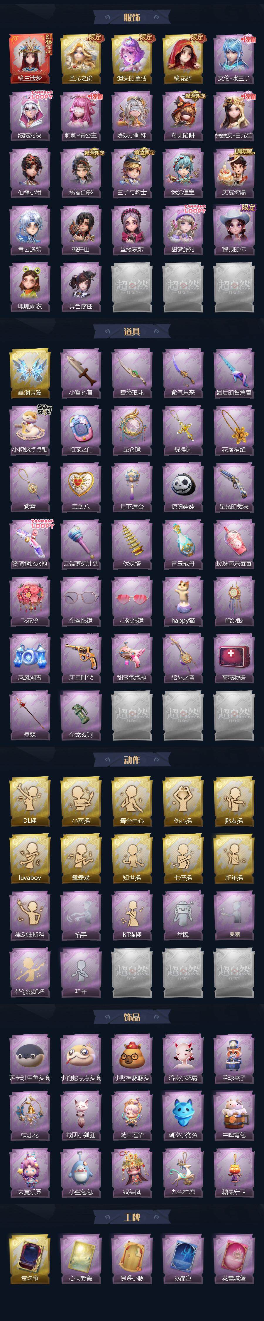 巫铃儿-镜生遗梦,薇薇安-圣光之谕,小黄-遗失的童话,巫铃儿-镜花辞,艾伦-水王子,艾伦-绒绒对决,莉莉-情公主,莉莉-除妖小师妹,莉莉-莓果陷阱,薇薇安-白光莹,薇薇安-仙锋小姐,逍遥-绣春逍影,阿念-王子与骑士,阿念-迷途僵宝,阿念-庆宴绮愿,零-青云逸歌,零-搬开山,爱丽丝-丝缕哀歌,爱丽丝-甜梦派对,爱丽丝-耀眼的你,小黄-呱呱雨衣,小黄-异色序曲,喷气背包-晶澜灵翼,刺刀-小鲨匕首,刺刀-碧络琅环,刺刀-紫气东来,桃木剑-最后的独角兽,长鞭-小狗蛇点点鞭,传送按钮-幻宠之门,传送按钮-
