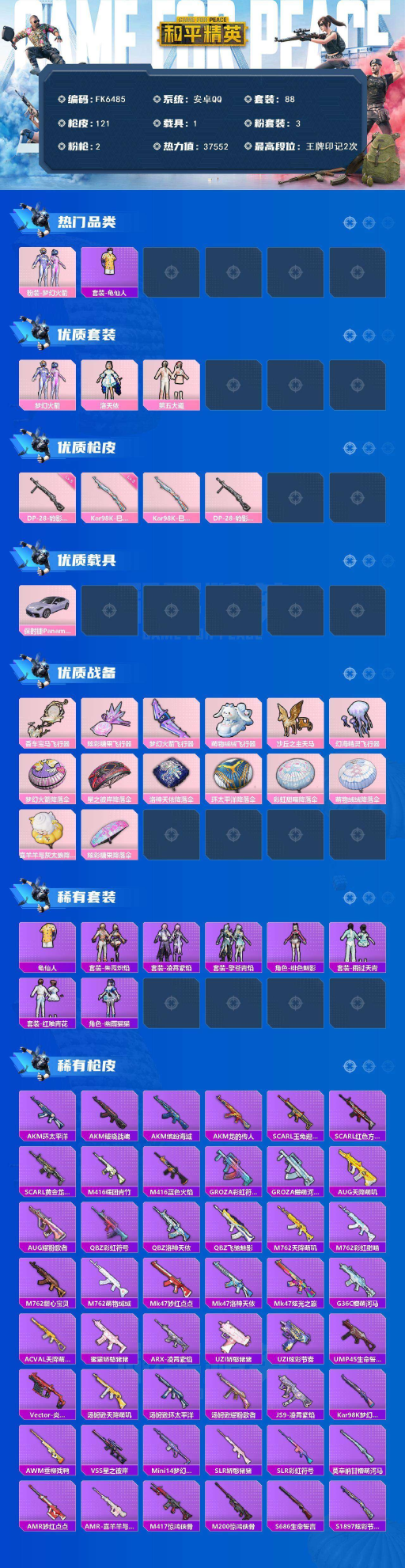材号-梦幻火箭101-洛天依-保时捷Panamera-3粉装2特效枪1载具-地铁40天赋点-游戏等级61】安卓 手Q-3粉装-2特效枪-1载具-6粉色飞行器-37552热力值-2王牌印记-88套装-121枪皮 【热门品类】:粉装-梦幻火箭,套装-龟仙人 【粉色套装】:粉装-梦幻火箭,角色-洛天依,粉装-第五大道 【粉色枪皮等级】:Kar98K-巳巳如意(三级),DP-28-豹影