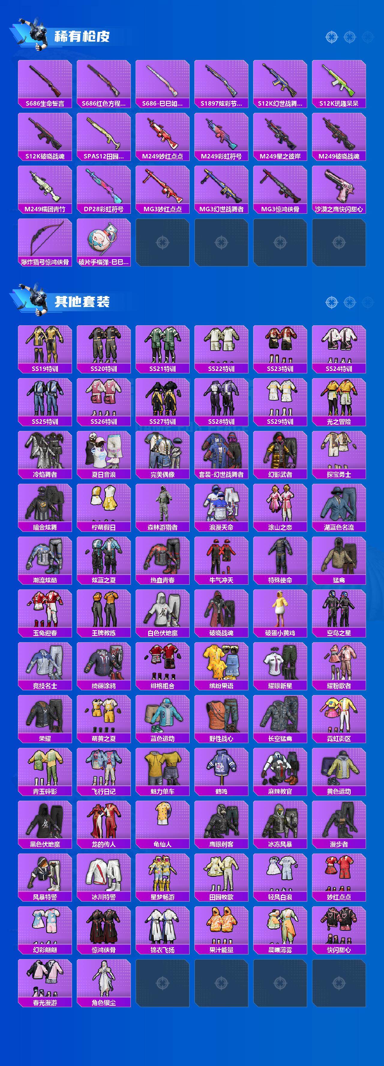 【粉色枪皮等级】:Kar98K-巳巳如意(五级),Mk14-福马献瑞(五级),AA12-G-萌骑幻想(五级),DP-28-豹影疾电(五级)