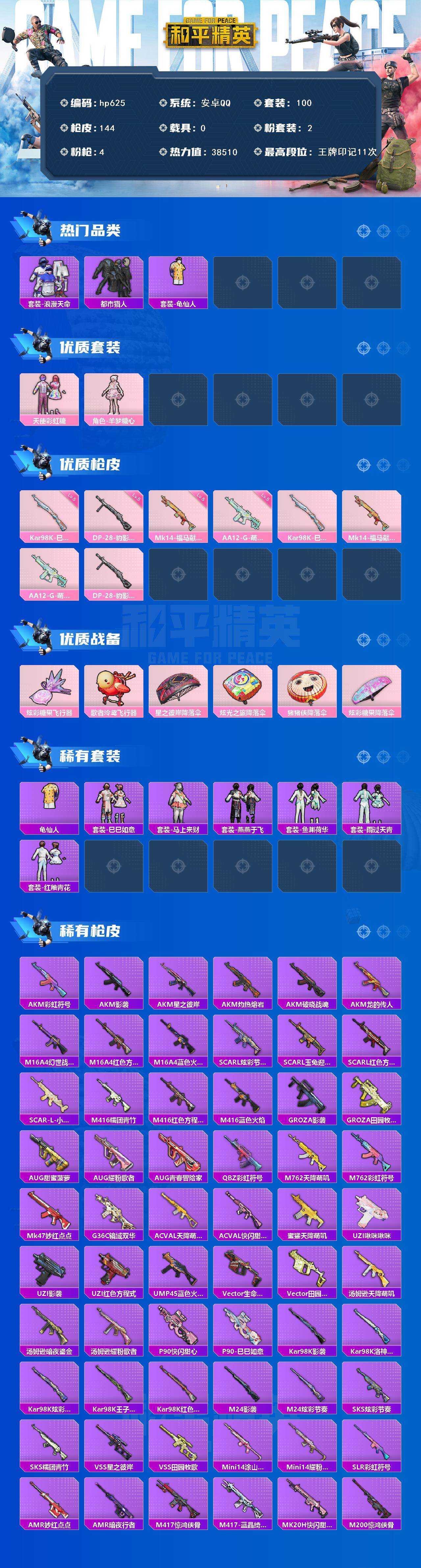 安卓 手Q-2粉装-4特效枪-0载具-2粉色飞行器-38510热力值-11王牌印记-100套装-144枪皮
