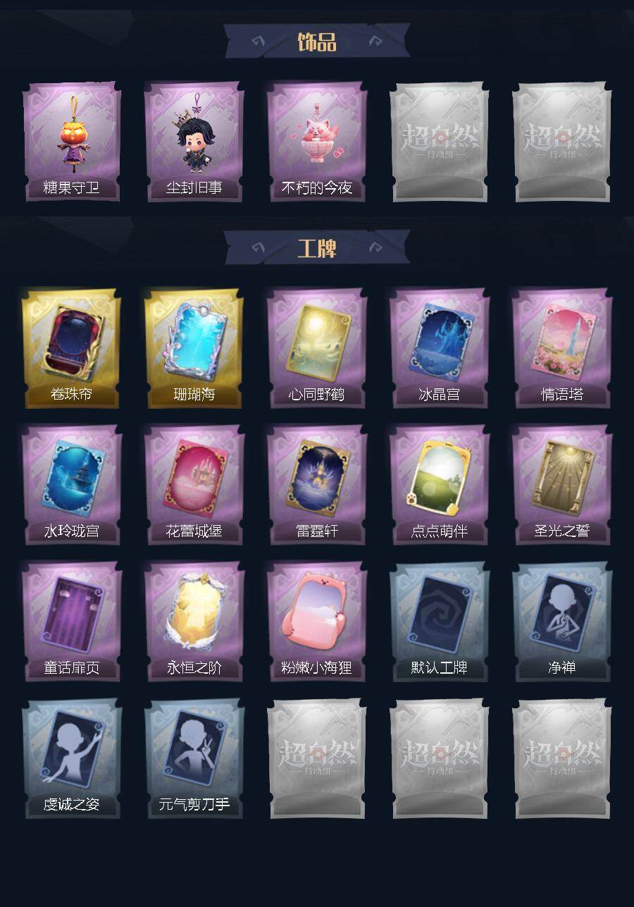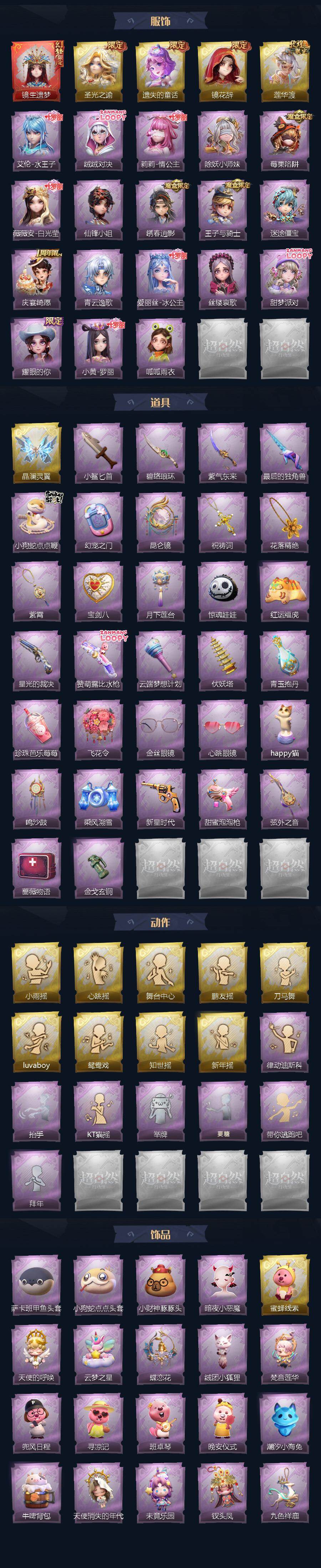 巫铃儿-镜生遗梦,薇薇安-圣光之谕,小黄-遗失的童话,巫铃儿-镜花辞,逍遥-莲华渡,艾伦-水王子,艾伦-绒绒对决,莉莉-情公主,莉莉-除妖小师妹,莉莉-莓果陷阱,薇薇安-白光莹,薇薇安-仙锋小姐,逍遥-绣春逍影,阿念-王子与骑士,阿念-迷途僵宝,阿念-庆宴绮愿,零-青云逸歌,爱丽丝-冰公主,爱丽丝-丝缕哀歌,爱丽丝-甜梦派对,爱丽丝-耀眼的你,小黄-罗丽,小黄-呱呱雨衣,喷气背包-晶澜灵翼,刺刀-小鲨匕首,刺刀-碧络琅环,刺刀-紫气东来,桃木剑-最后的独角兽,长鞭-小狗蛇点点鞭,传送按钮-幻宠之