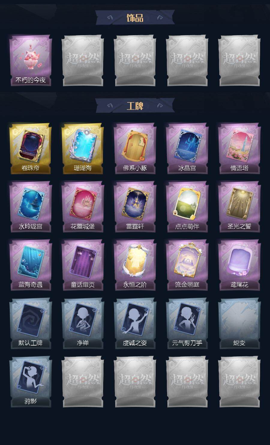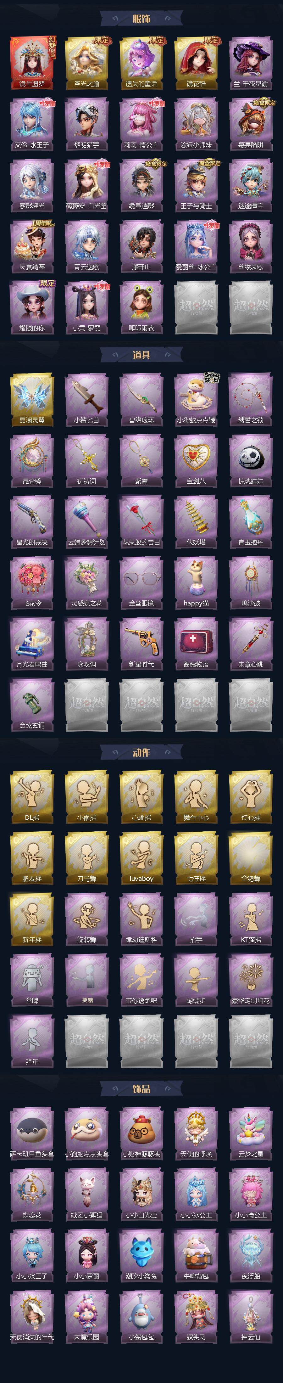 巫铃儿-镜生遗梦,薇薇安-圣光之谕,小黄-遗失的童话,巫铃儿-镜花辞,兰-千夜星谕,艾伦-水王子,艾伦-黎明猎手,莉莉-情公主,莉莉-除妖小师妹,莉莉-莓果陷阱,巫铃儿-素影瑶光,薇薇安-白光莹,逍遥-绣春逍影,阿念-王子与骑士,阿念-迷途僵宝,阿念-庆宴绮愿,零-青云逸歌,零-搬开山,爱丽丝-冰公主,爱丽丝-丝缕哀歌,爱丽丝-耀眼的你,小黄-罗丽,小黄-呱呱雨衣,喷气背包-晶澜灵翼,刺刀-小鲨匕首,刺刀-碧络琅环,长鞭-小狗蛇点点鞭,长鞭-缚誓之锁,传送按钮-昆仑镜,摸金符-祝祷词,摸金符-紫