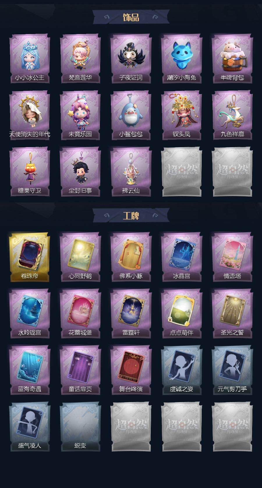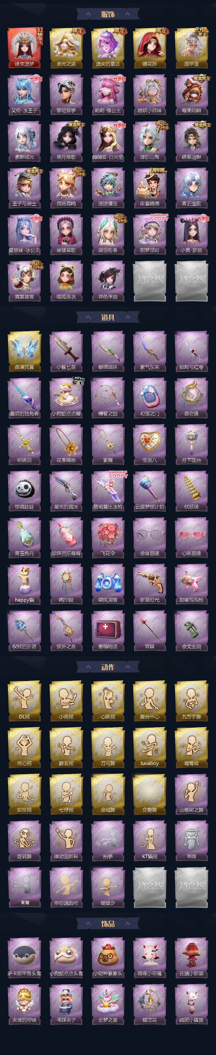 巫铃儿-镜生遗梦,薇薇安-圣光之谕,小黄-遗失的童话,巫铃儿-镜花辞,逍遥-莲华渡,艾伦-水王子,艾伦-黎明猎手,莉莉-情公主,莉莉-除妖小师妹,莉莉-莓果陷阱,巫铃儿-素影瑶光,薇薇安-黑月挽歌,薇薇安-白光莹,逍遥-泽引山海,逍遥-绣春逍影,阿念-王子与骑士,阿念-灵昭鹿鸣,阿念-迷途僵宝,阿念-庆宴绮愿,零-青云逸歌,爱丽丝-冰公主,爱丽丝-丝缕哀歌,爱丽丝-瑞羽衔春,爱丽丝-甜梦派对,小黄-罗丽,小黄-霓裳踏雪,小黄-呱呱雨衣,小黄-异色序曲,喷气背包-晶澜灵翼,刺刀-小鲨匕首,刺刀-碧