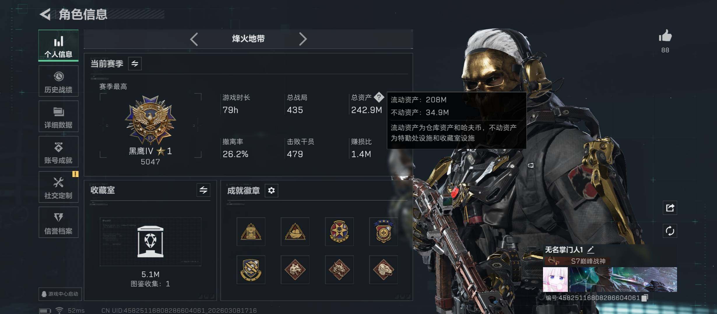 仓库8级/靶场6级/训练中心7级-242m总资产-119M哈伏币-60烽火等级-黑鹰-42战场等级-上等兵