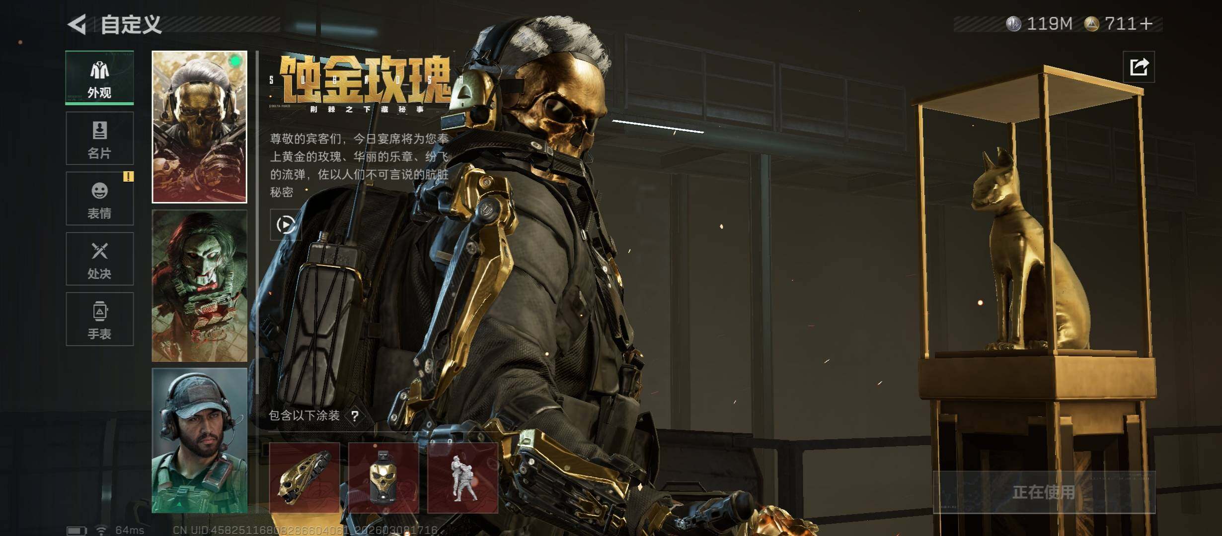 【干员外观】:红狼-蚀金玫瑰,蜂医-送葬人·无题密令,深蓝-不破誓约,红狼-电锯惊魂,露娜-金牌射手