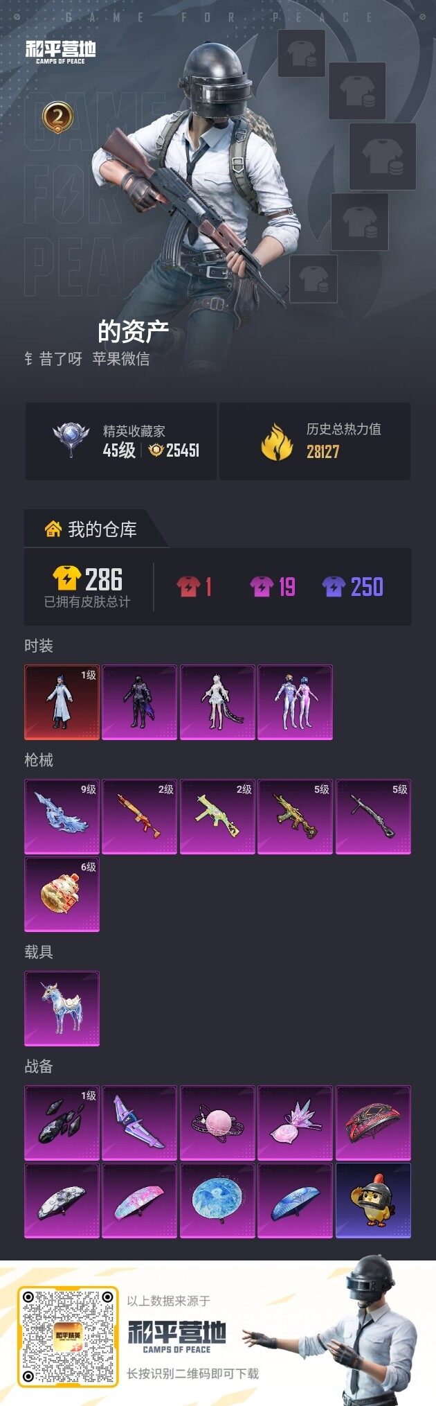 1神装-3粉装-6特效枪-1载具-4粉色飞行器-28127热力值-2王牌印记-47套装-82枪皮