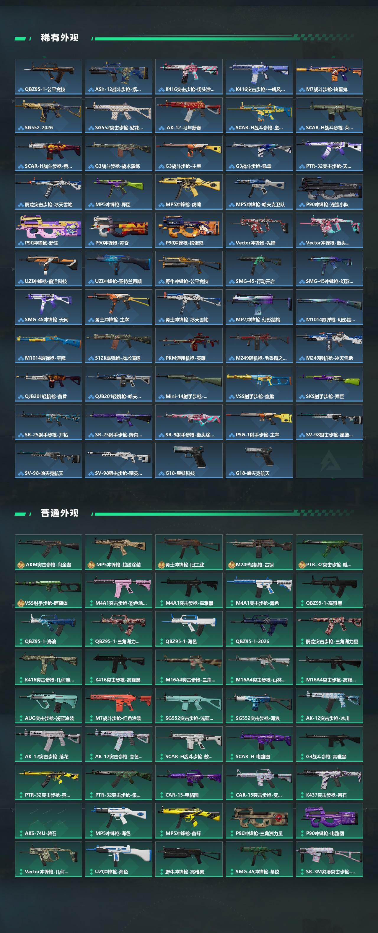 【传说外观】:M4A1突击步枪-阿米娅,ASh-12战斗步枪-鹅鸭杀,K416突击步枪-行动记录,SG552突击步枪-运动员,AK-12突击步枪-特斯拉线圈,SCAR-H战斗步枪-启航,