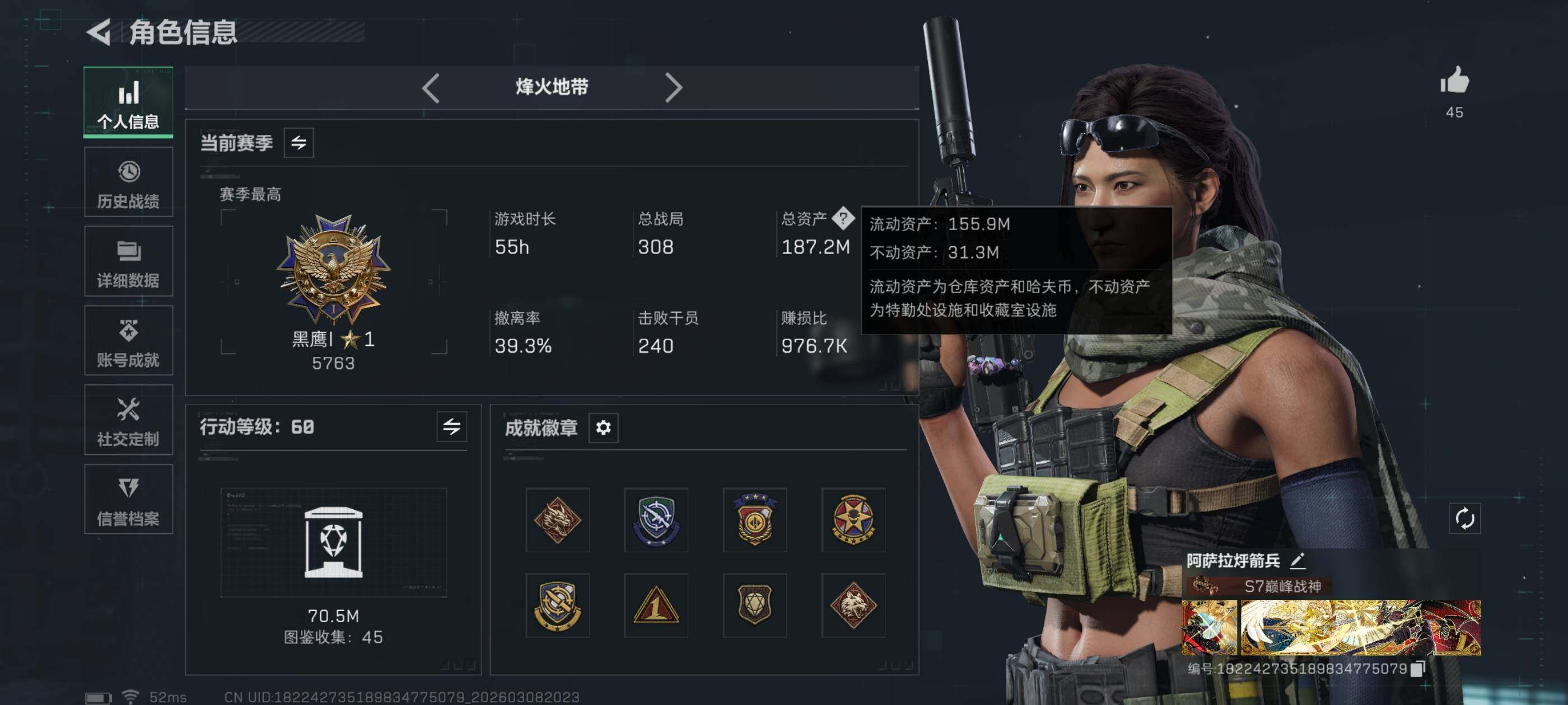【赛季热门单刀暗星+电锯全套/资产187M】【Q区三端互通】【无二次】YXz9038-特勤处:仓库7级/靶场6级/训练中心7级-总资产187m-哈夫币2791w-烽火等级:60级