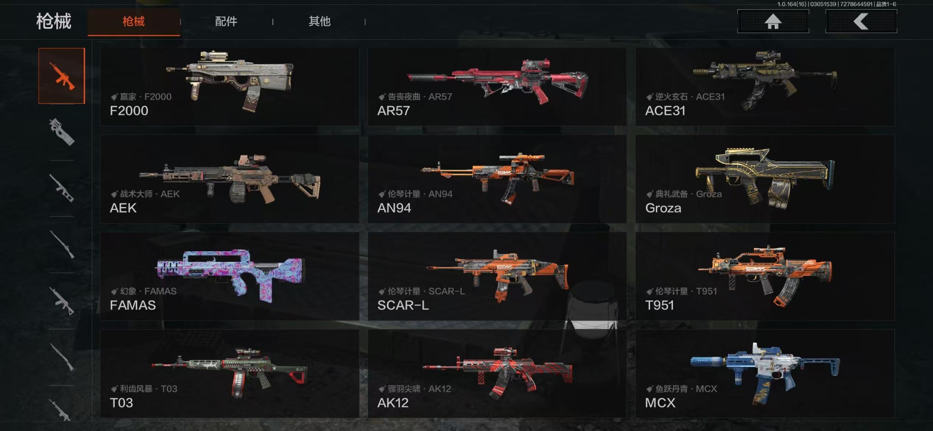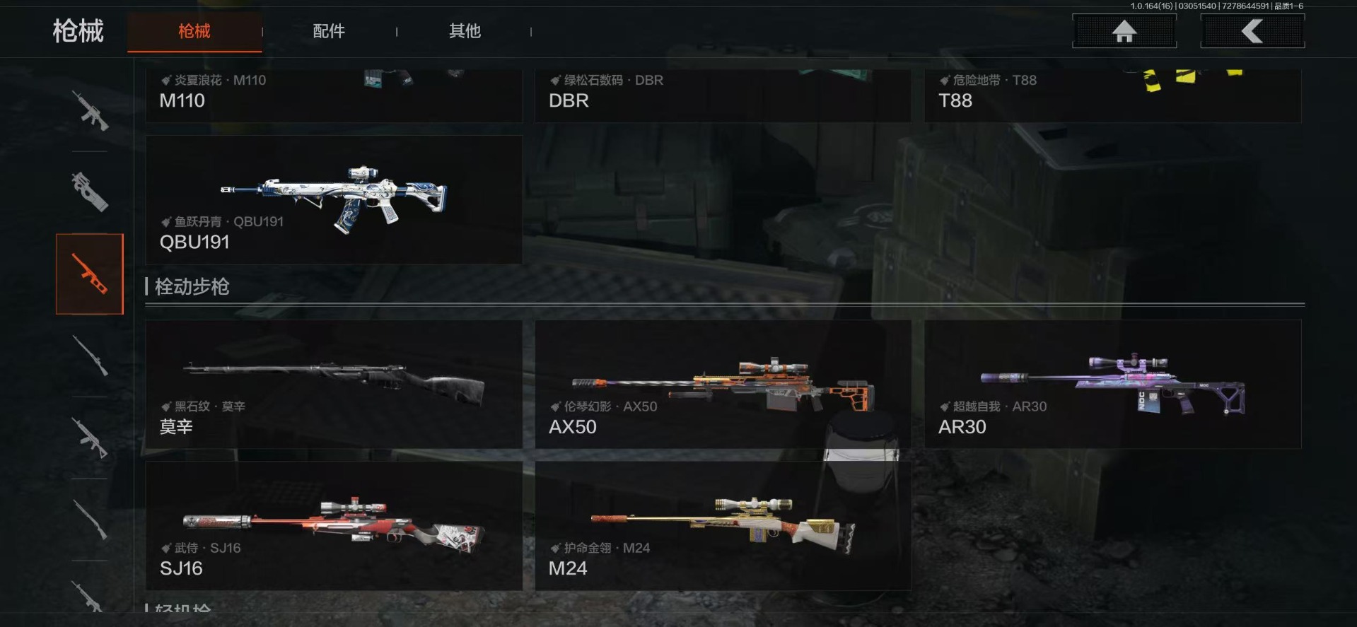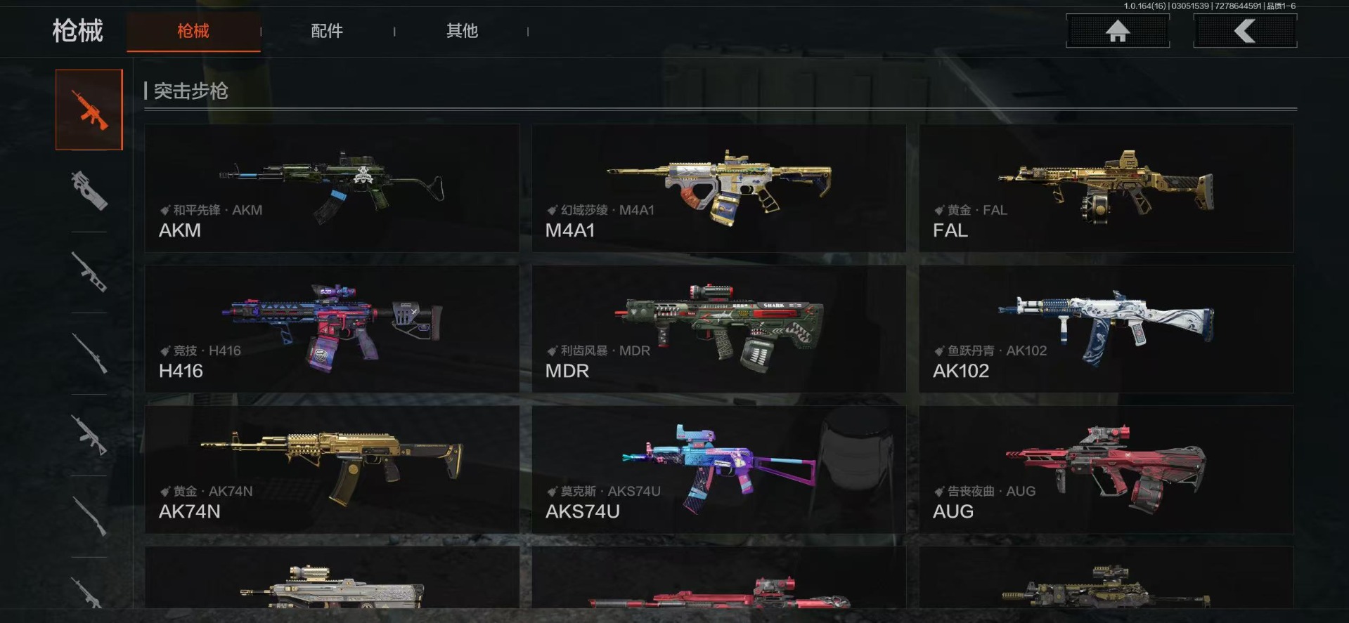 【金色枪皮】战术大师·AEK,旧王圣谕·VSS,乌金黑曜·QBZ192,旧王圣谕·QBZ191,黄金·AK74N,伦琴幻影·FAL,旗帜·AEK,伦琴幻影·AX50,浮鳞影青·QBZ192
