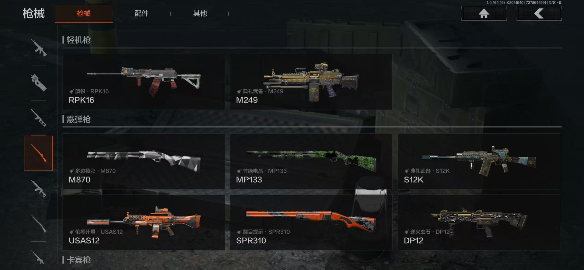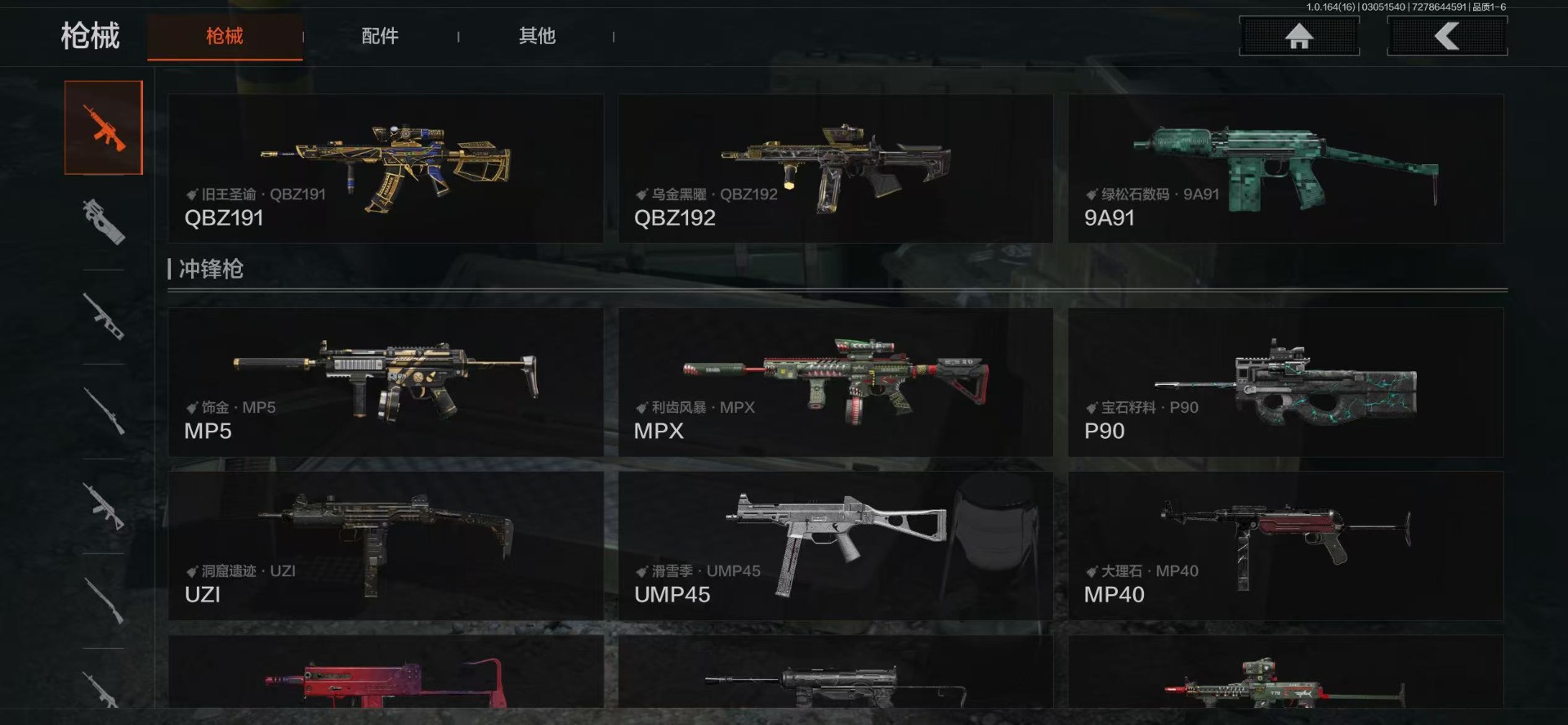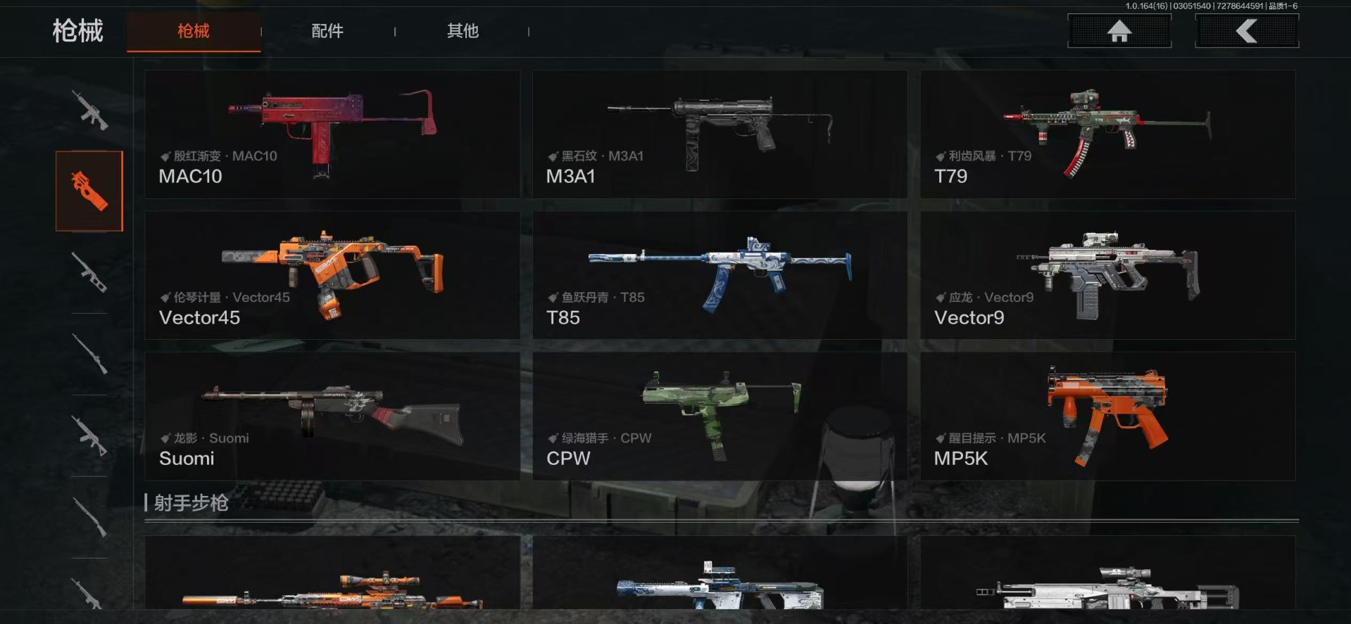 【金色枪皮】战术大师·AEK,旧王圣谕·VSS,乌金黑曜·QBZ192,旧王圣谕·QBZ191,黄金·AK74N,伦琴幻影·FAL,旗帜·AEK,伦琴幻影·AX50,浮鳞影青·QBZ192
