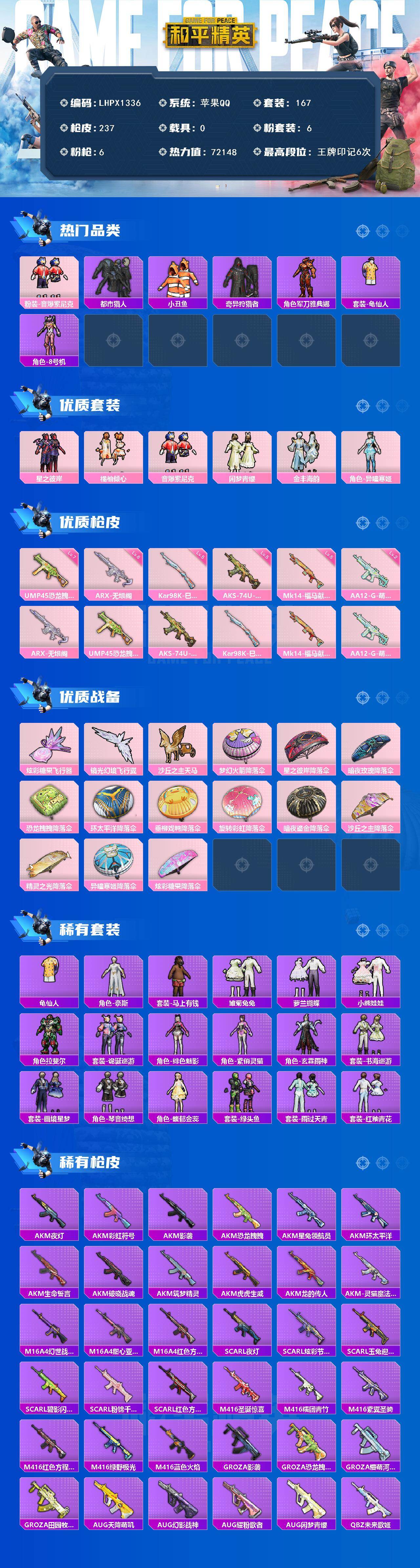 【特价出售/店主推荐】苹果 手Q-6粉装-6特效枪-0载具-4粉色飞行器-72148热力值-6王牌印记-167套装-237枪皮