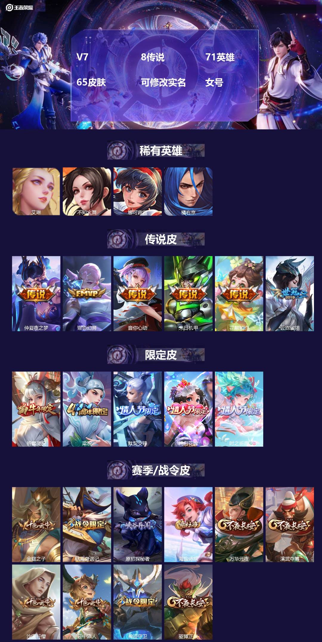 V7 8传说 71英雄 65皮肤 可修改实名 女号