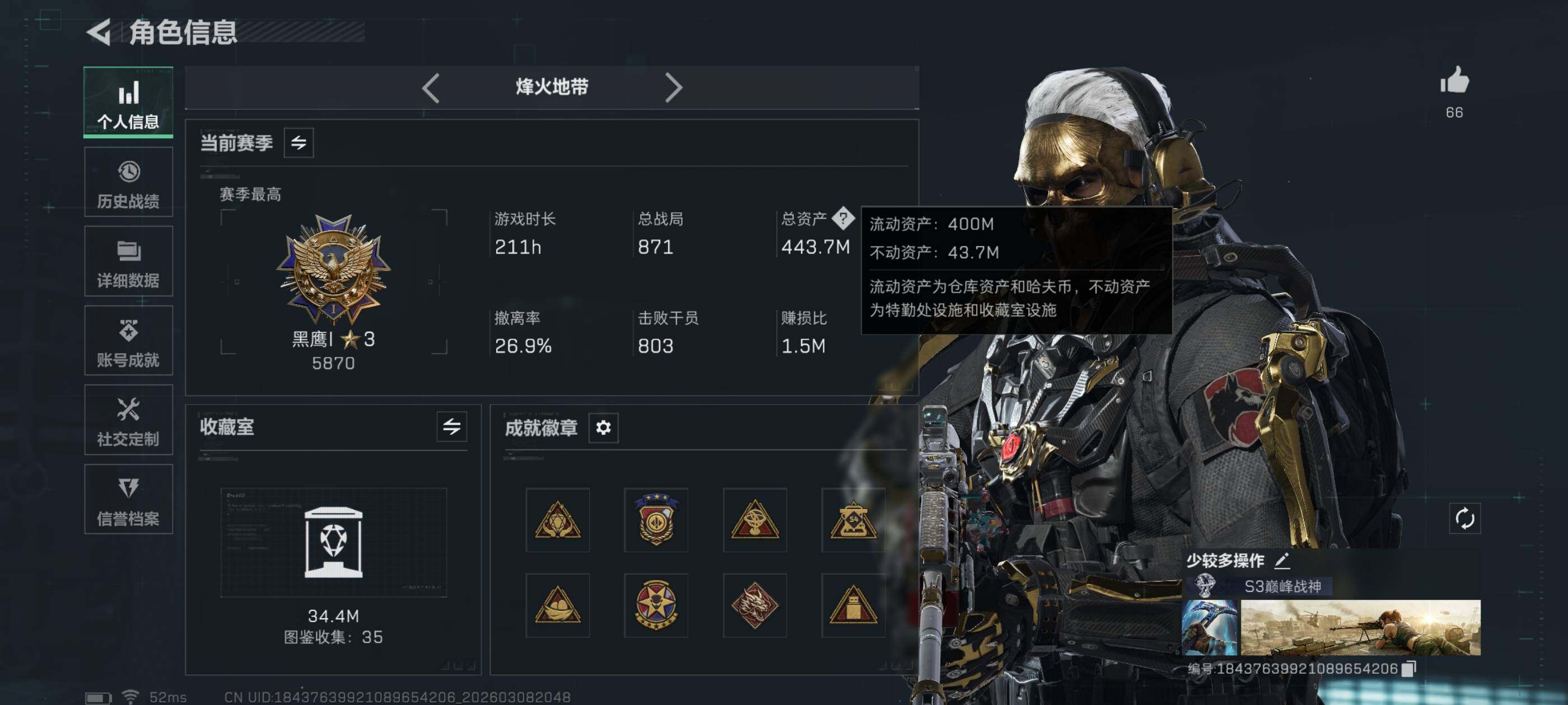 【热门皮肤号:单红+四刀-蚀金玫瑰.信条.怜悯.黑海.处刑者1级·高额资产443M.现金227M】【Q区三端互通】【可二次】YXz9040-特勤处:仓库10级/靶场7级/训练中心7级-总资产443m-哈夫币227m-烽火等级:60级