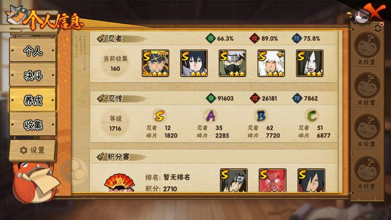 v7 678万战力 12S-35A 传说自来也96片 鸣人83片 忍战樱51片 九喇嘛水门79片 十尾带土53片 忍战大野木88片 LL5930