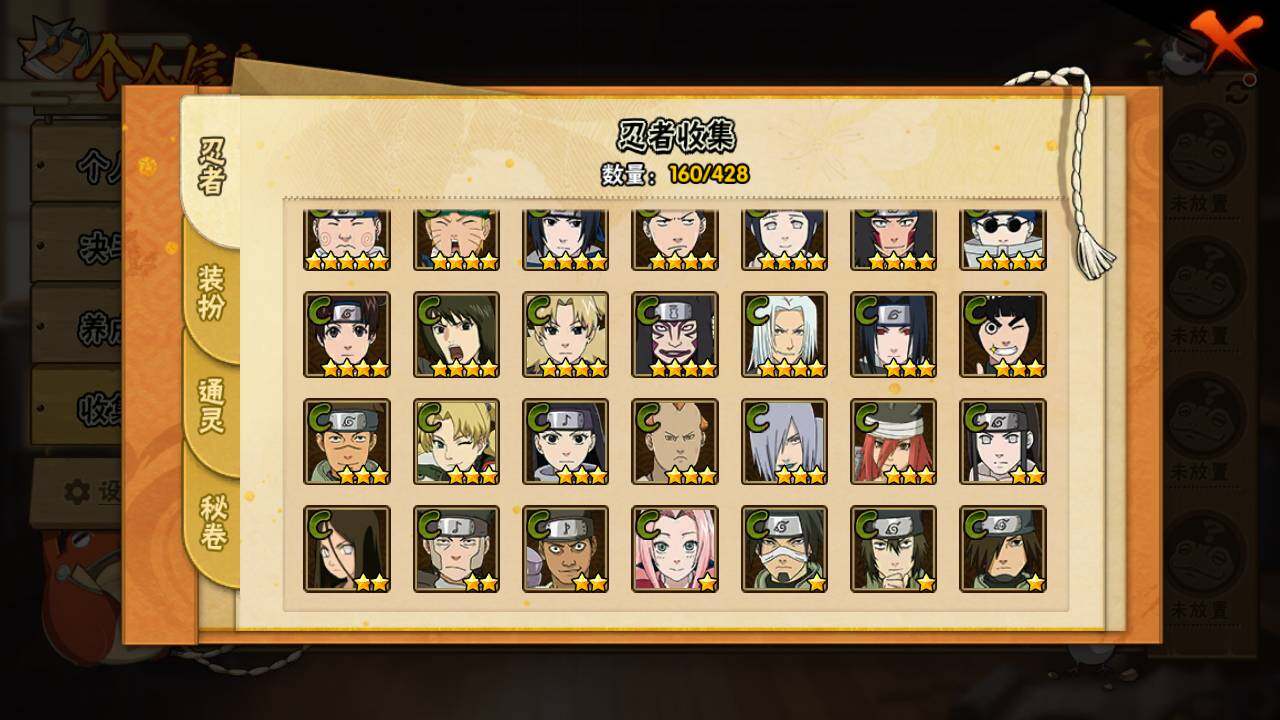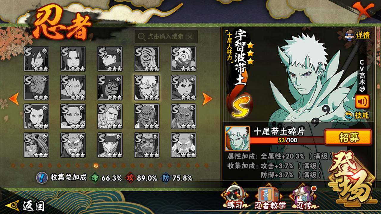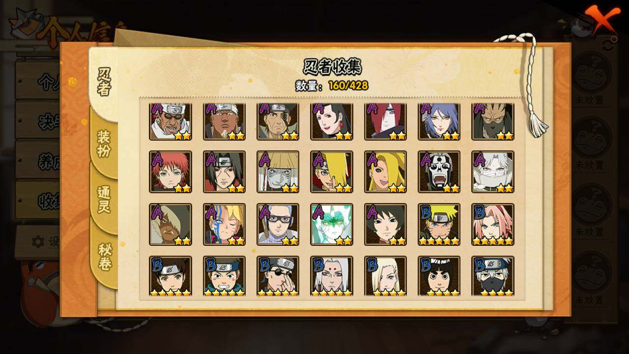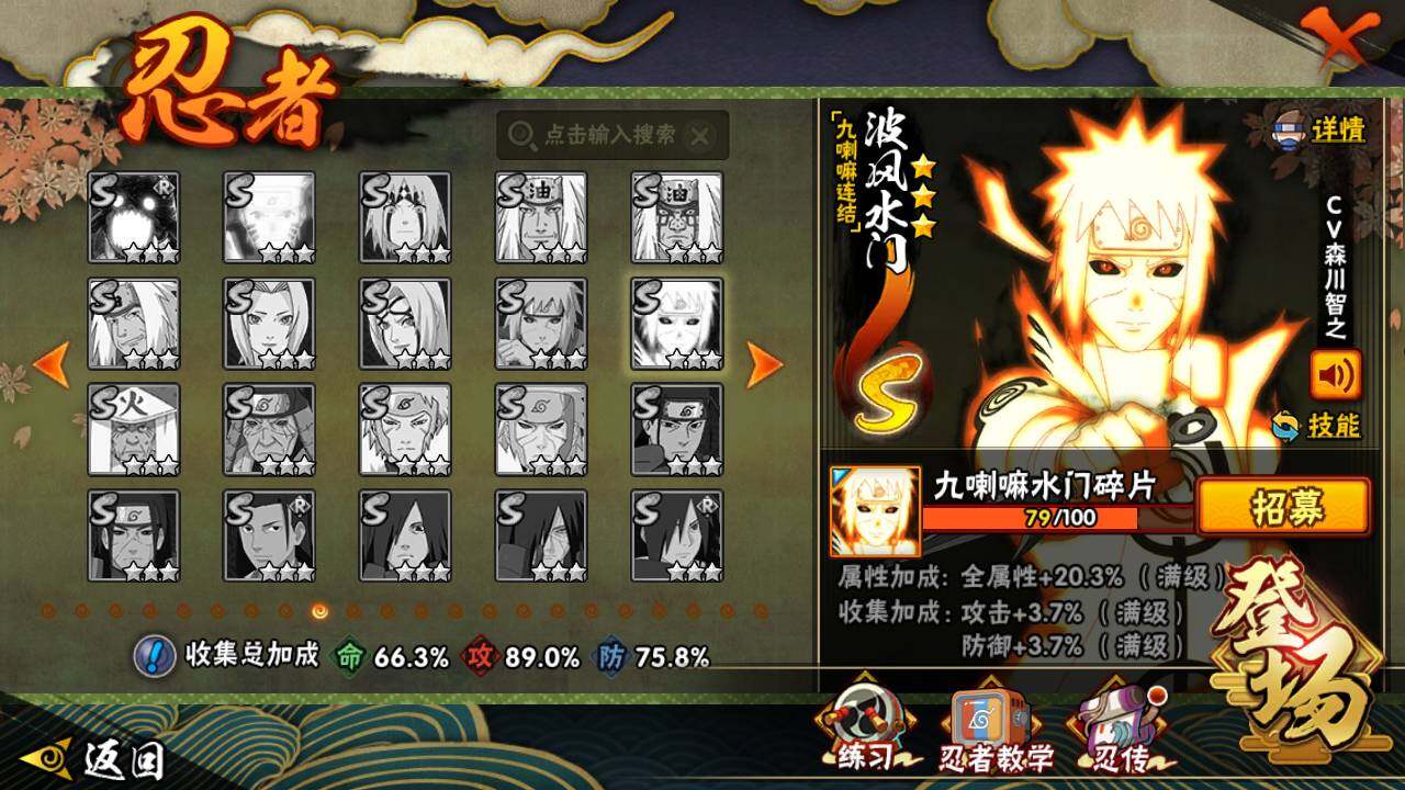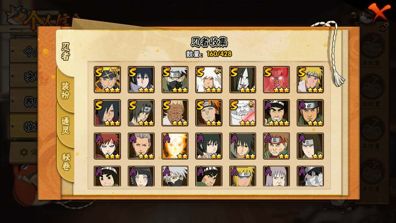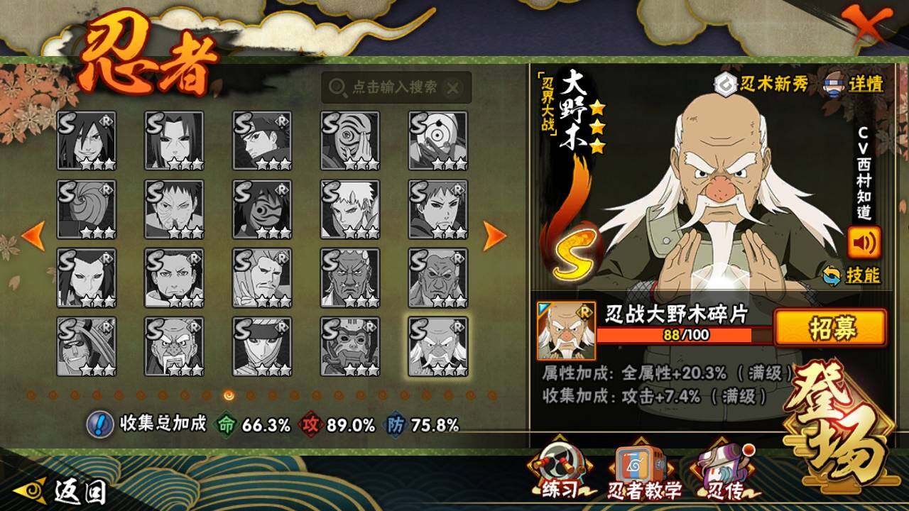 【S级忍者】:宇智波斑「秽土转生·解」(3星),艾「忍界大战」(3星),宇智波鼬「须佐能乎」(3星),旗木卡卡西「须佐能乎」(3星),自来也「舞之豪杰」(3星),大蛇丸(3星),波风水门(3星),迈特凯「死门」(3星),佩恩「天道」(3星),宇智波佐助
