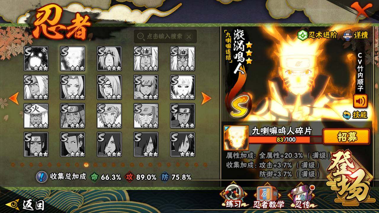 v7 678万战力 12S-35A 传说自来也96片 鸣人83片 忍战樱51片