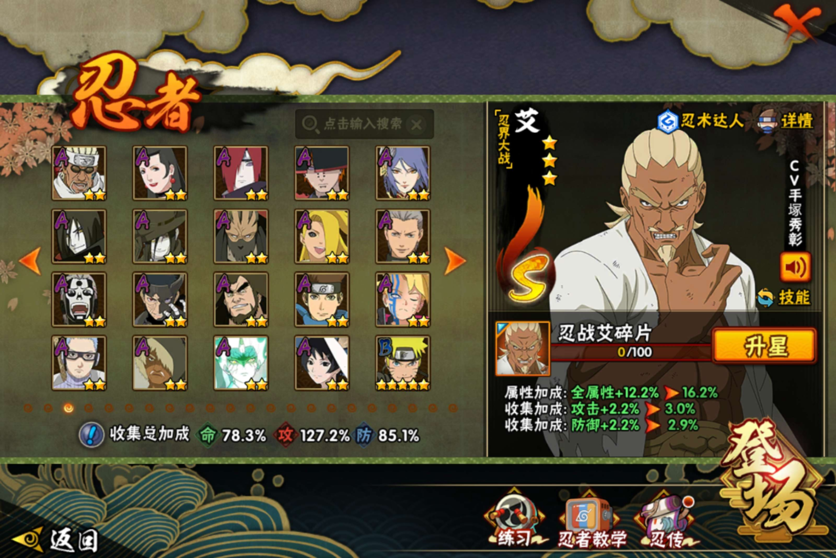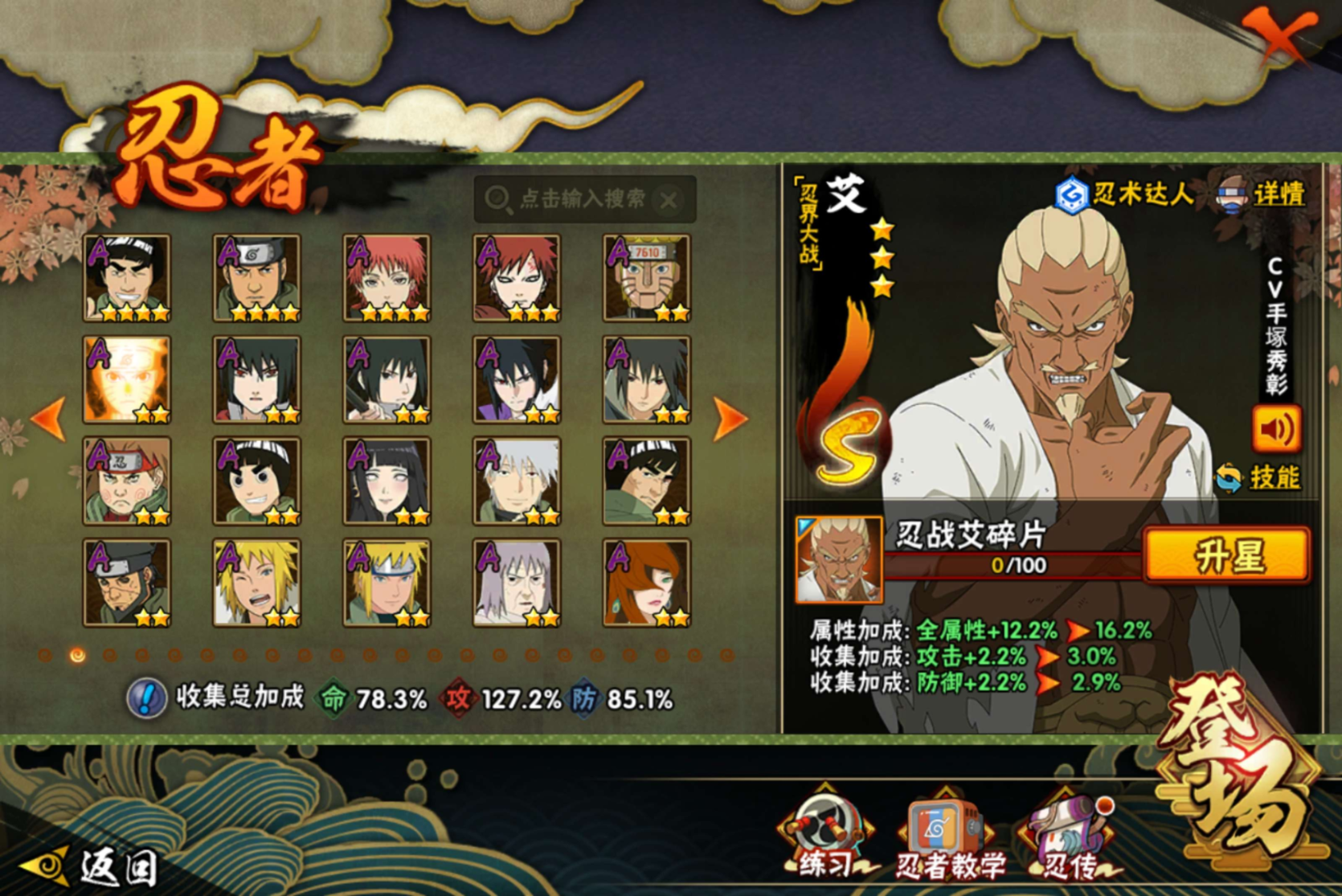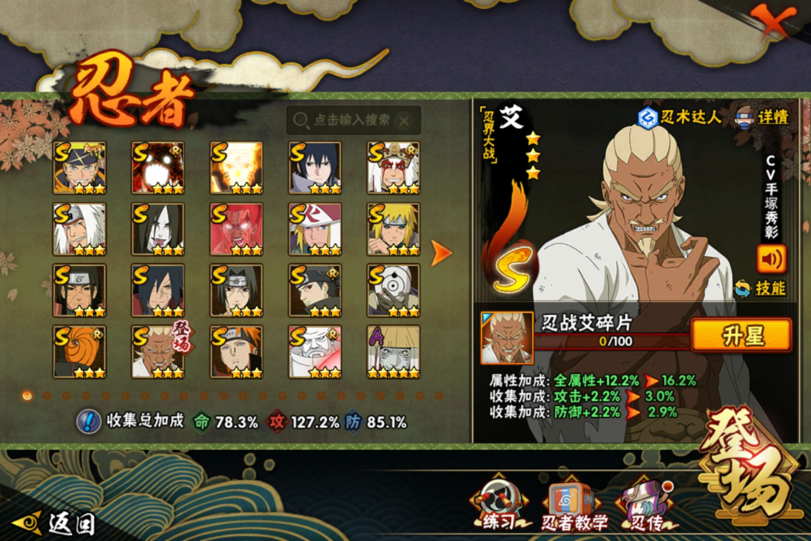 【S级忍者】迈特凯「死门」(3星),自来也「传说中的三忍」(3星),漩涡鸣人「暴怒·第六尾」(3星),宇智波斑「秽土转生·解」(3星),宇智波佐助「永恒万花筒」(3星),大筒木金式(3星),艾「忍界大战」(3星),宇智波止水「须佐能乎」(3星),千手柱间「秽土转生」(3星),漩涡鸣人「九喇嘛连结」(3星),宇智波斑「