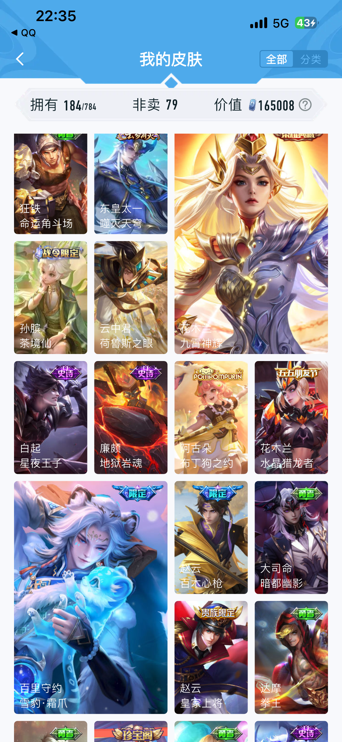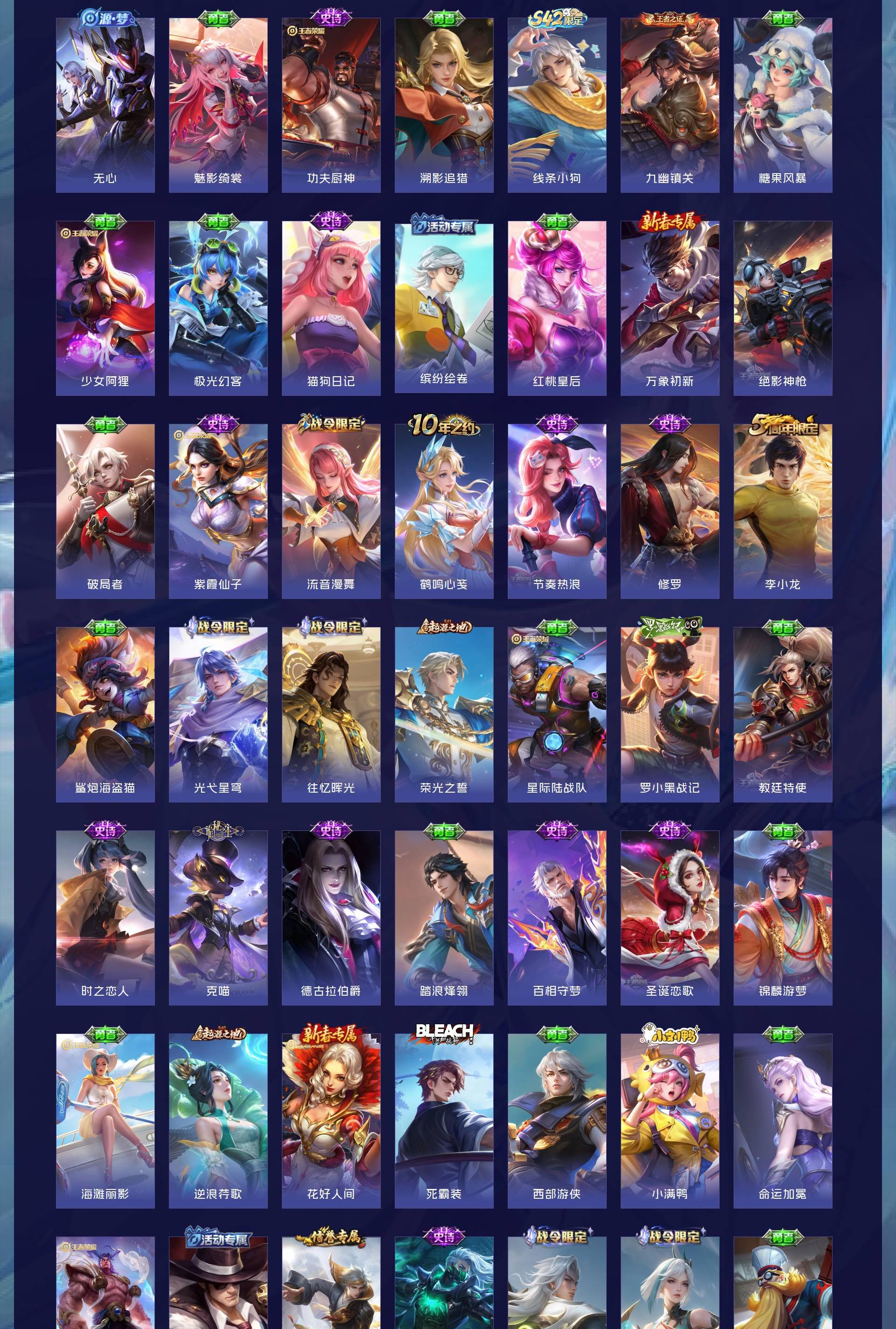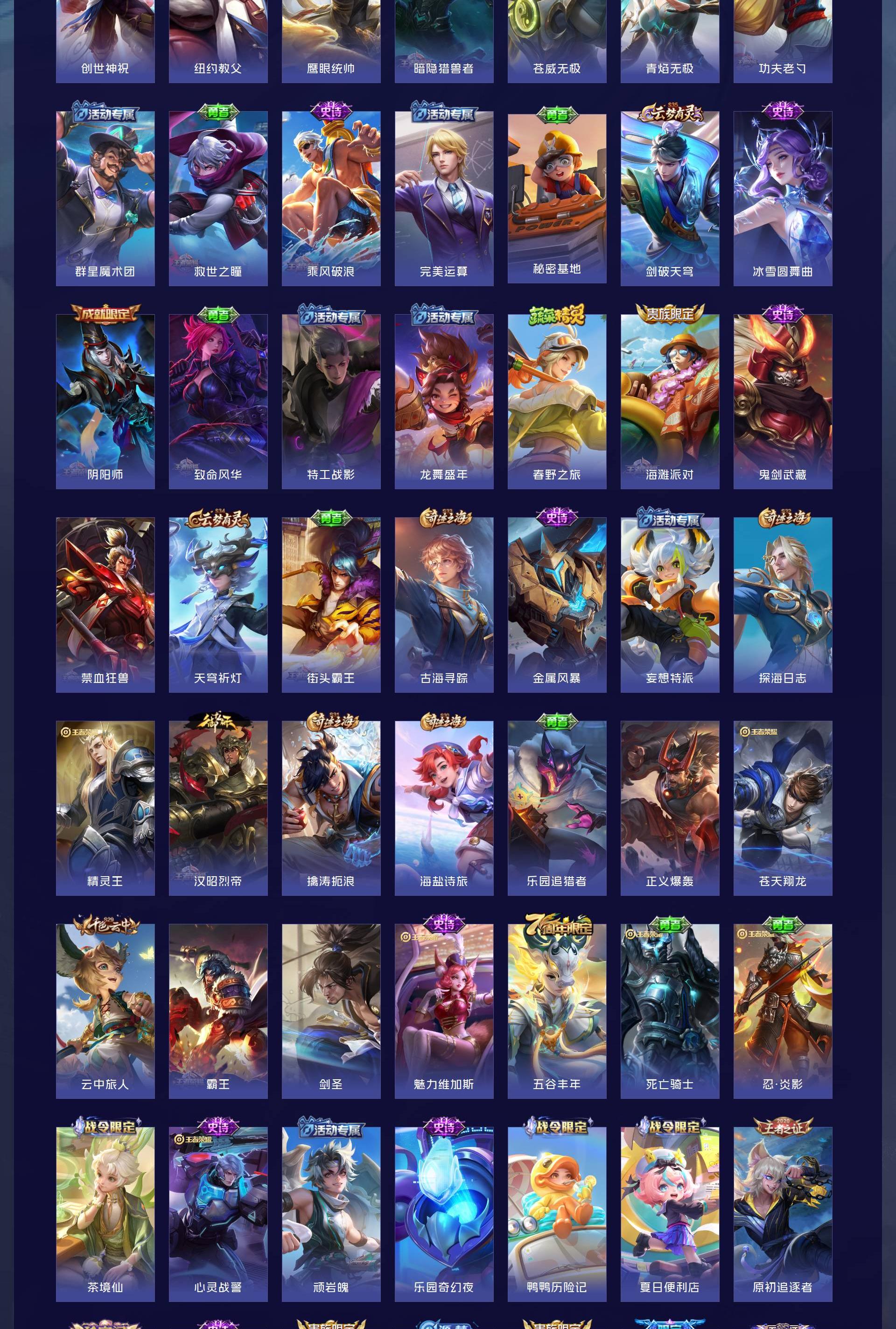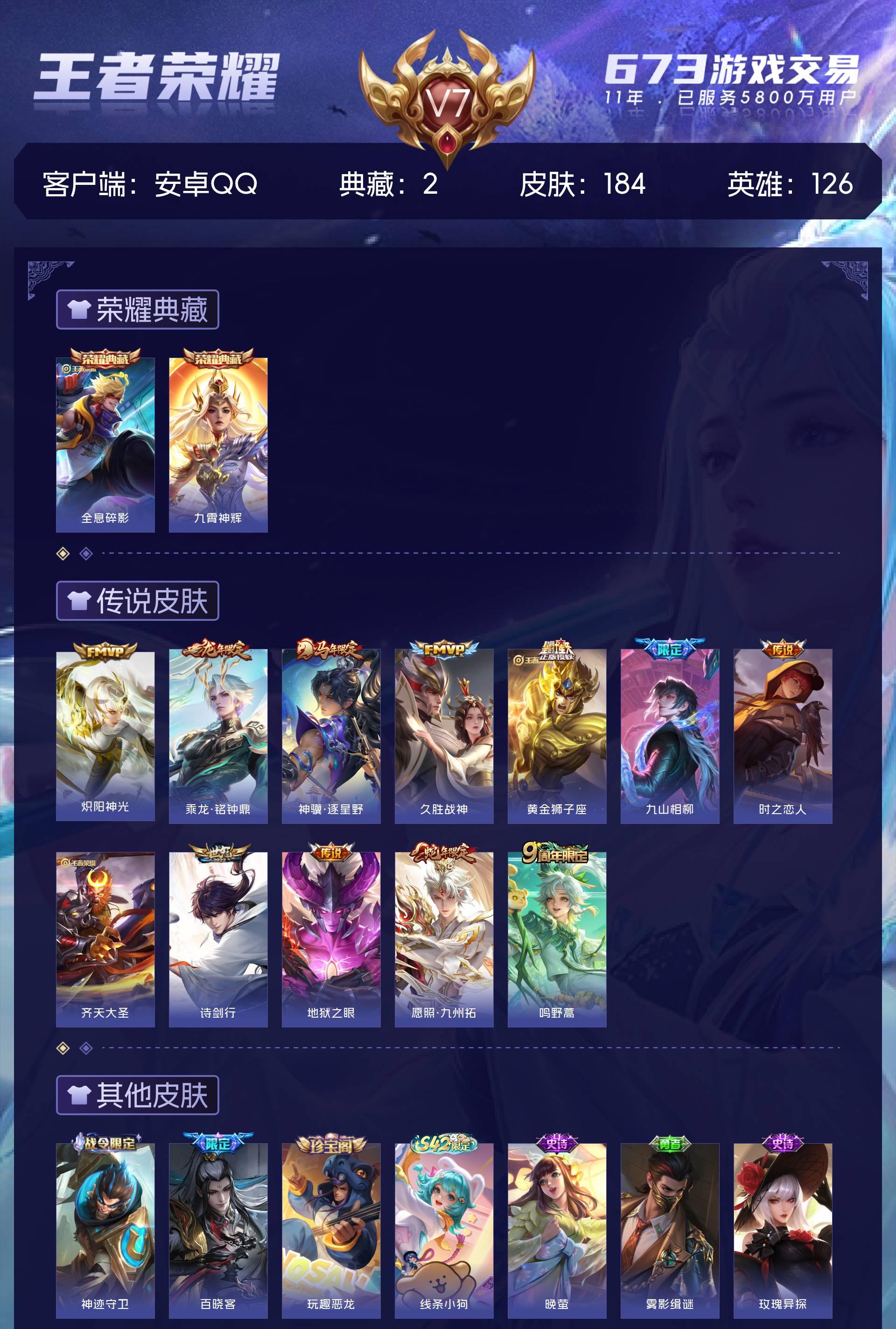 V7 皮肤184 英雄126 至尊星耀 荣耀典藏2 传说12 其他皮肤177