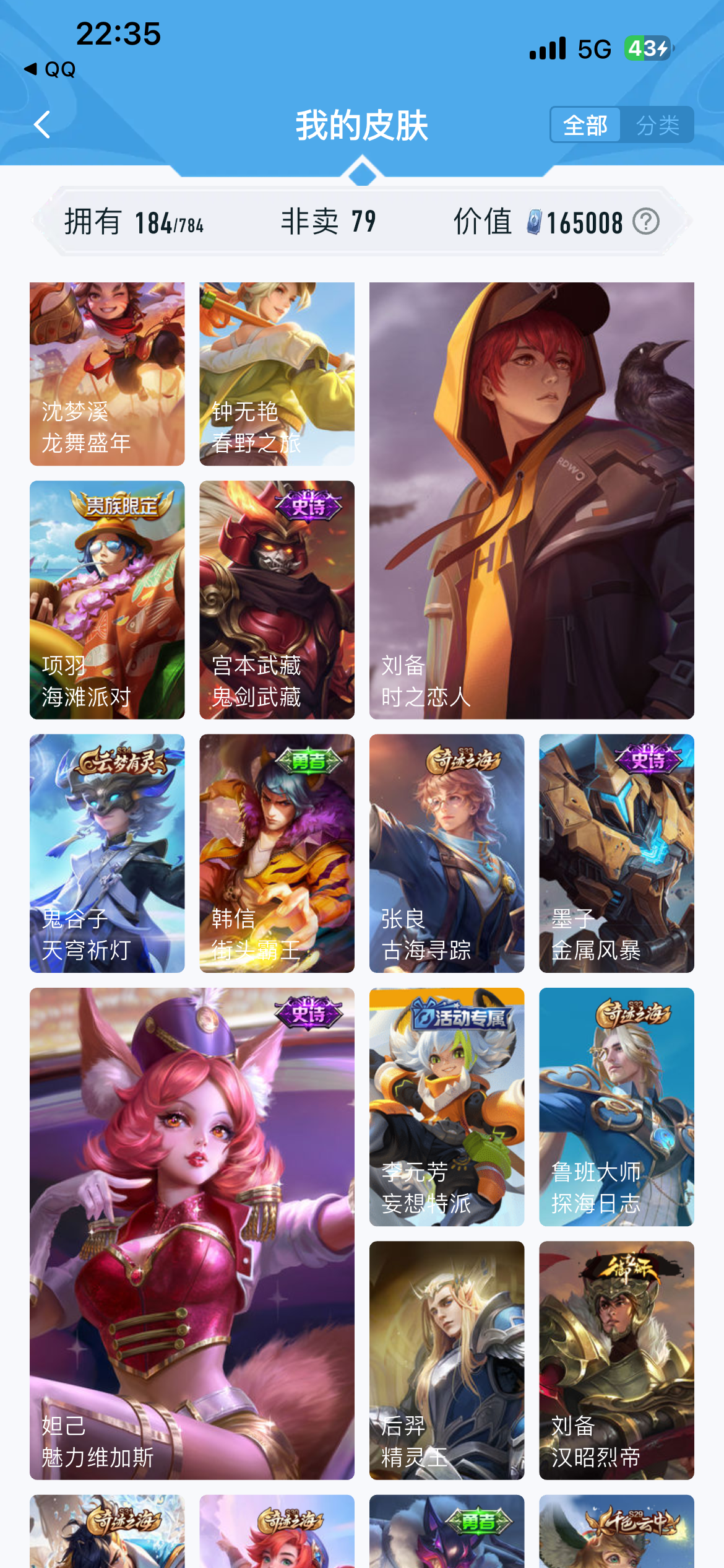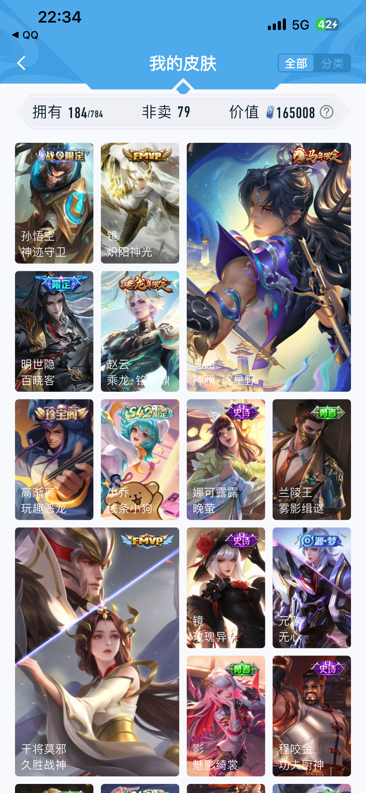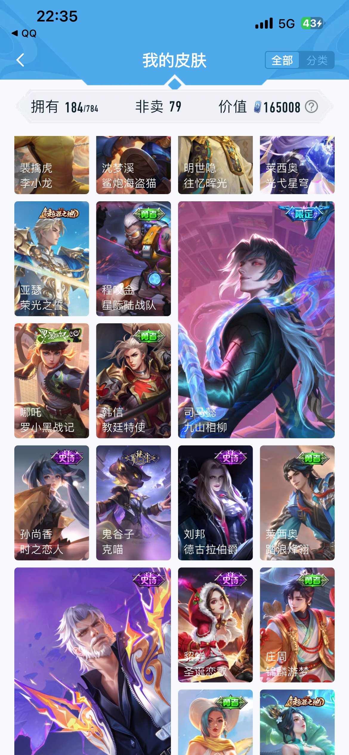 V7 皮肤184 英雄126 至尊星耀 荣耀典藏2 传说12 其他皮肤177