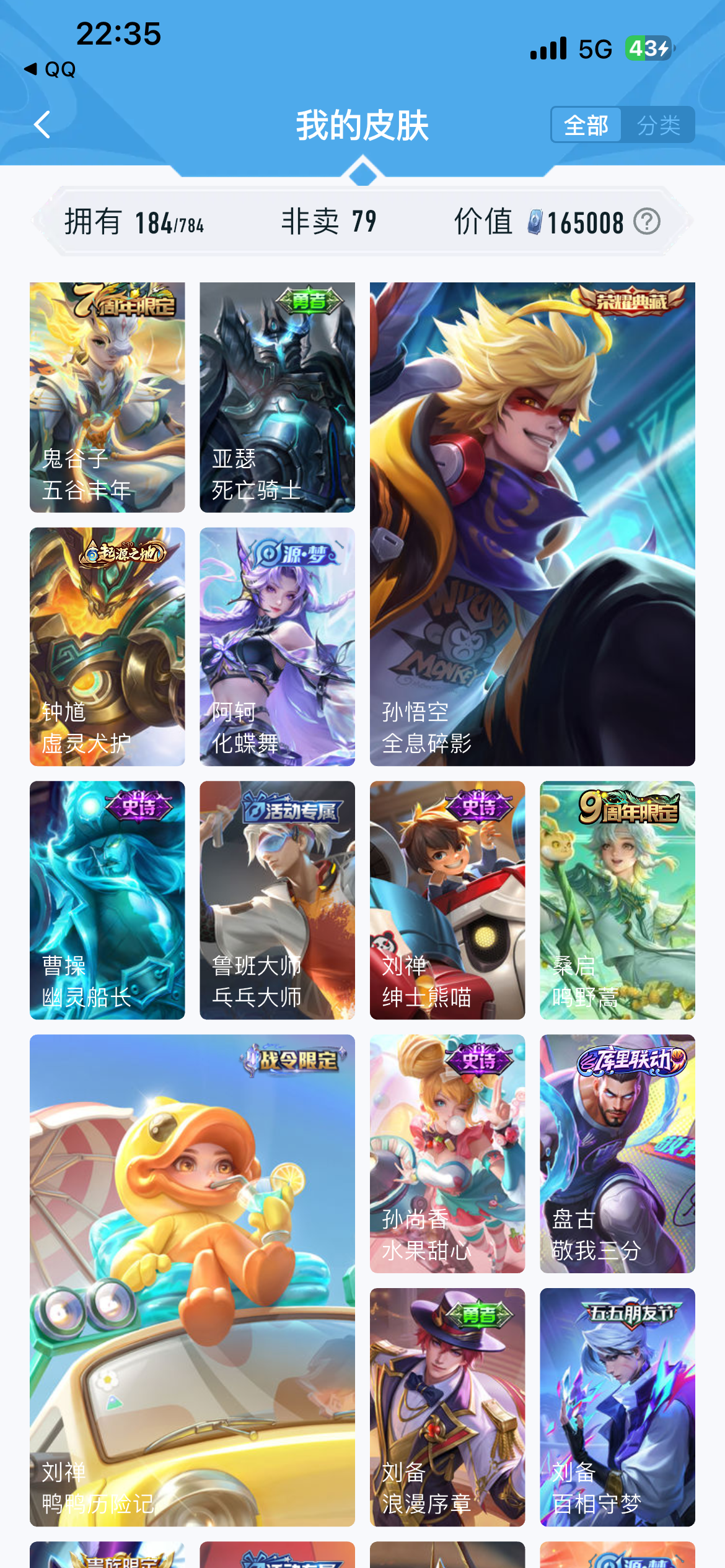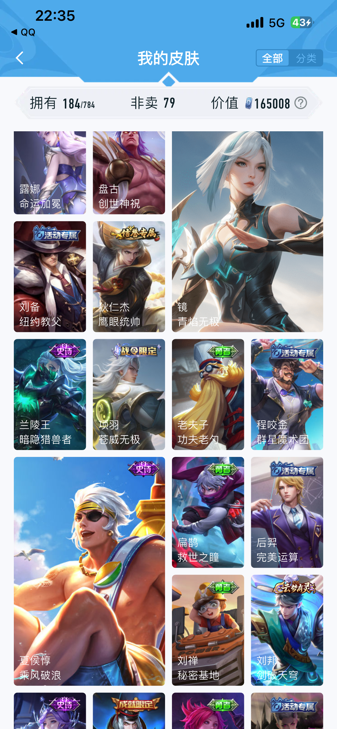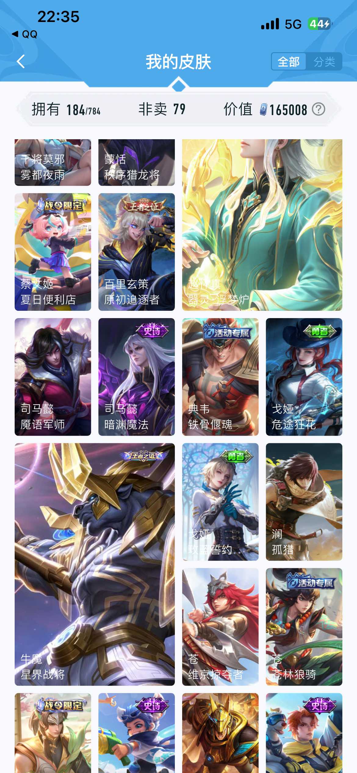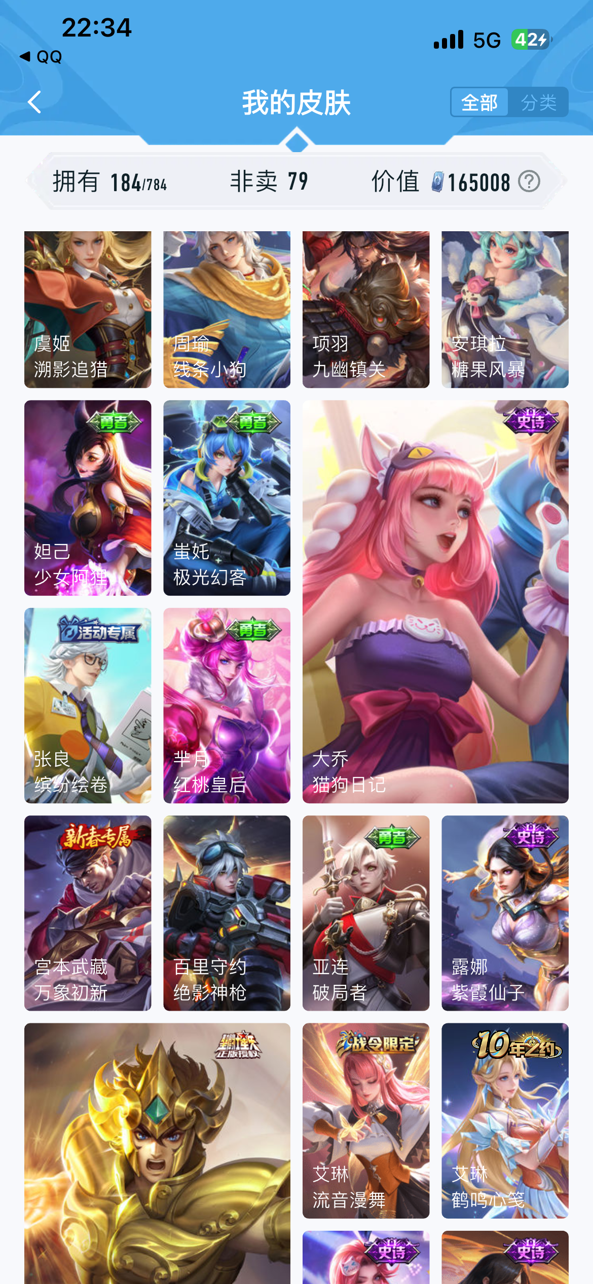 V7 皮肤184 英雄126 至尊星耀 荣耀典藏2 传说12 其他皮肤177