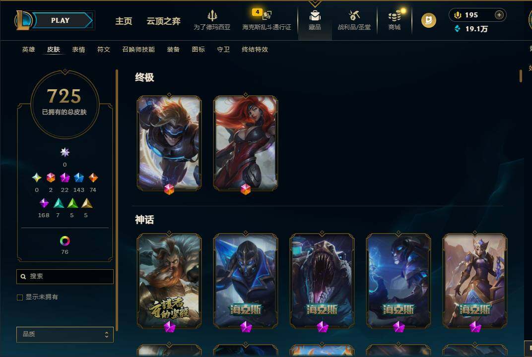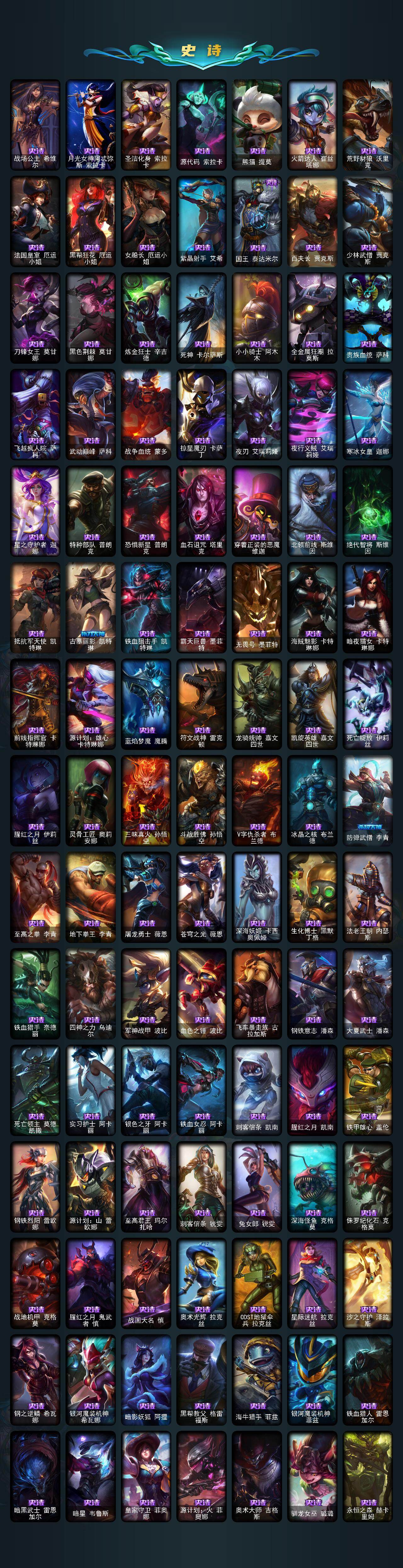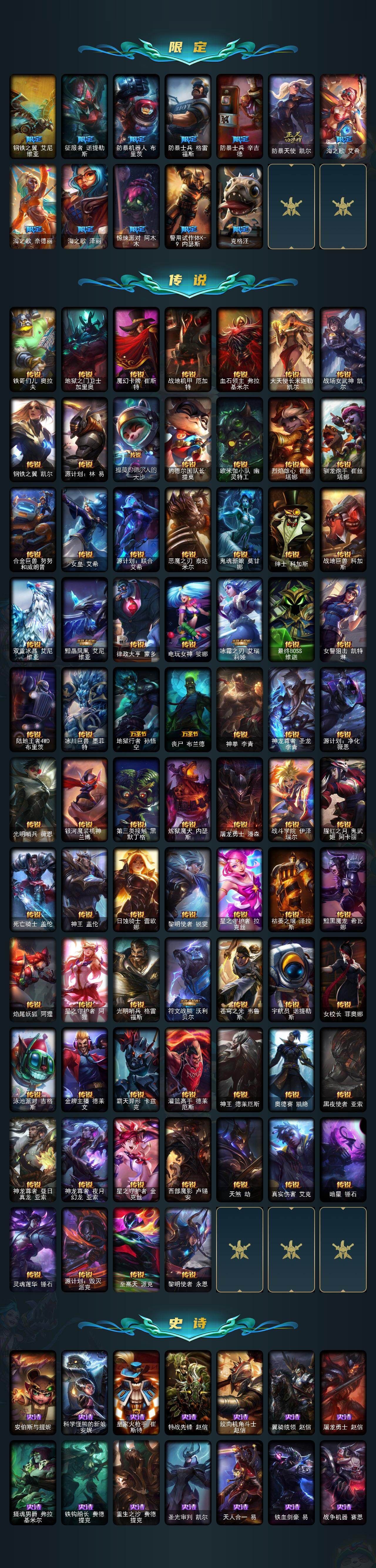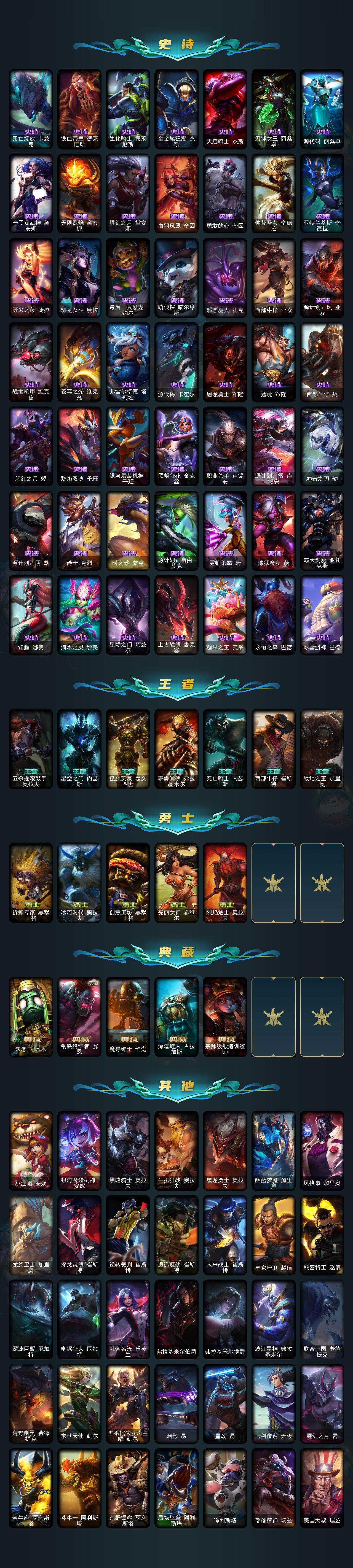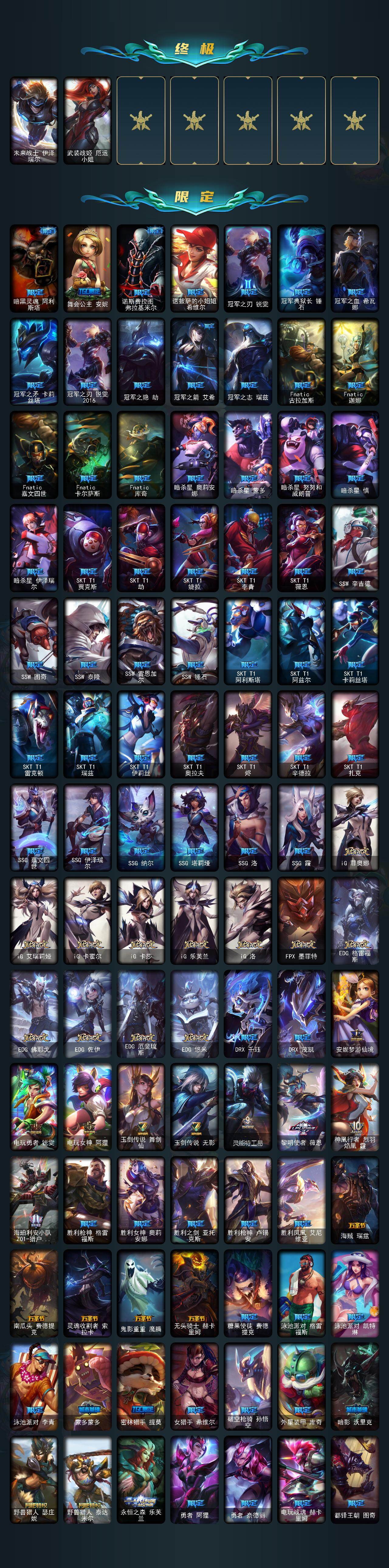 172英雄/725皮肤/2终极/22神话/143限定/3臻彩/10