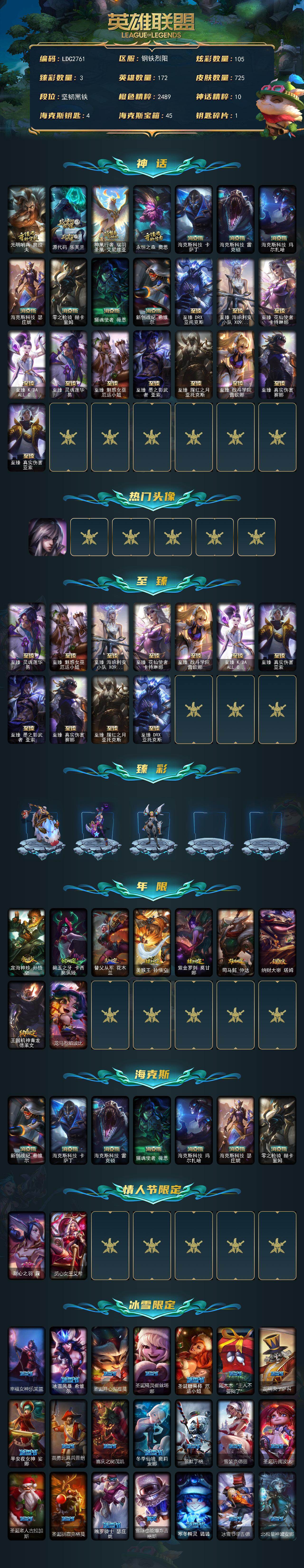 【LDC2761】172英雄/725皮肤/2终极/22神话/143限定/3臻彩/105炫彩/74传说/168史诗/未定级账号等级:538/光明哨兵奥拉夫/源代码乐芙兰/神凰行者瑞羽圣凰艾尼维亚/永恒之森奥恩/海克斯科技卡萨丁/海克斯科技雷克顿/海克斯科技玛尔扎哈/海克斯科技瑟庄妮/零之枪骑赫卡里姆/摄魂使者薇恩/新创战纪希维尔/至臻真实伤害赛娜/至臻真实伤害亚索/至臻DRX亚托克斯/至臻海珀利安小队X09星环灵风迦娜/至臻花仙使者卡特琳娜/至臻KDAALLOUT卡莎/至臻灵魂莲华易/至臻魅惑女巫