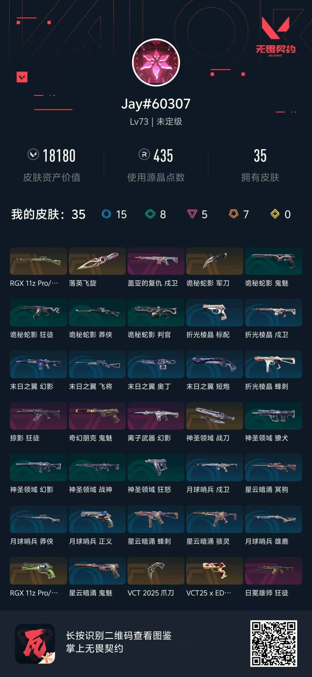 7橙皮 5紫皮 35皮肤 18英雄 55卡面 435已用源晶 未