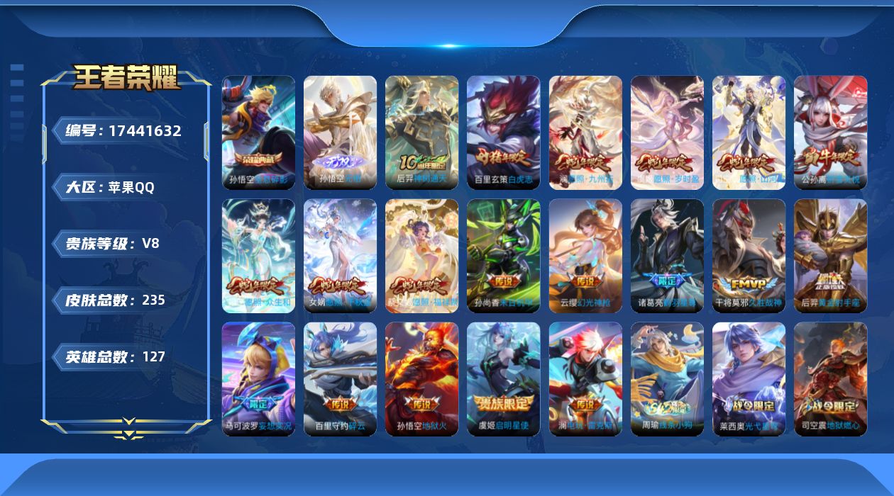 584-[17441632]贵族8-235皮-1典藏-1无双-19传说-1全皮-改名卡5-星传说幽冥火-未来机甲苹果手Q14区235皮1典藏19传说1无双V8 营地ID2140247681最强王者【无双皮肤】:无相【荣耀典藏】:全息碎影【优质限定皮肤】:祈雪灵祝,白虎志【传说皮肤】:地狱火,久胜战神,神树通天,祈雪灵祝,碎云,幻光神枪,愿照·福禄聚,愿照·山河定,愿照·九州拓,愿照·千秋盛,愿照·岁时盈,愿照·众生和,妄想实况,启明星使,鹤羽星尊,电玩·雷克斯,黄金射手座,白虎志,末日机甲【史诗