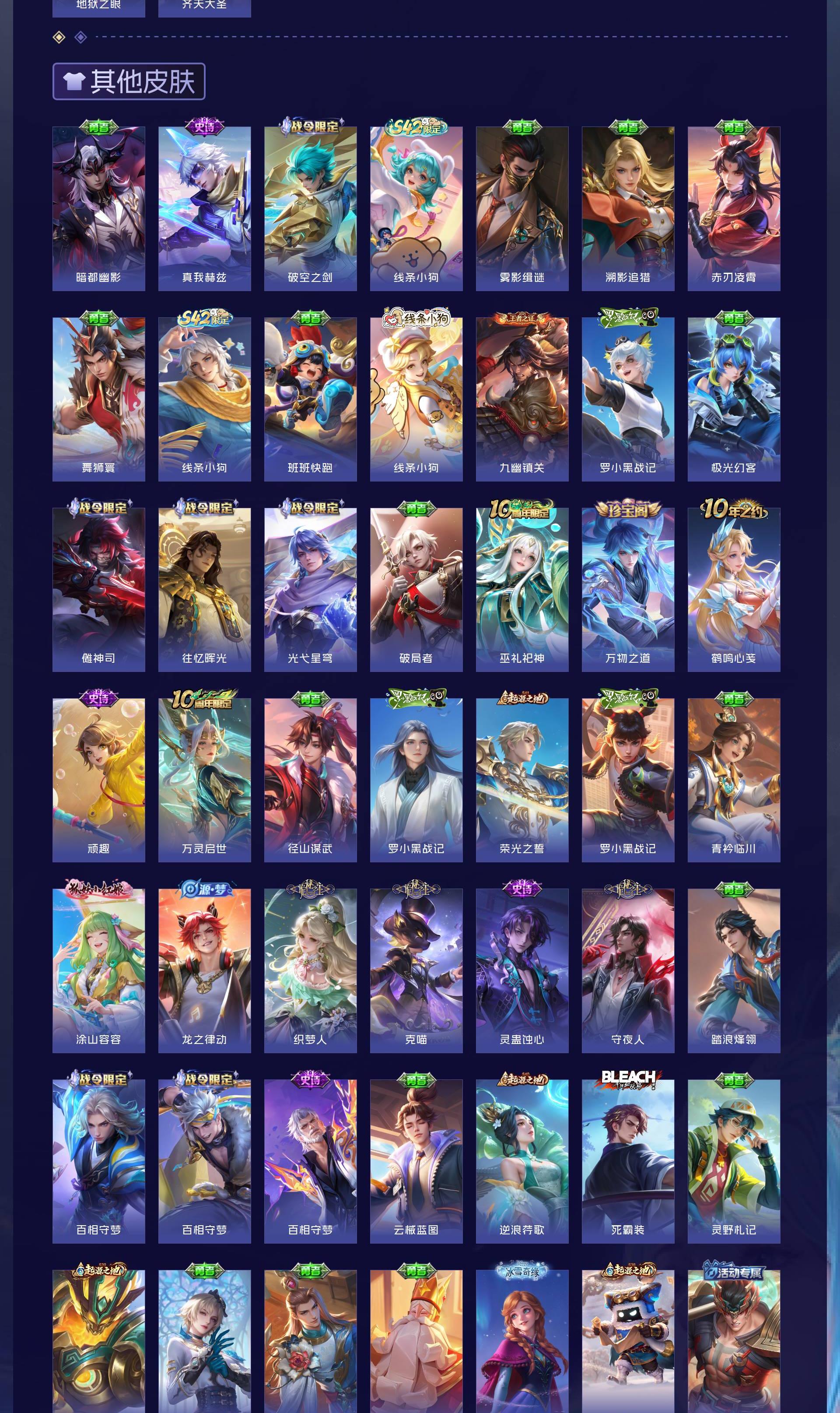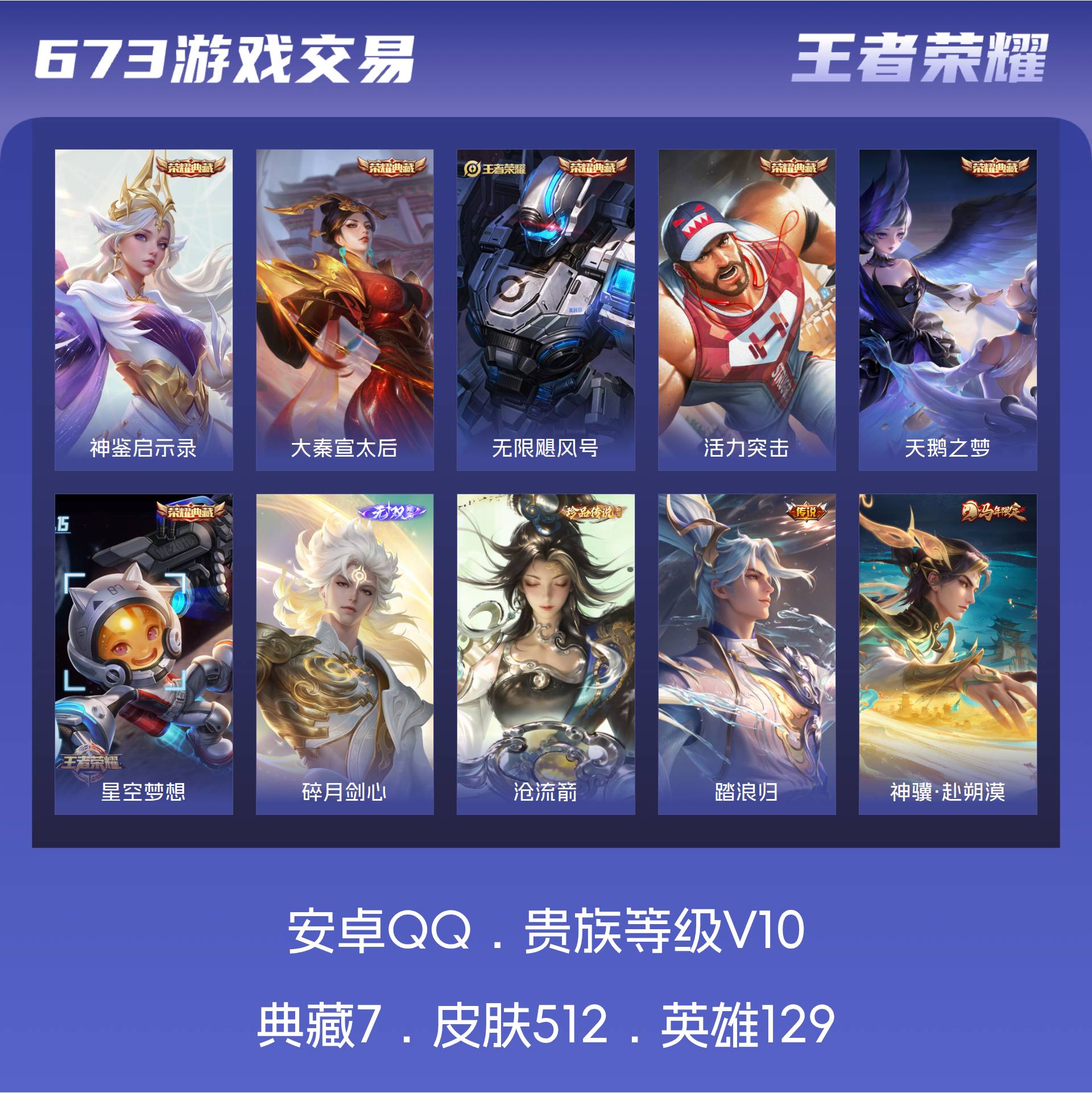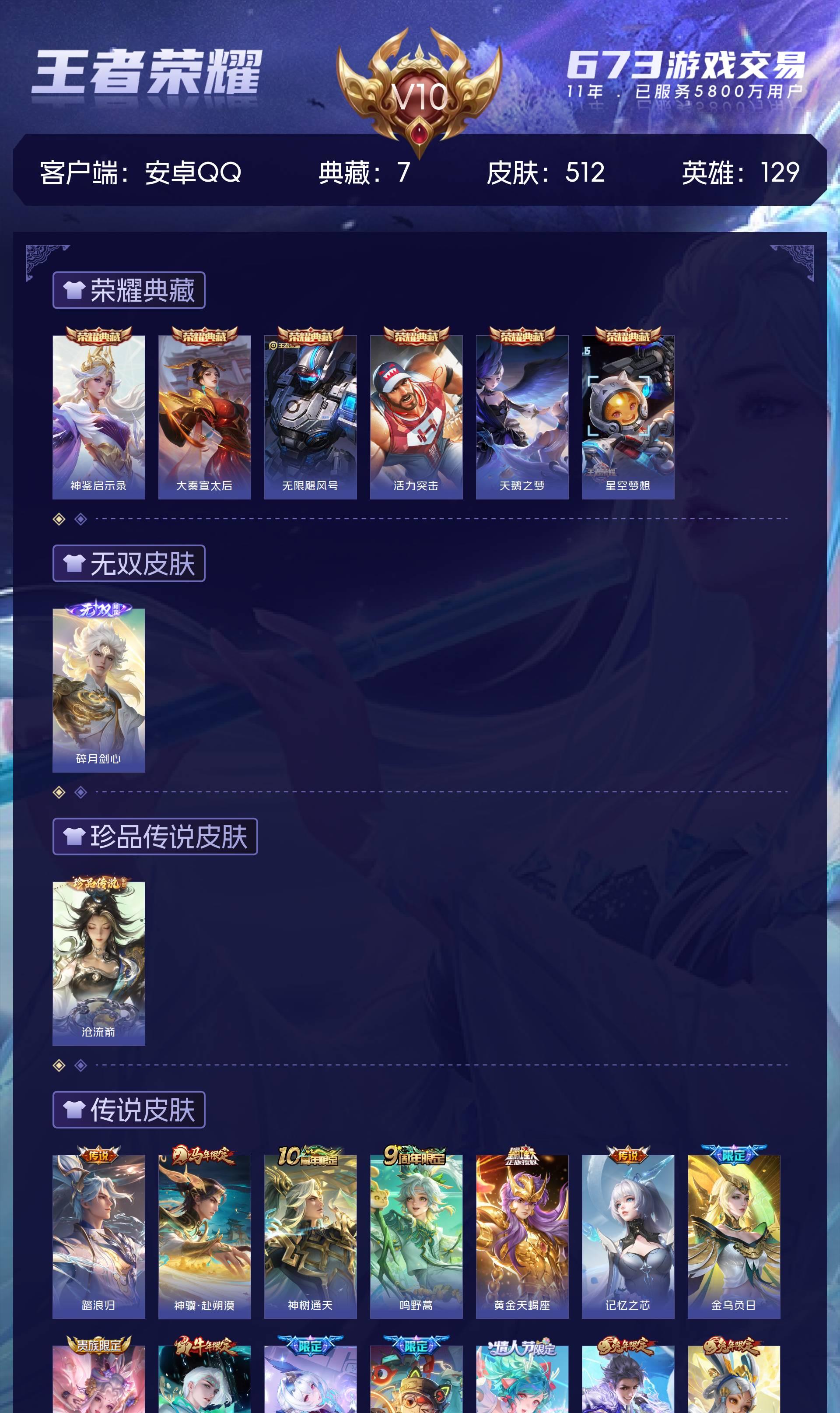 V10 皮肤512 英雄129 无双王者 荣耀典藏7 无双皮肤1 珍品传说1 传说59 其他皮肤452