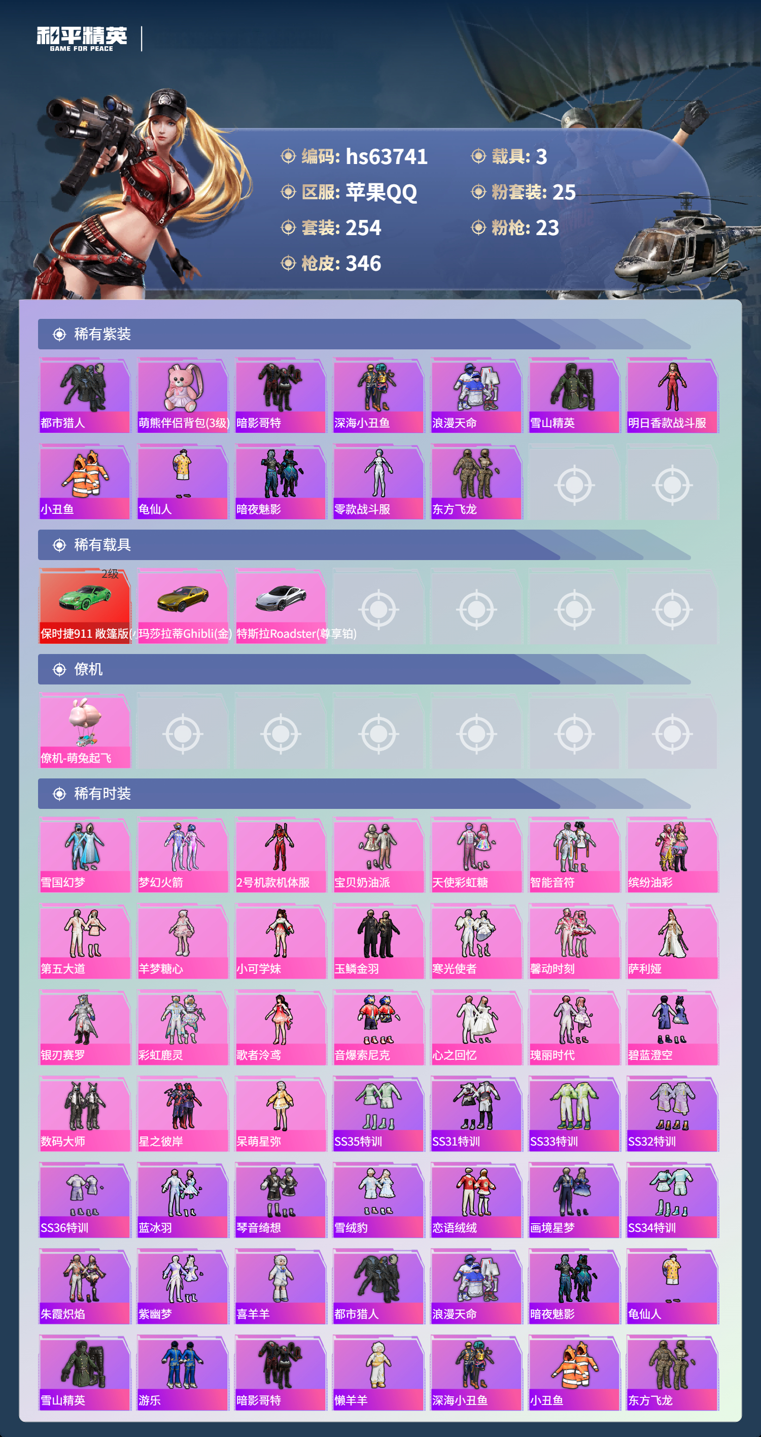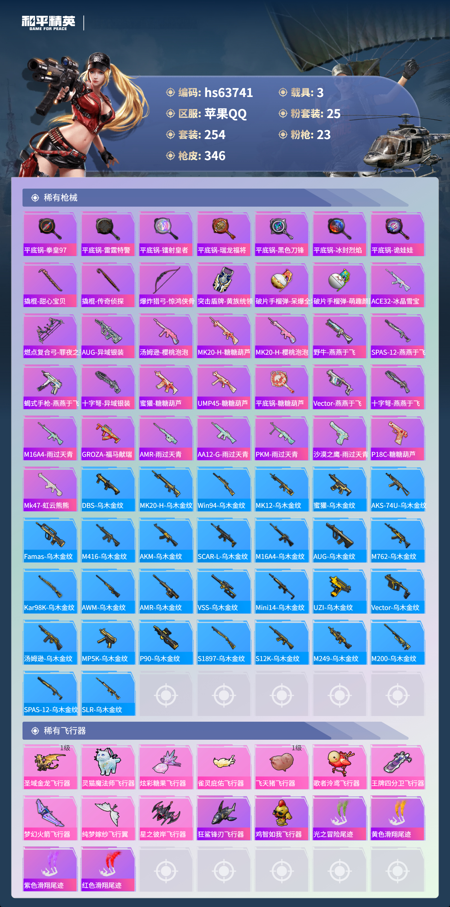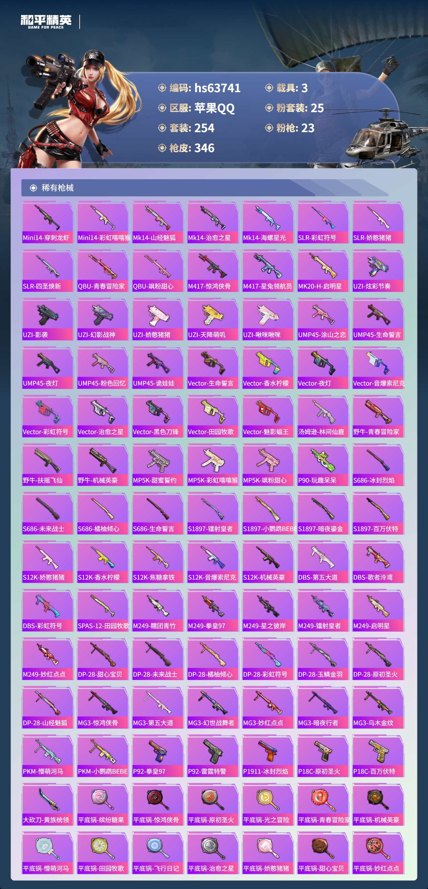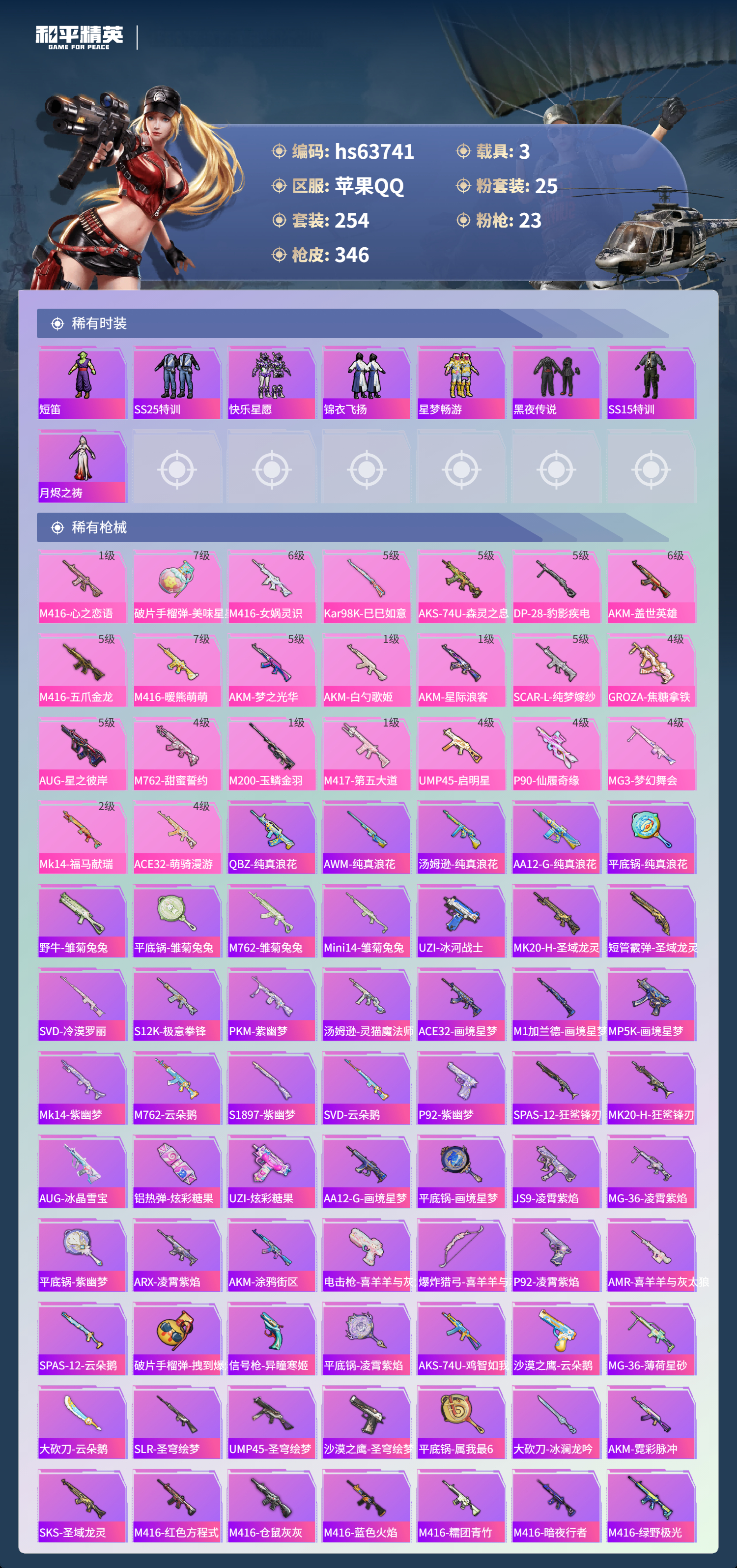hs63741 苹果手Q-25王牌印记-有战神框-25粉装-23特效枪-3载具-热力值-254套装-346枪皮-3卓越印记-1传奇印记