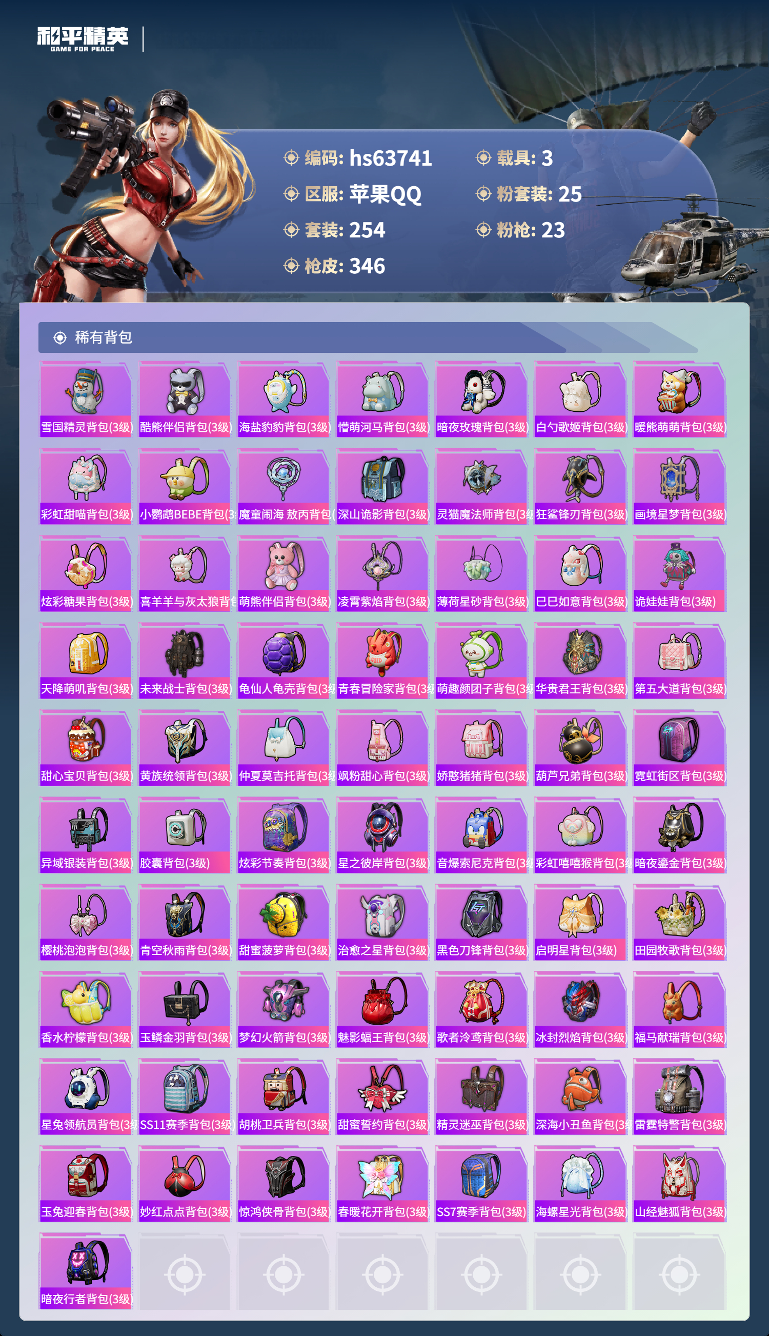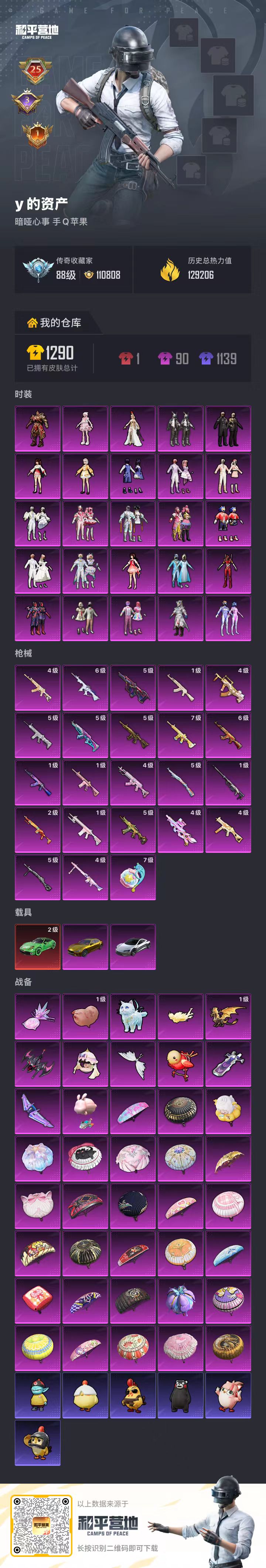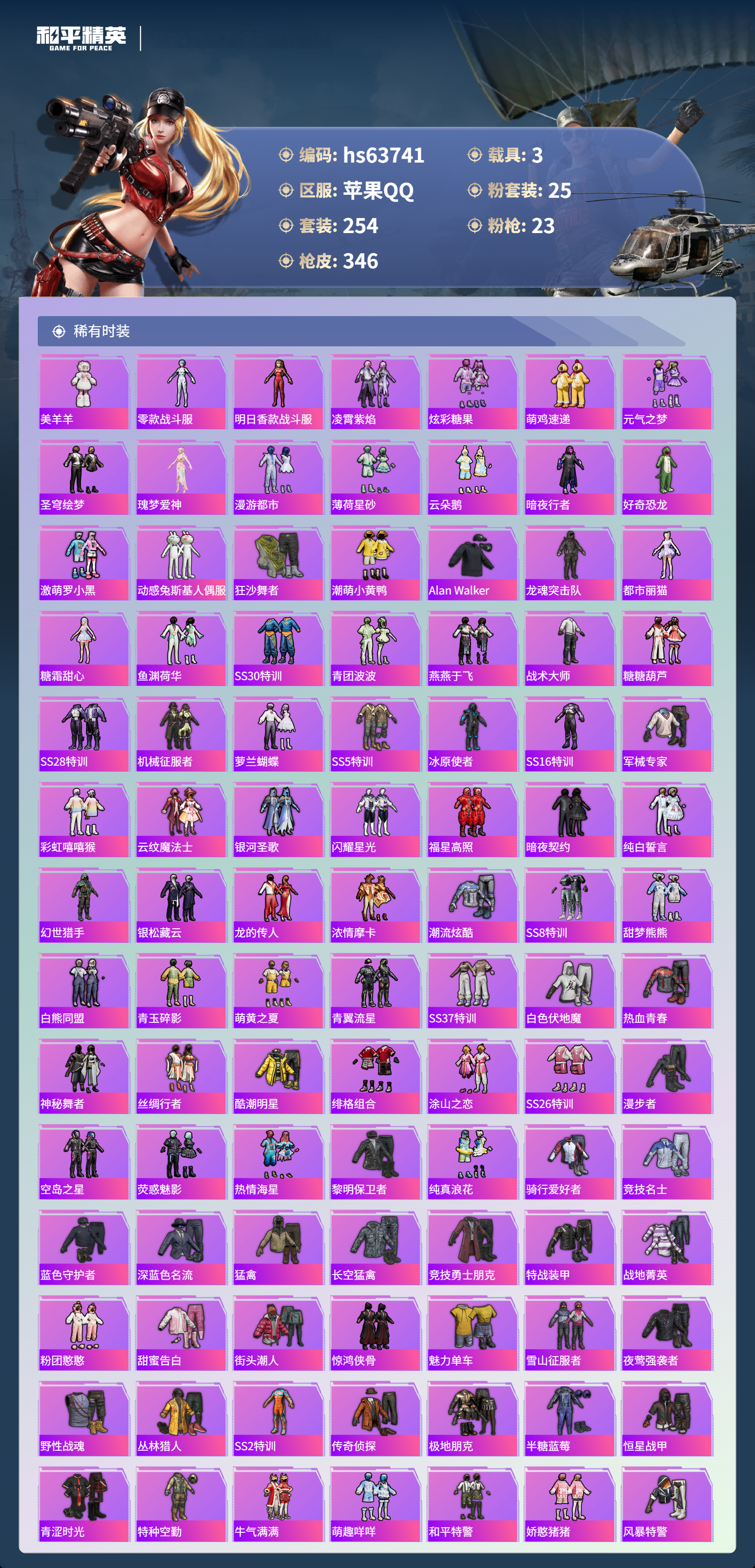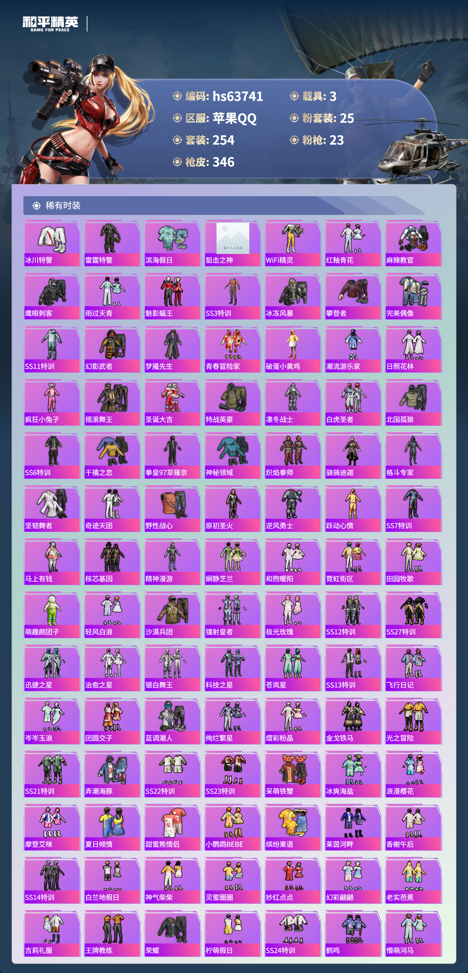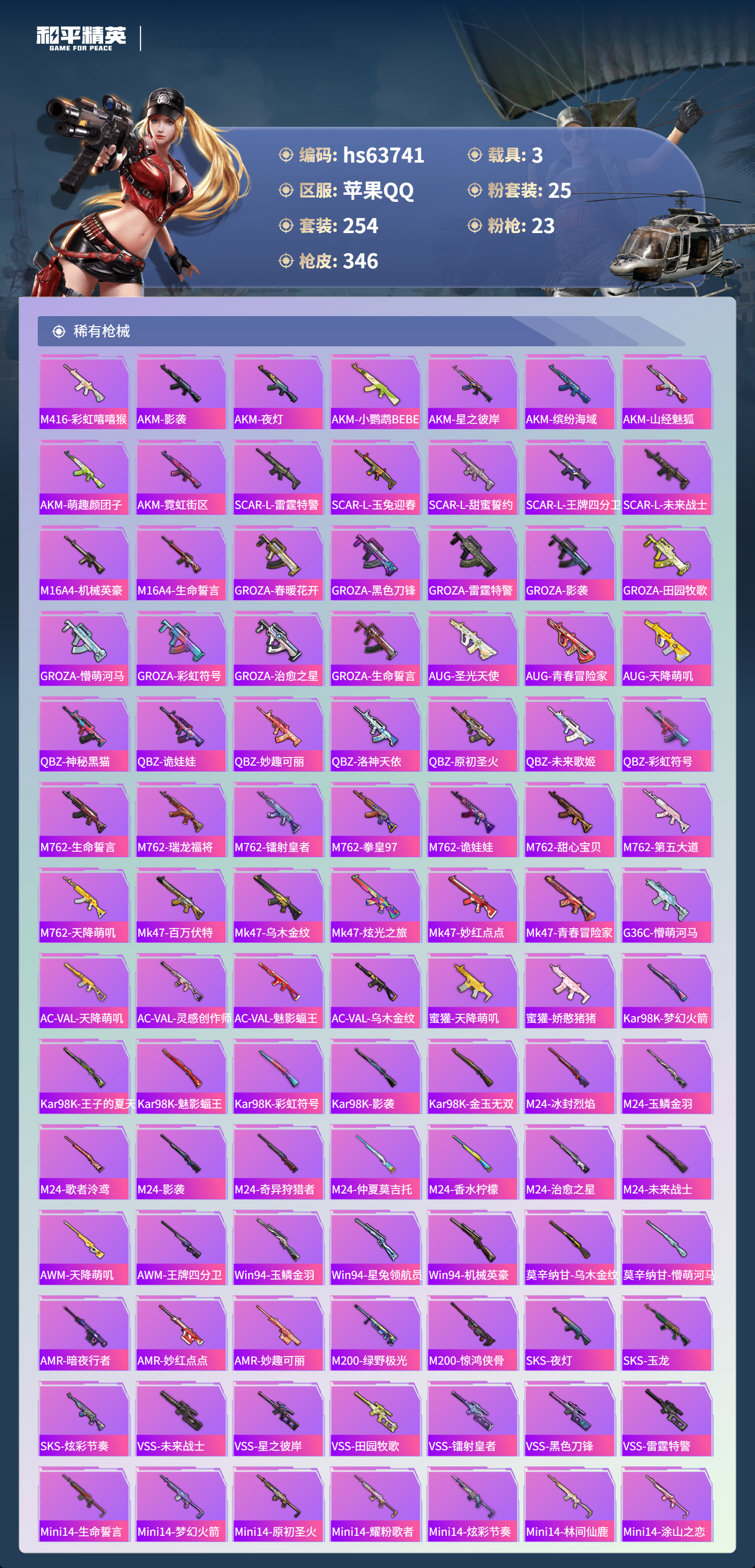 hs63741 苹果手Q-25王牌印记-有战神框-25粉装-23特效枪-3载具-热力值-254套装-346枪皮-3卓越印记-1传奇印记