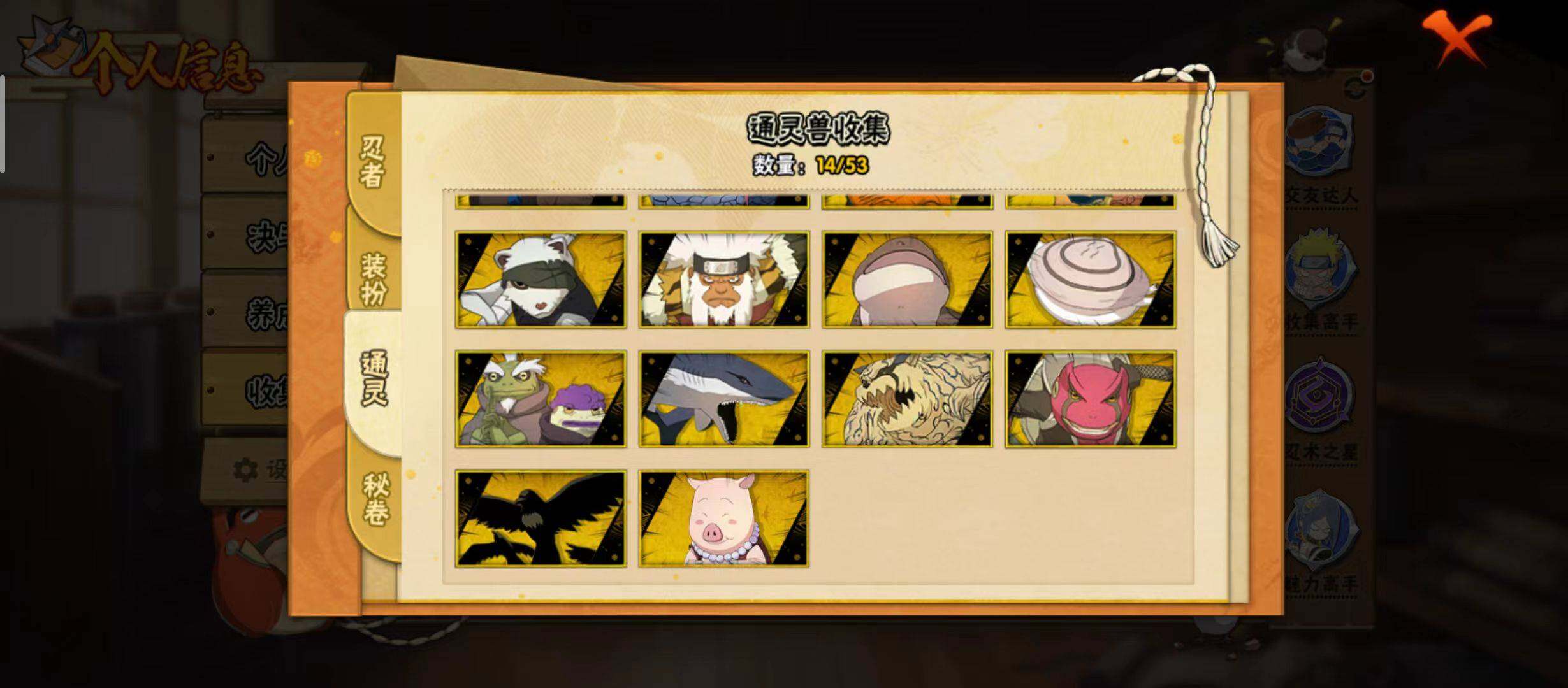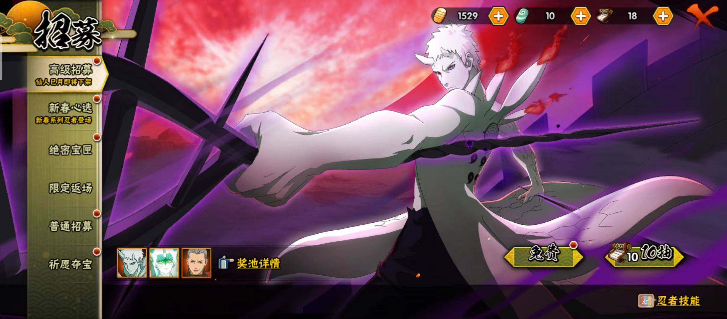 【S级忍者】:千手柱间「秽土转生」(3星),宇智波鼬「须佐能乎」(3星),自来也「舞之豪杰」(3星),大蛇丸(3星),药师兜「仙人模式」(3星),佩恩「天道」(3星),漩涡鸣人·宇智波佐助(3星)