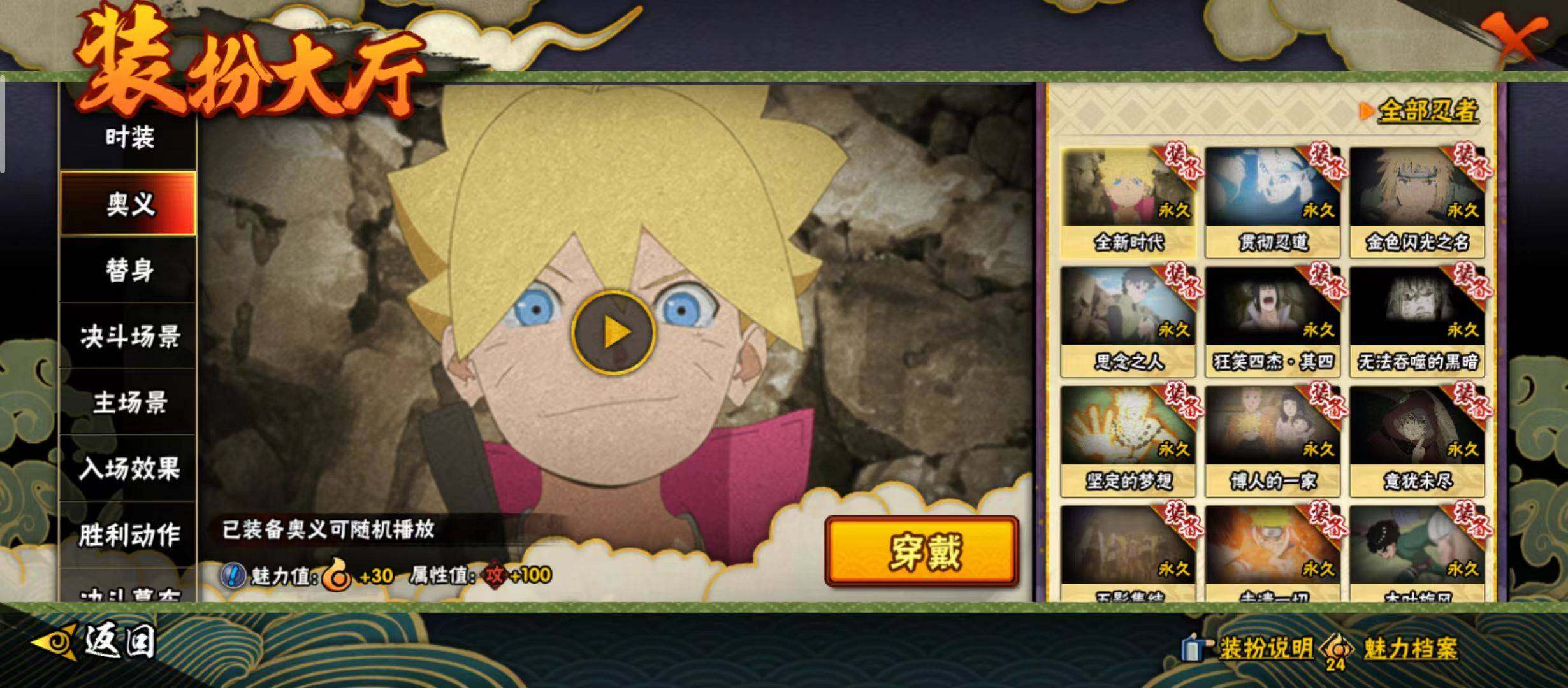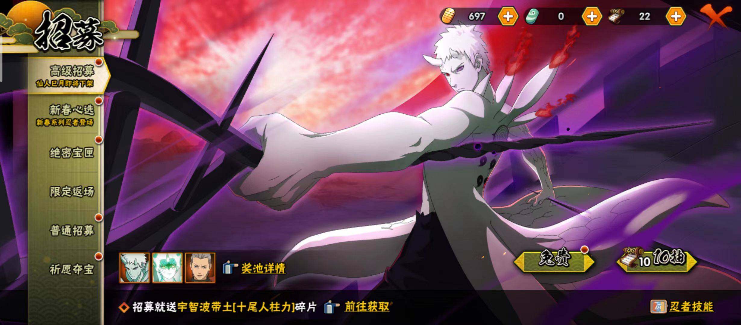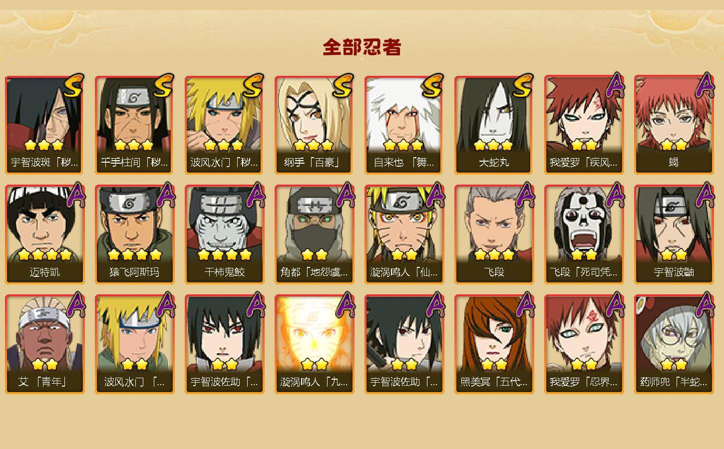 【S级忍者】:波风水门「秽土转生」(3星),千手柱间「秽土转生」(3星),宇智波斑「秽土转生」(3星),自来也「舞之豪杰」(3星),大蛇丸(3星),纲手「百豪」(3星)