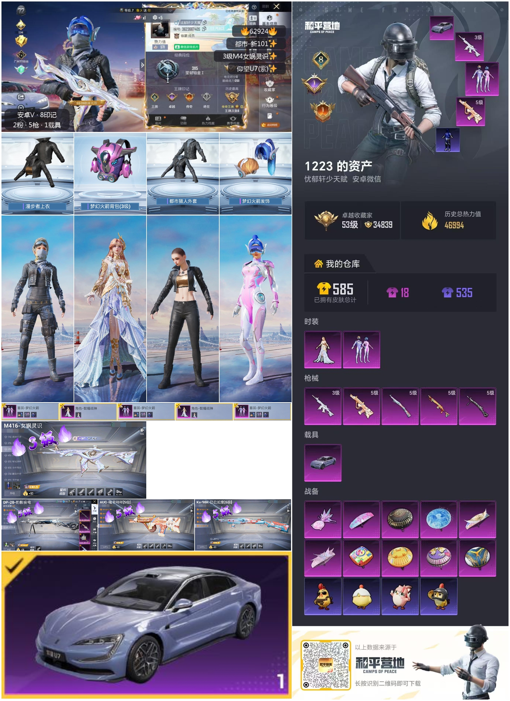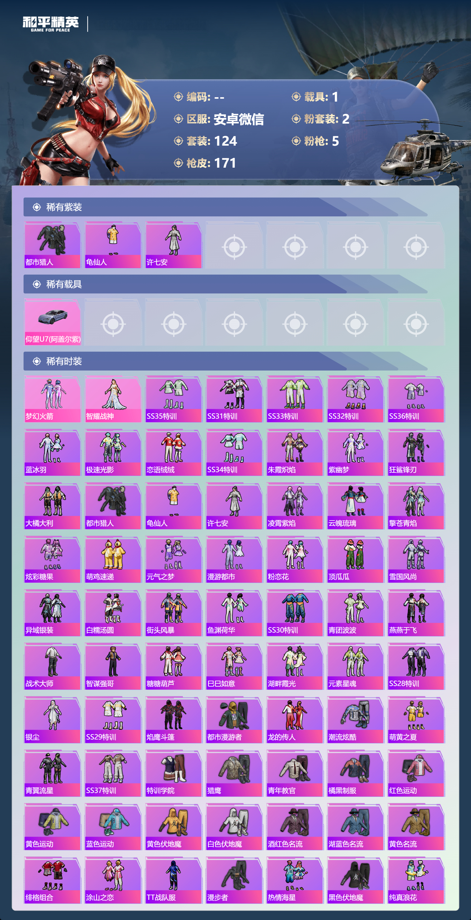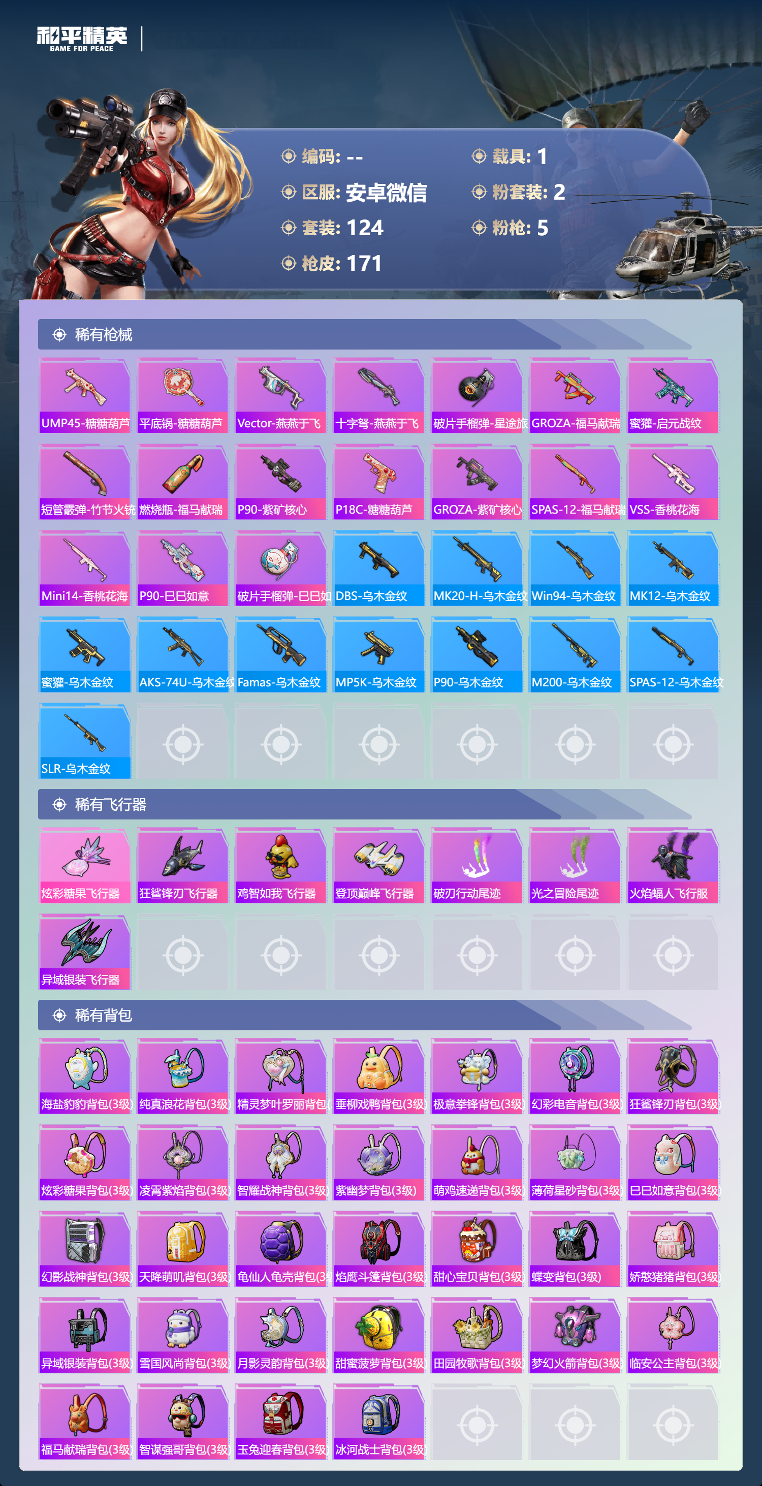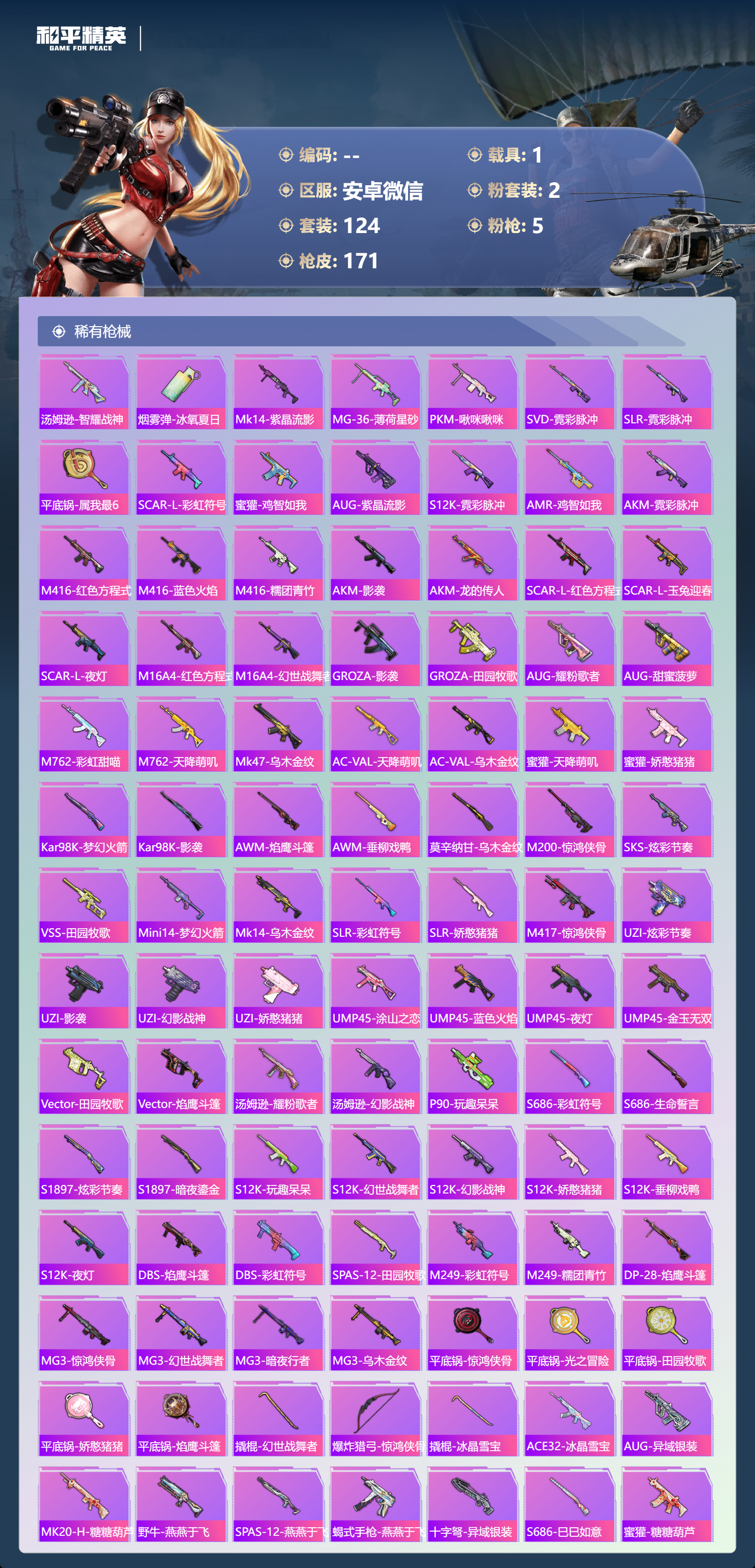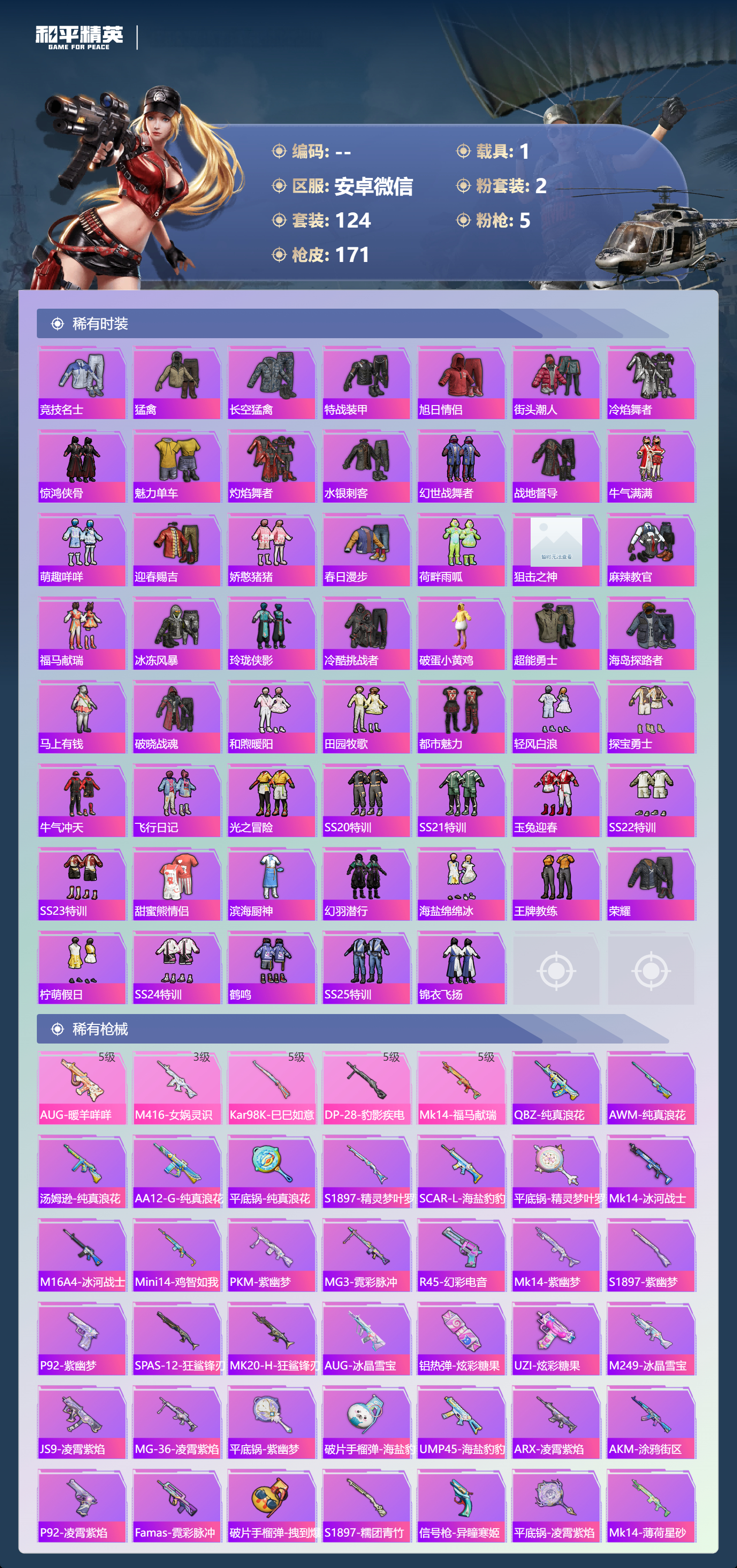 hs62924 安卓微信-8王牌印记-2粉装-5特效枪-1载具-47042热力值-124套装-171枪皮-1卓越印记-1传奇印记
